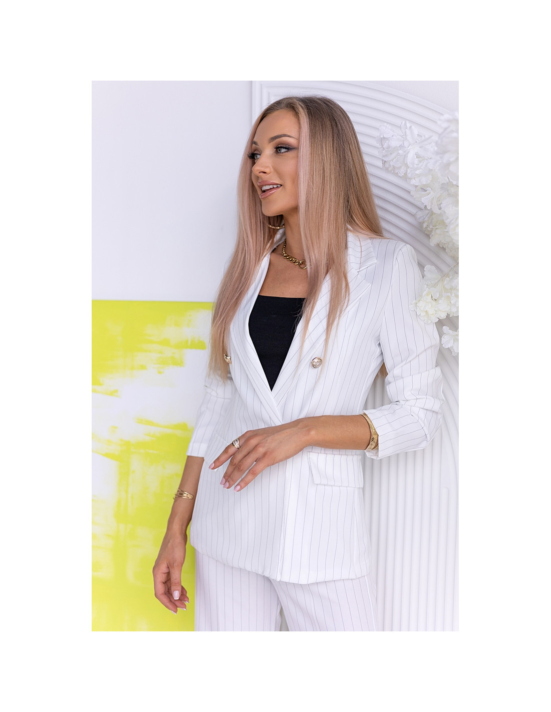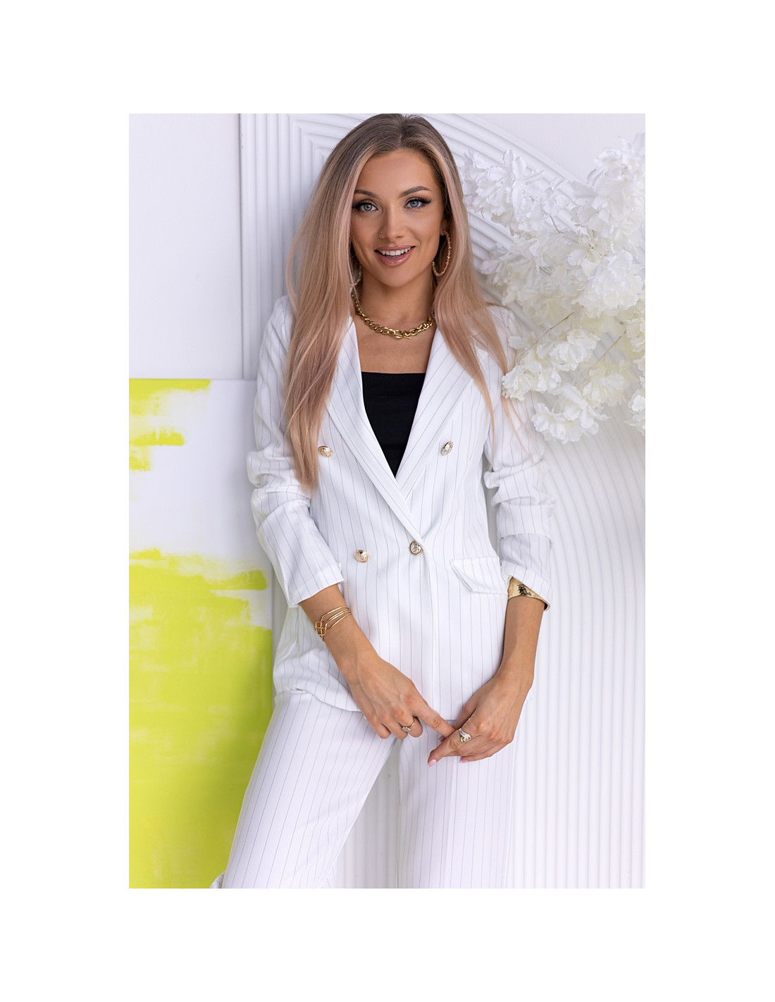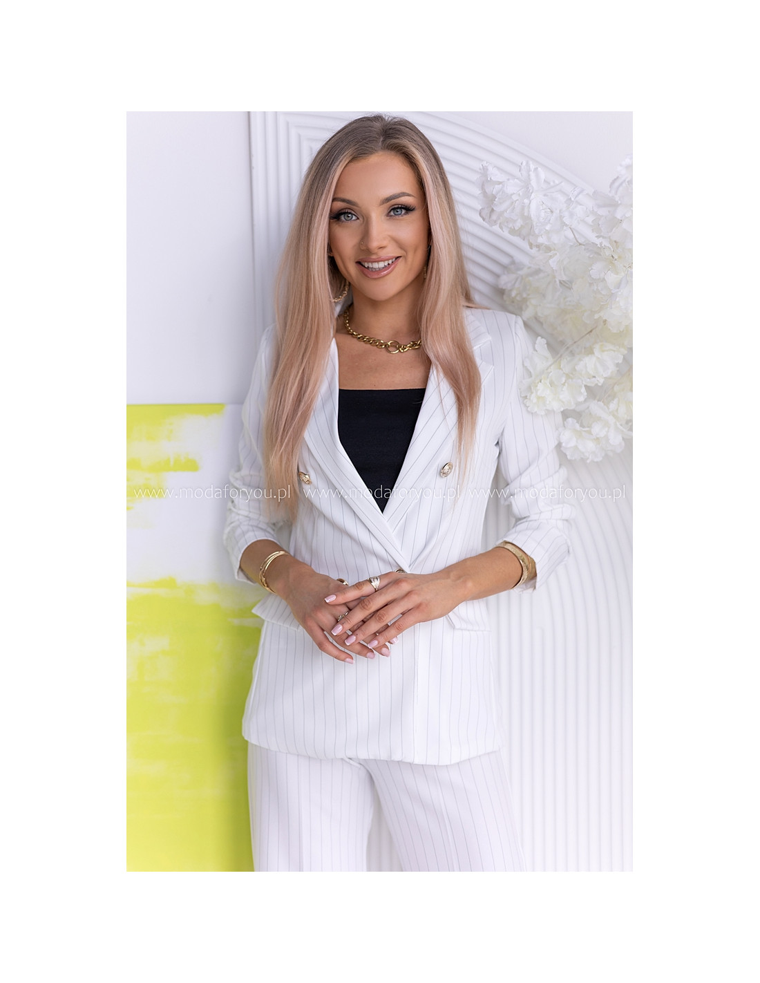 Przedłużona marynarka w cienkie paseczki . Posiada ozdobne- złote guziki. Zapinana na dwa guziki w tym jeden od środka.