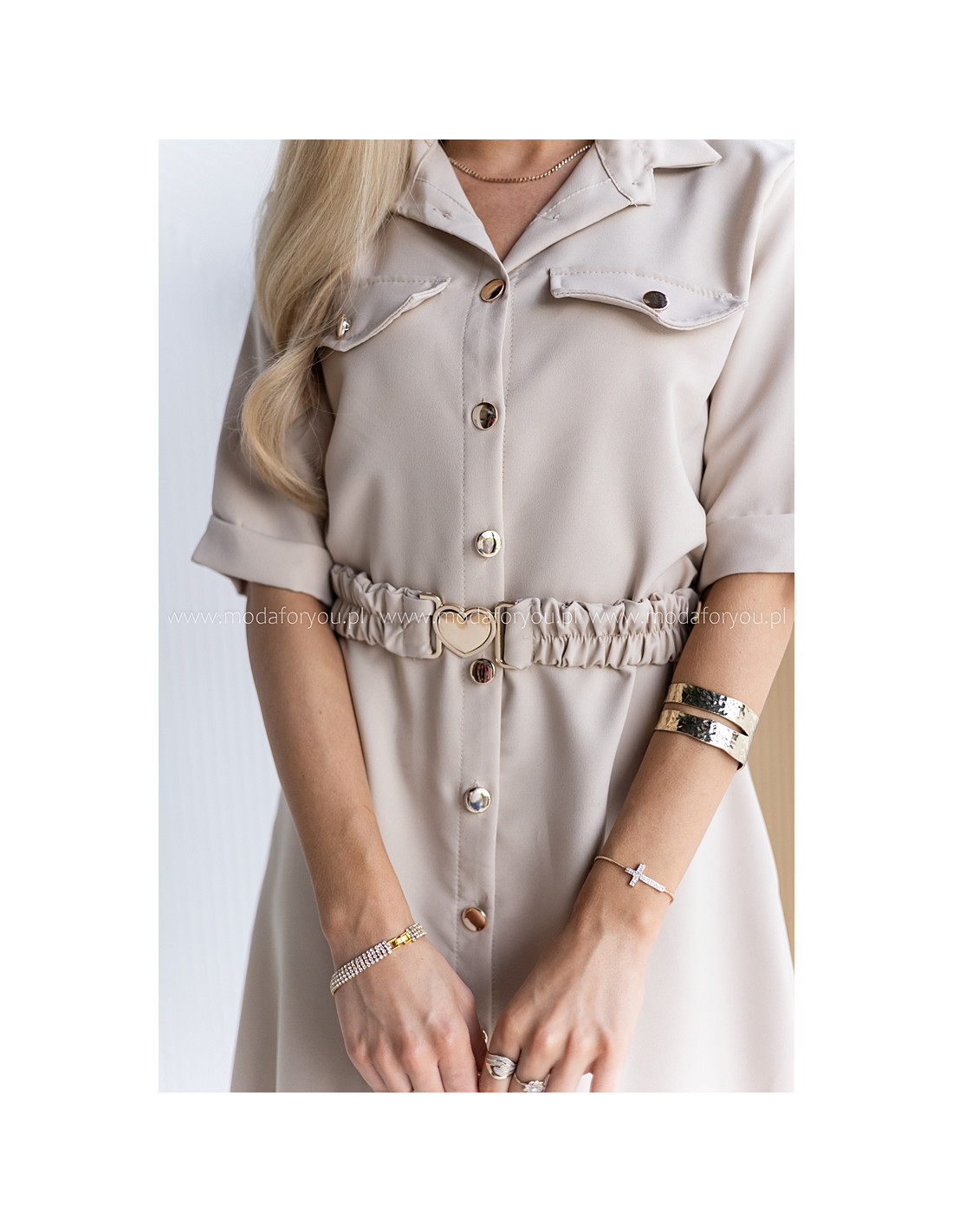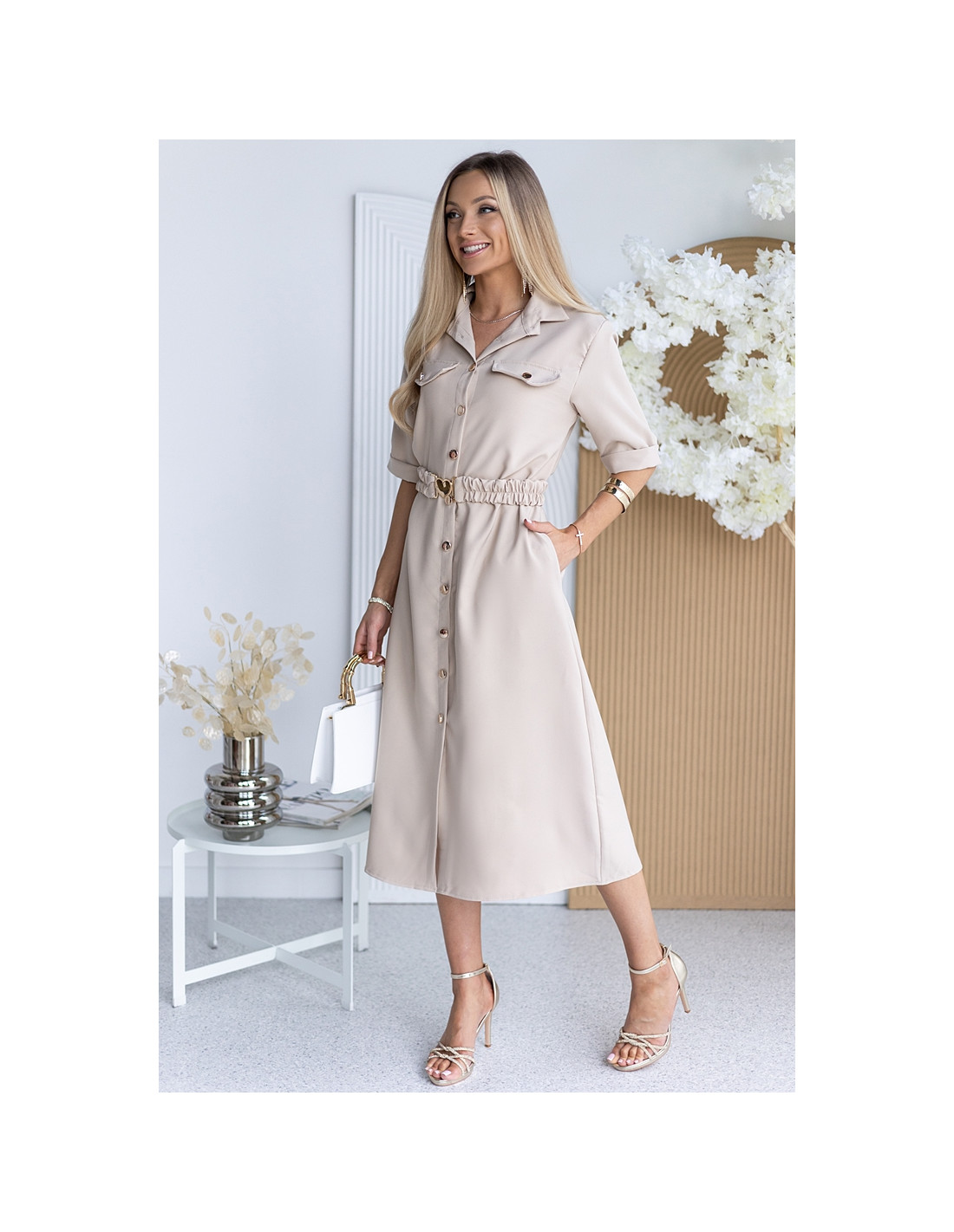 W pasie pasek na gumie ze złotą sprzączką. Posiada kieszenie.