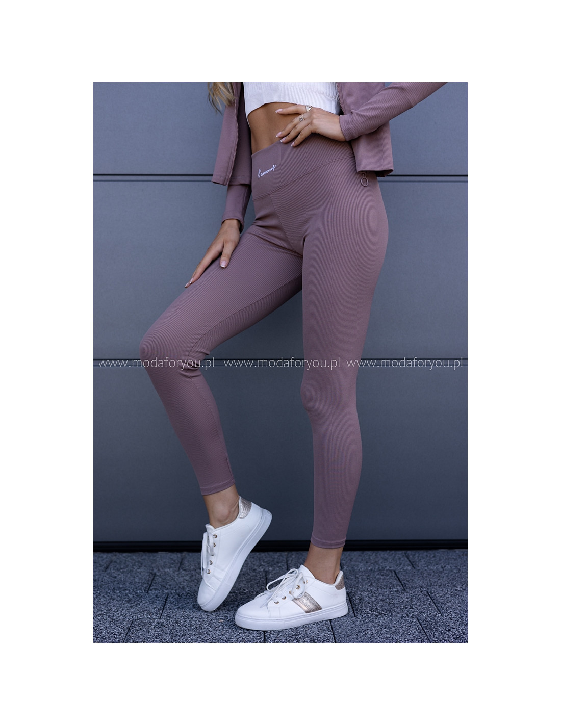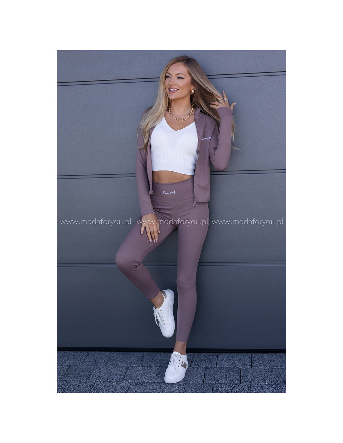 Dopasowany komplet z prążkowanego materiału , składający się z bluzy na zamek i leginsów z wysokim stanem. Materiał bardzo dobrze się ciągnie. Postaw na wygodę!