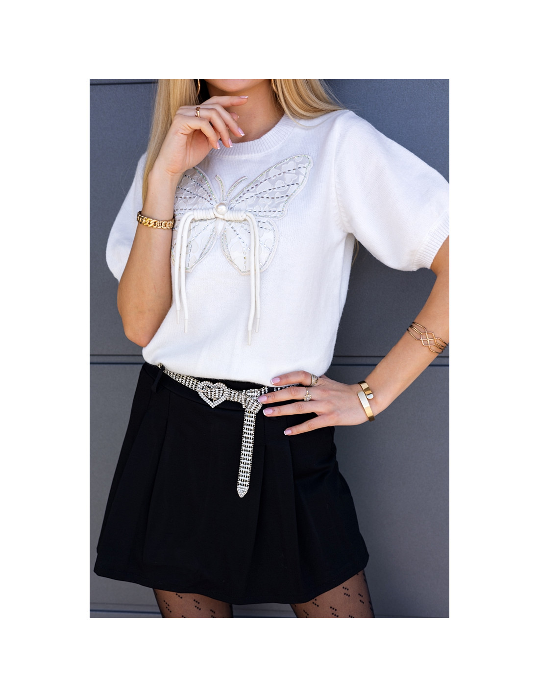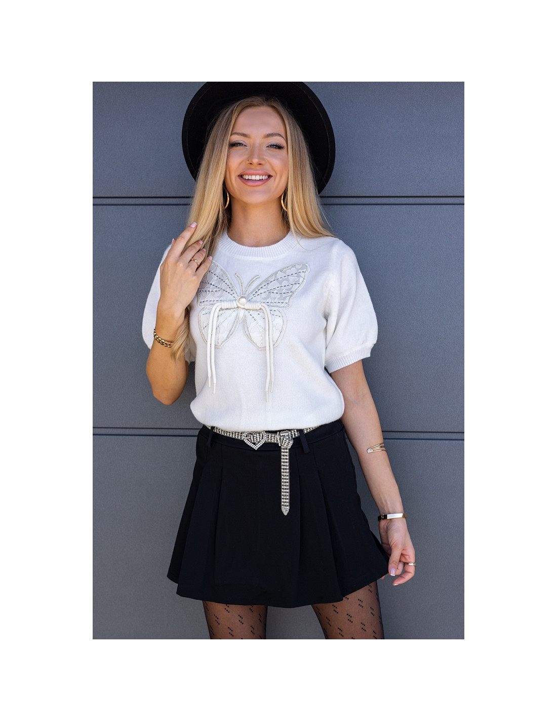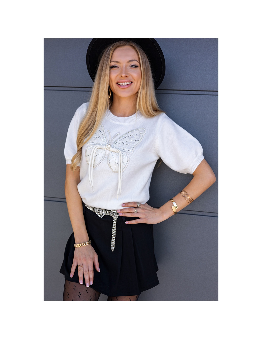Śliczny Sweterek z krótkim, bufiastym rękawkiem. Na przodzie naszyty motyl z cyrkoniami.
