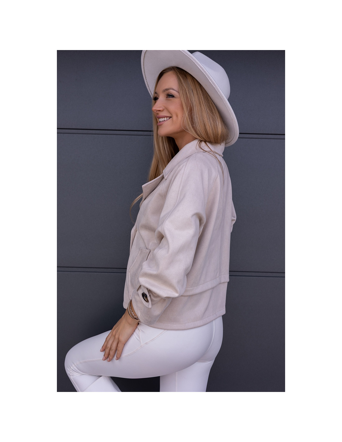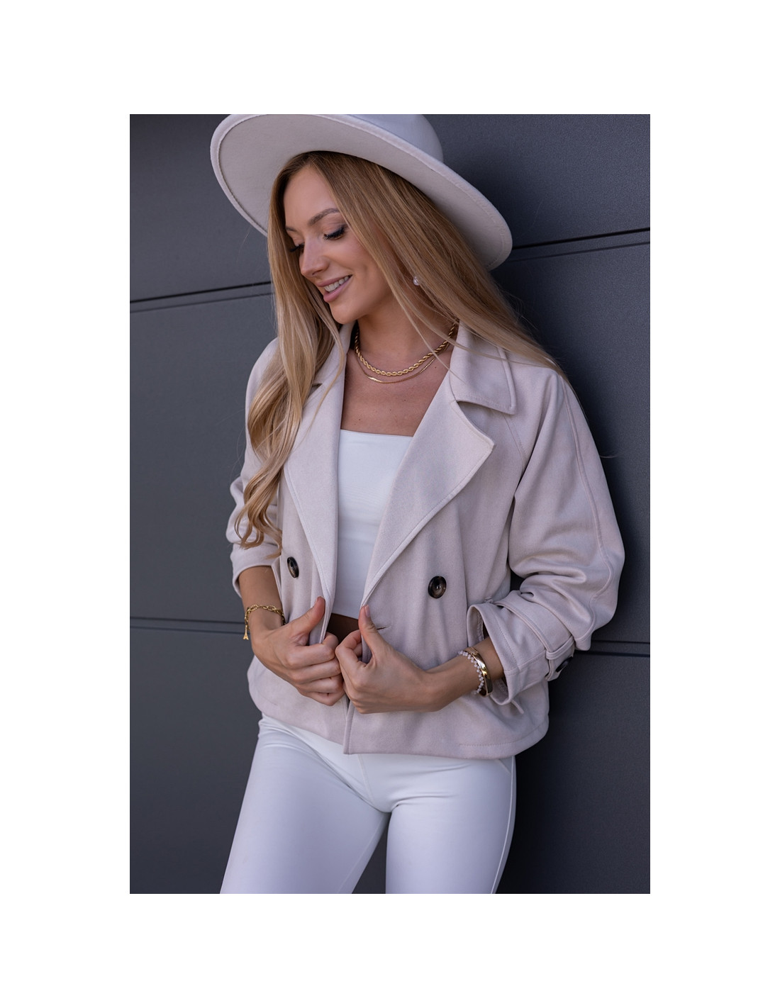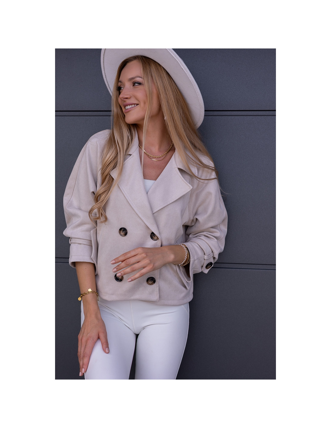 Żakietowa kurtka z zamszu, luźny oversizowy model. Zapinany na dwurzędowe guziki. Rękawki obniżane, posiada kieszonki.