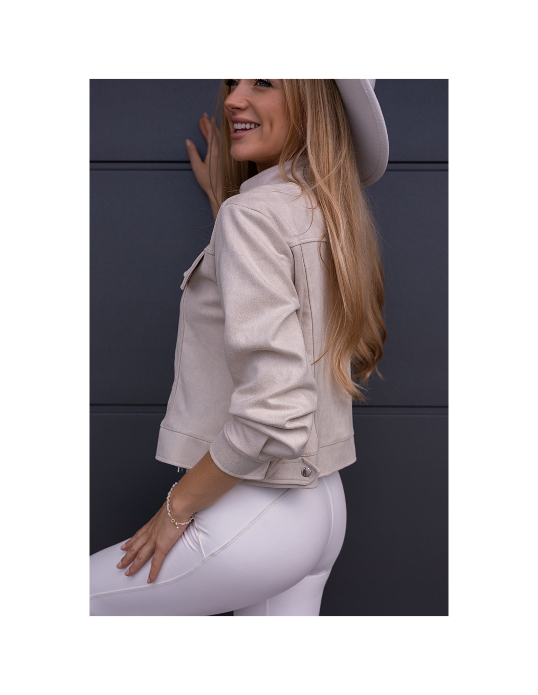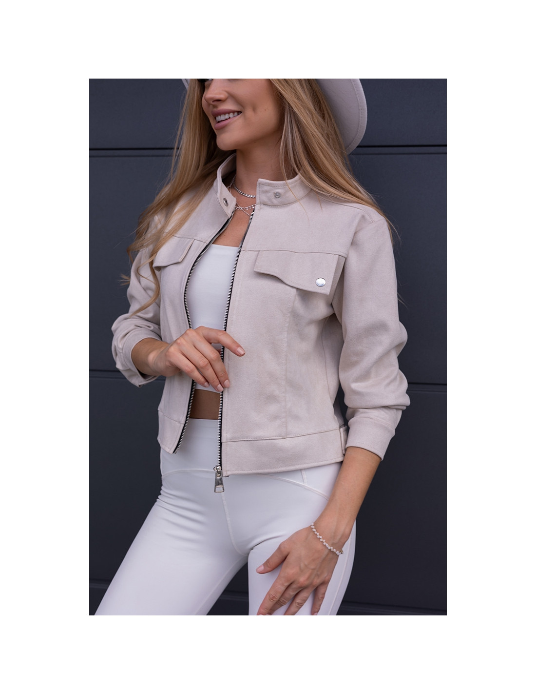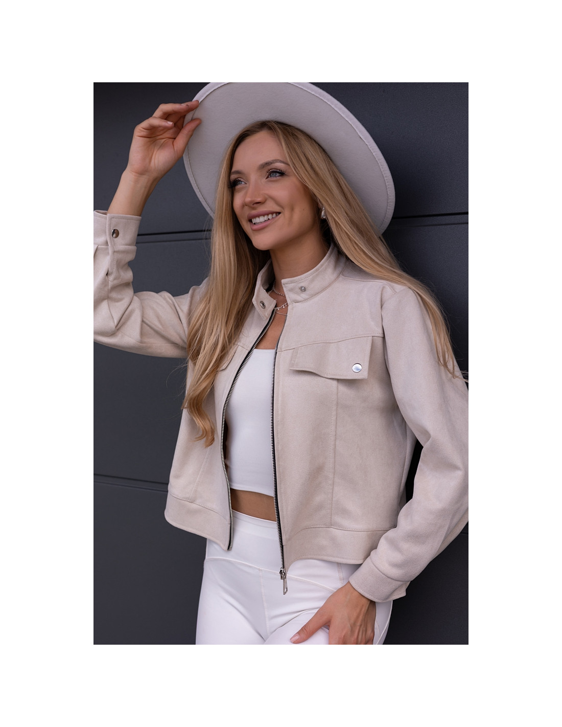 Kurtka zamszowa zasuwana na srebrny zamek, posiada stójkę zapinaną na srebrne napy. Rękawki zakończone mankietami z zapięciami. Kurtka nie posiada podszewki.