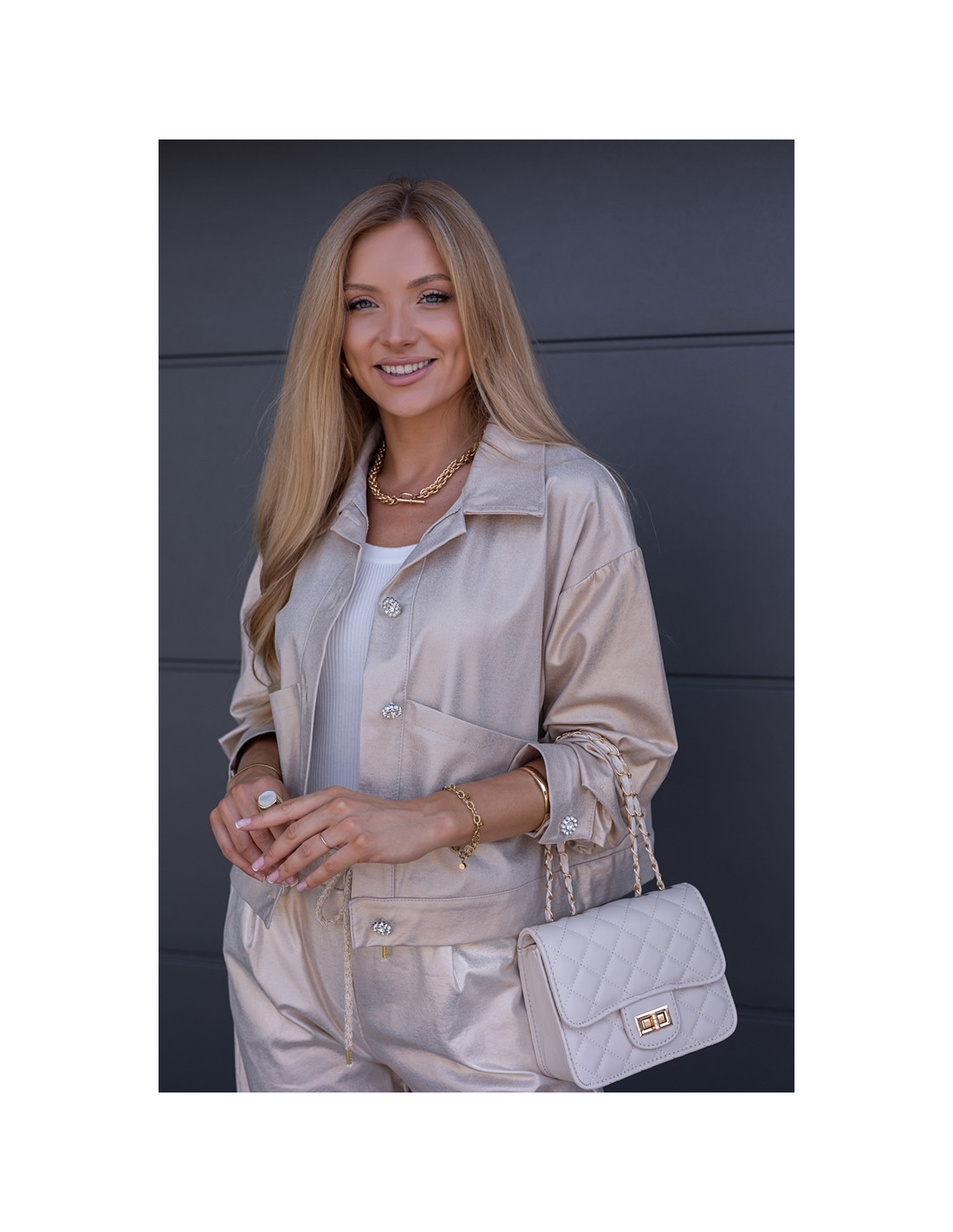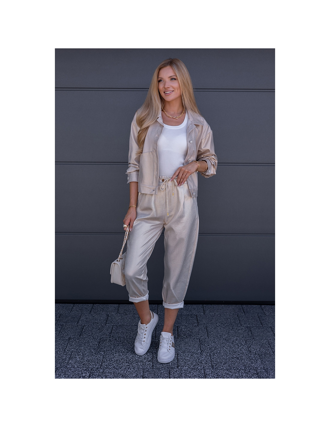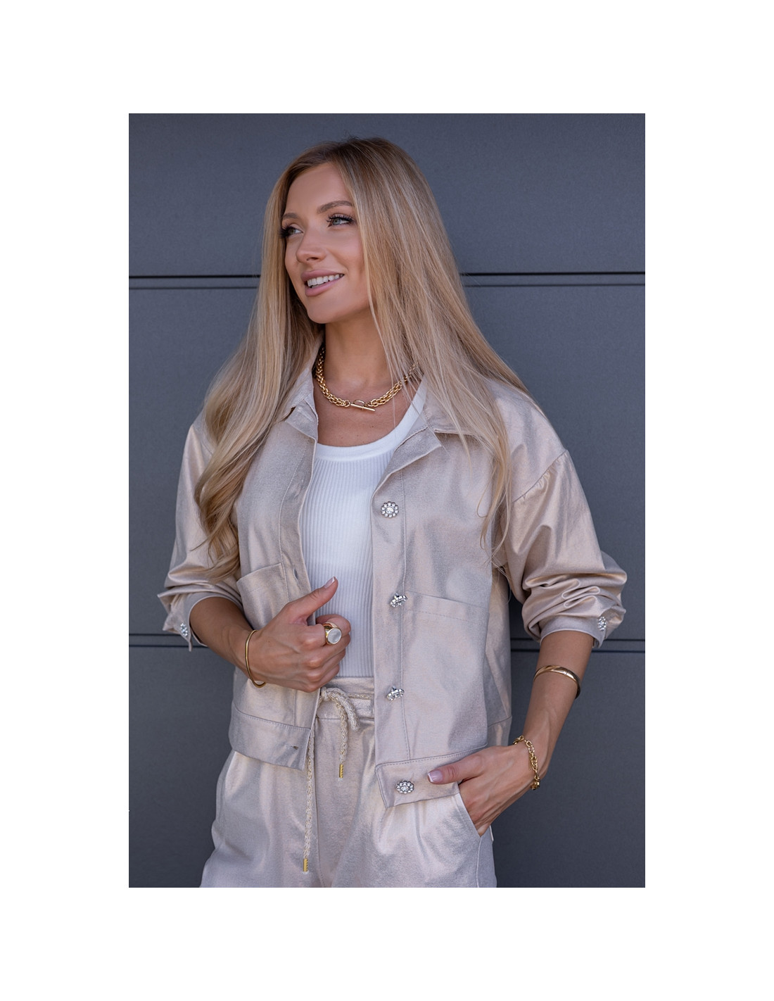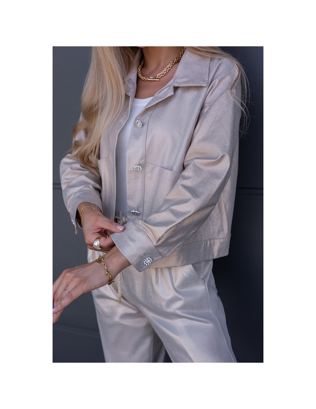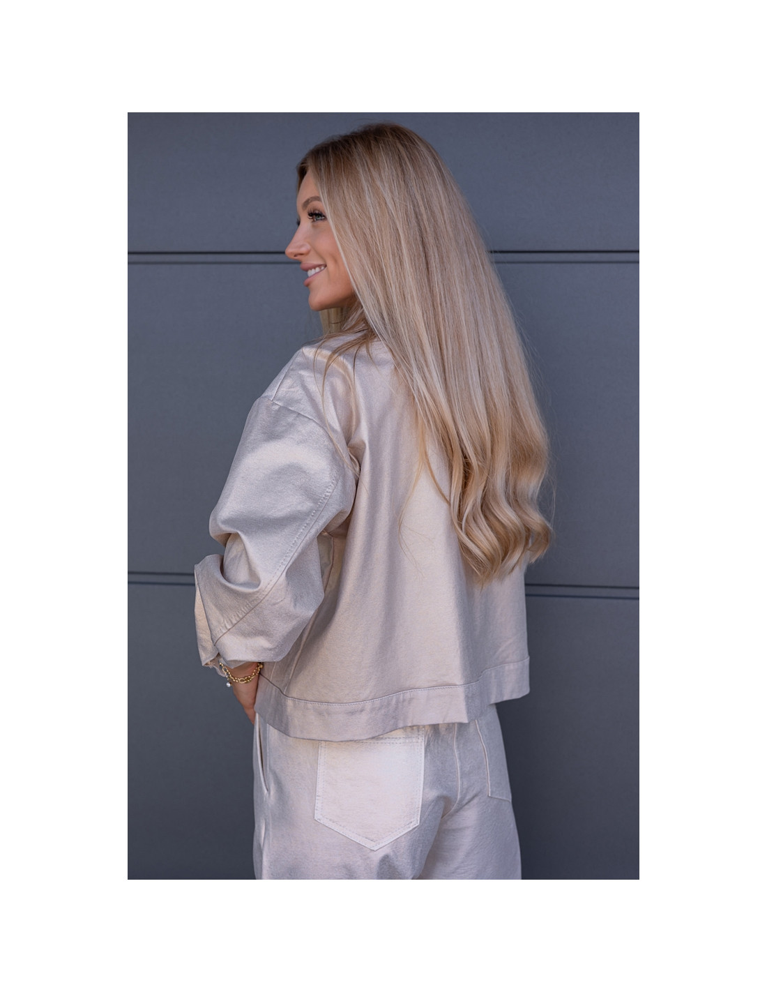 Kurtka typu katana z jasno złotego materiału. Rękawek długi z możliwością podwinięcia. Zapinana na guziki. Luźny krój, rękaw lekko opadający.