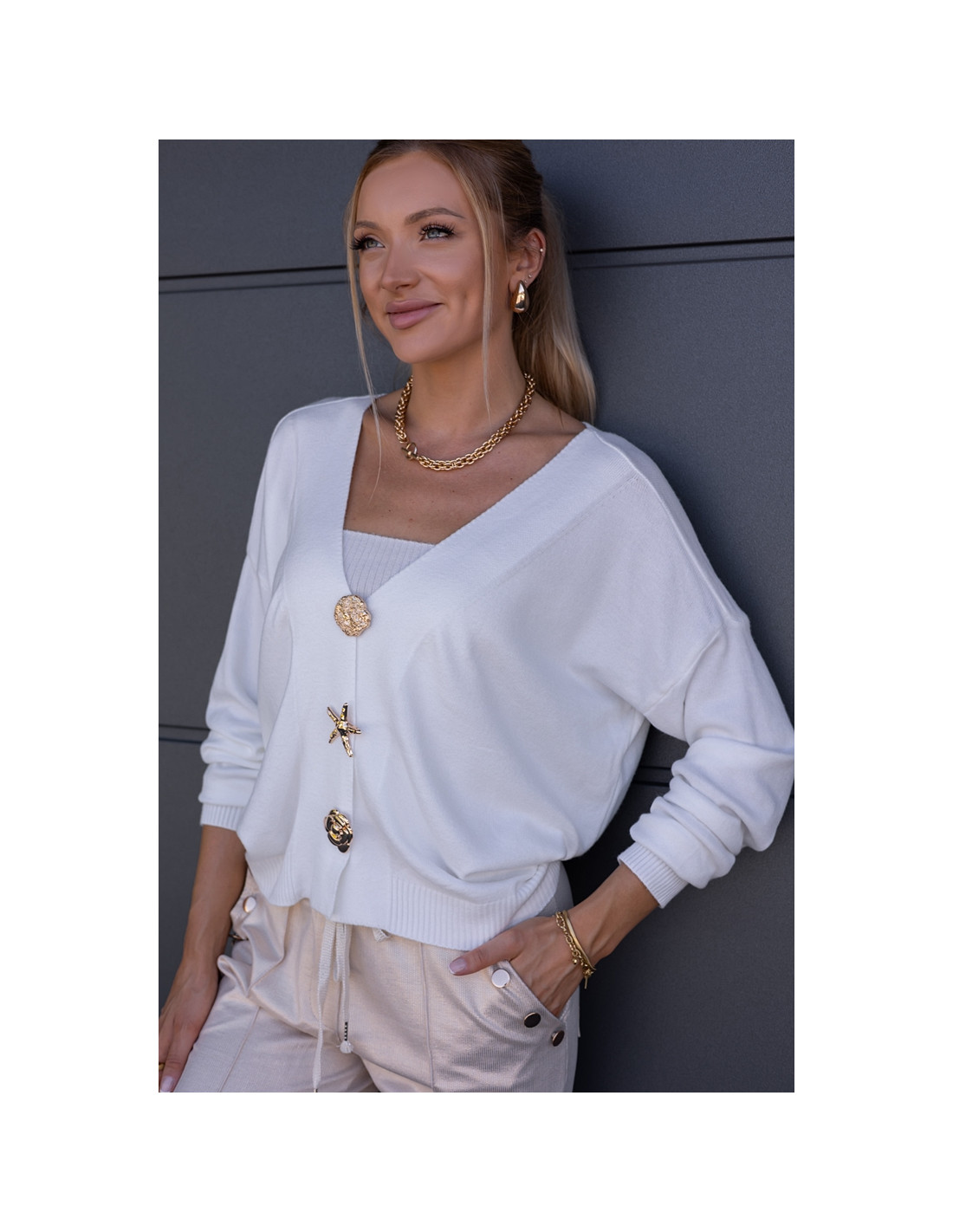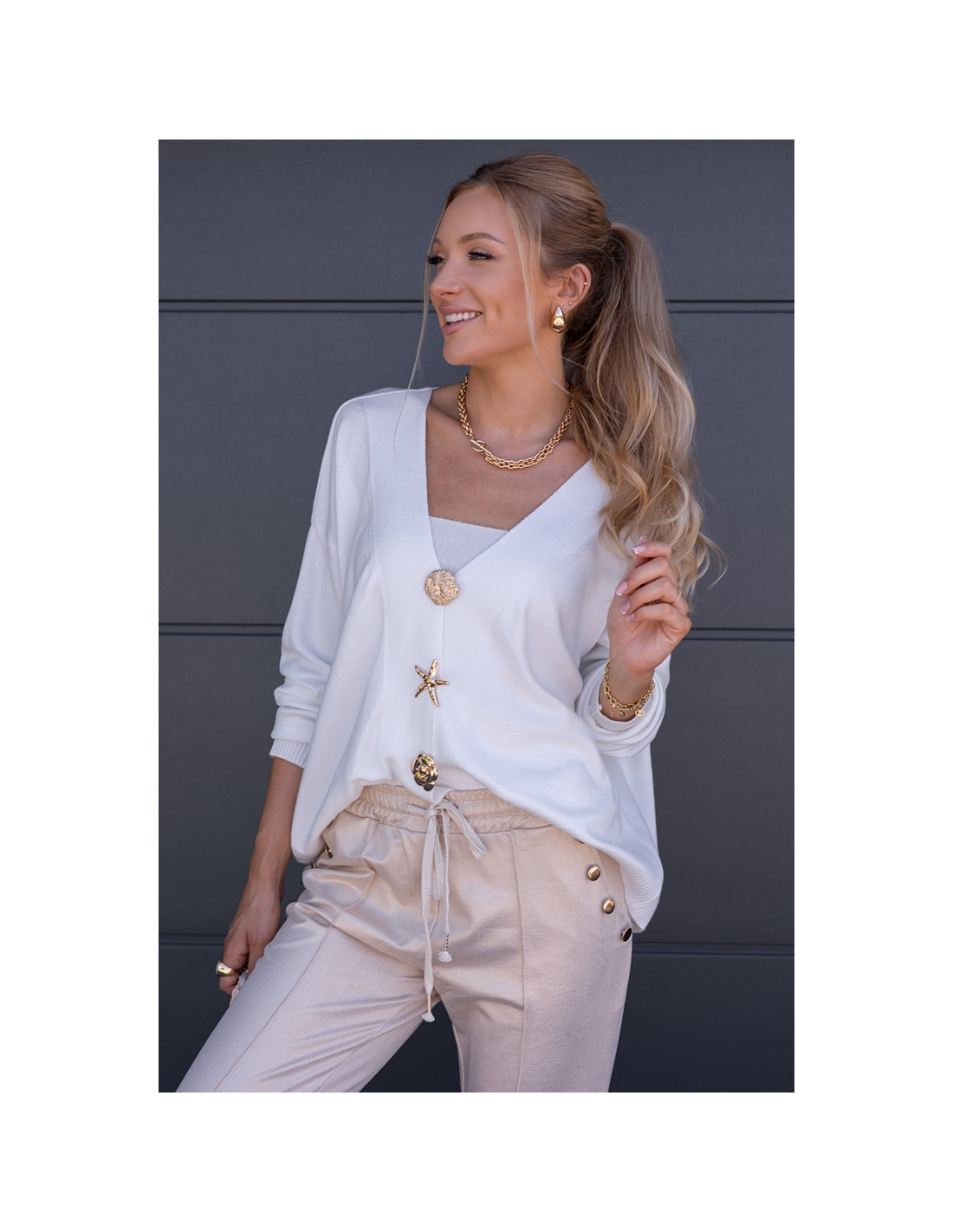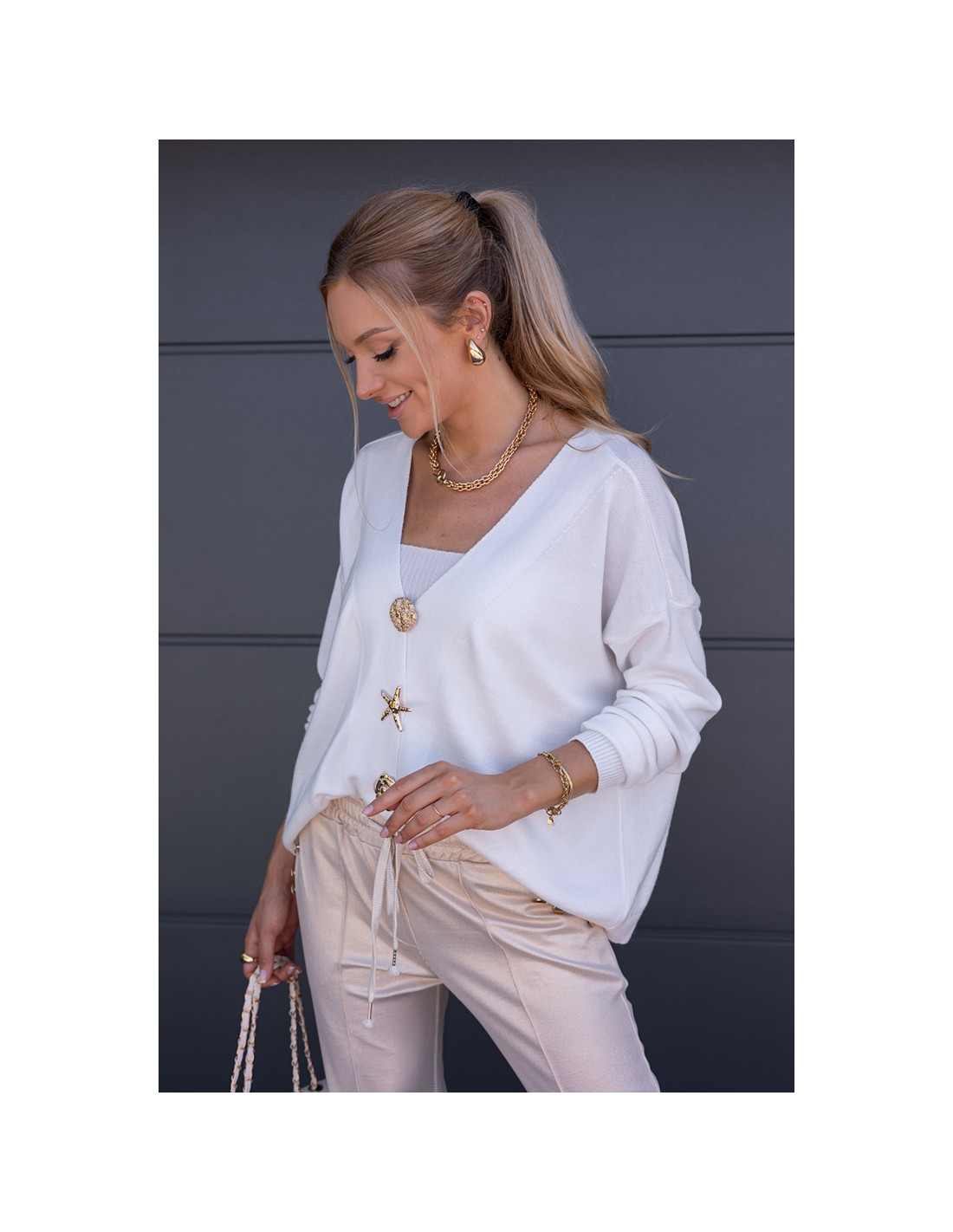 Luźny sweter, oversizowy krój z obniżonym rękawkiem, zapinany na złote, ozdobne broszki . Rękawki oraz dół sweterka zakończone ściągaczami.