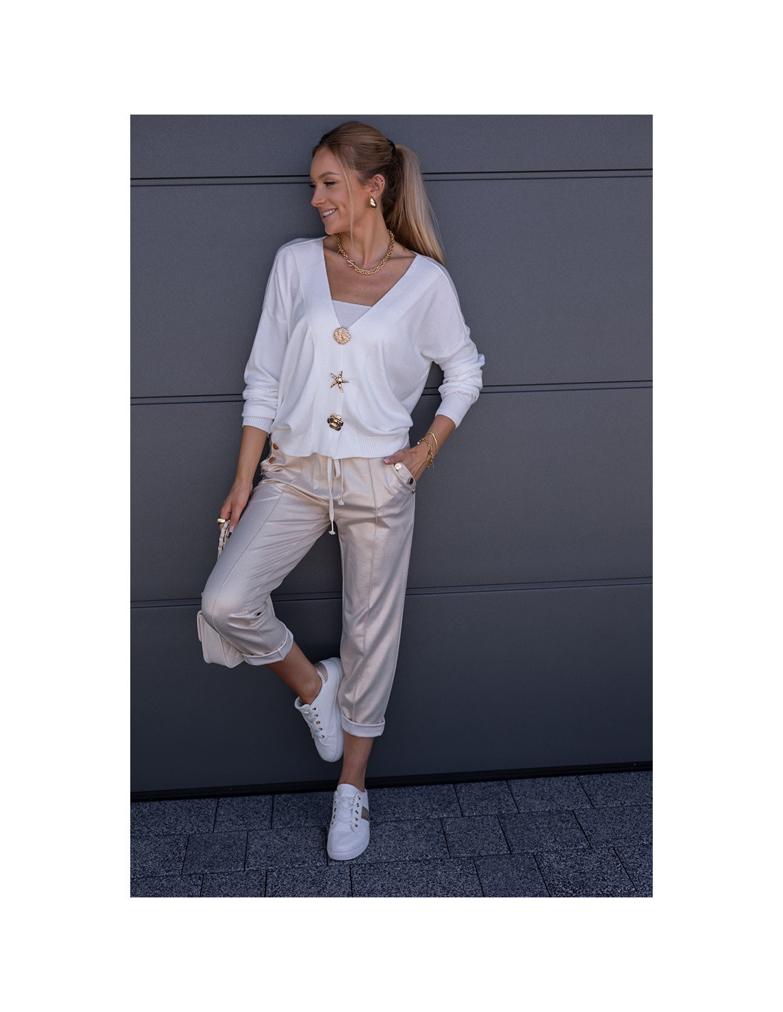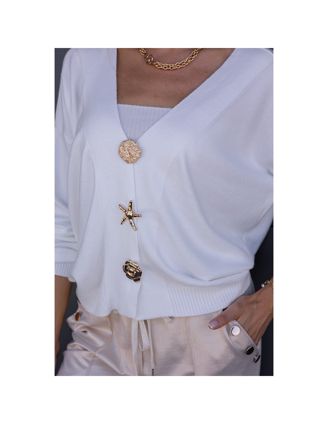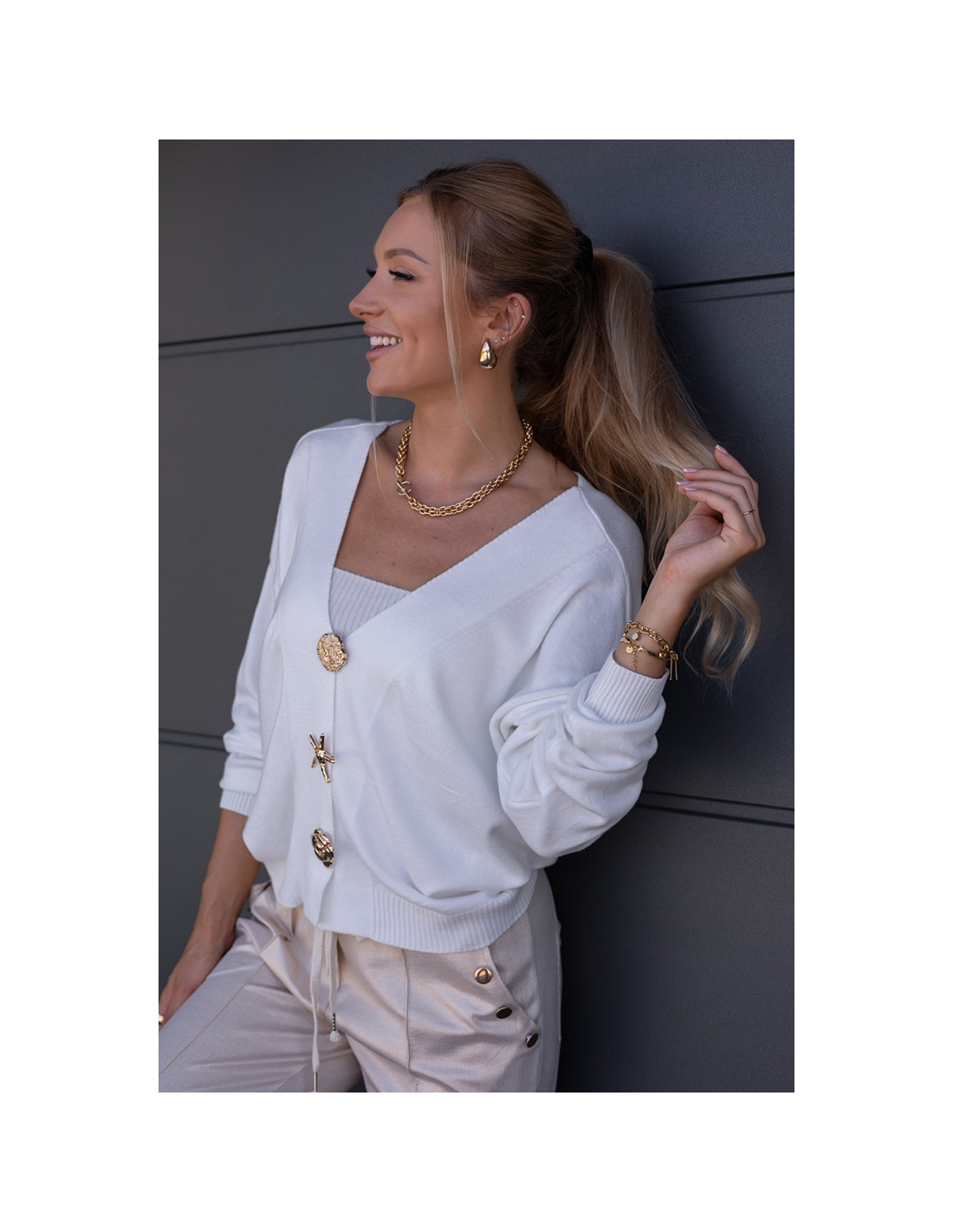 Luźny sweter, oversizowy krój z obniżonym rękawkiem, zapinany na złote, ozdobne broszki . Rękawki oraz dół sweterka zakończone ściągaczami.
