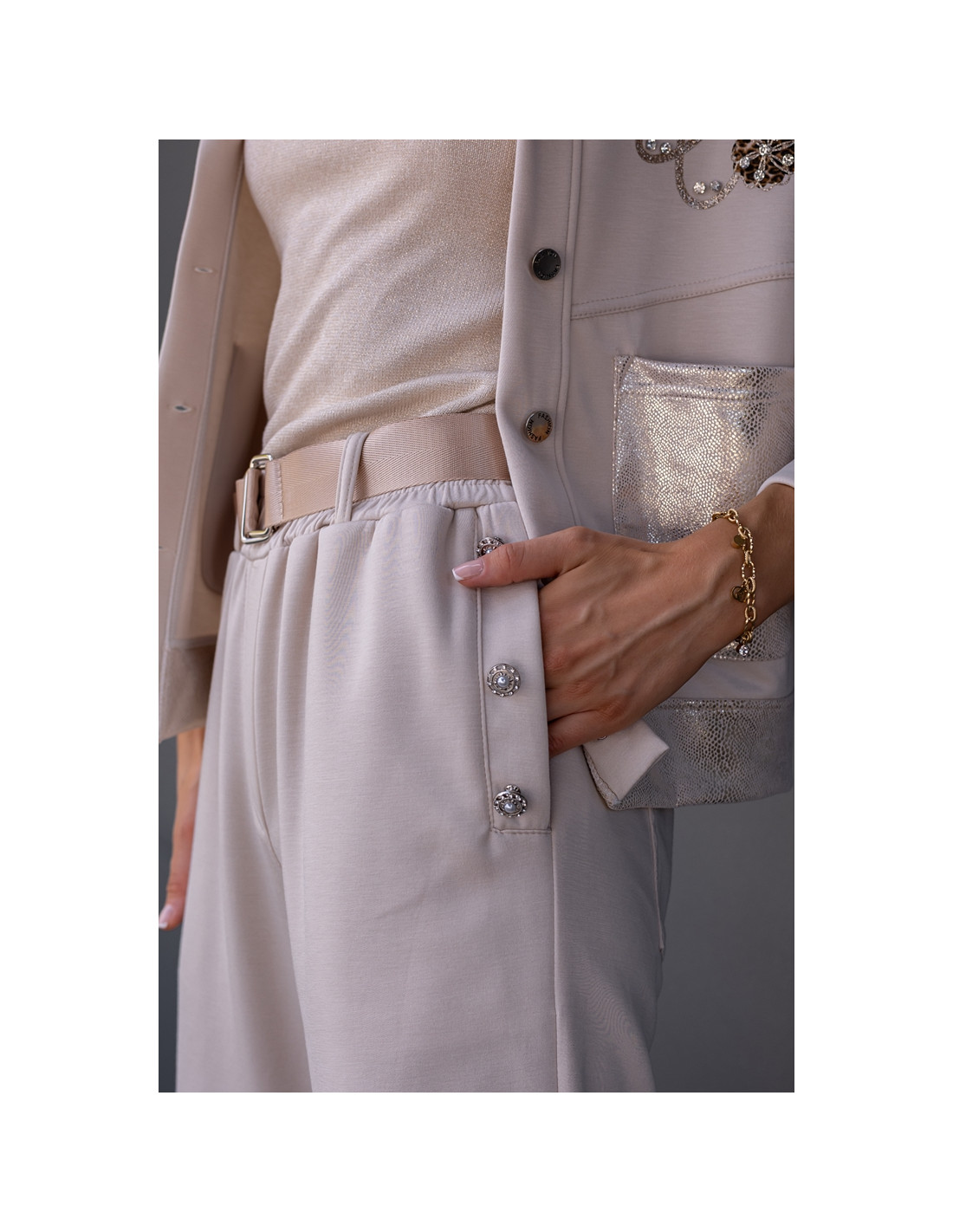 Posiadają gumkę w pasie oraz ozdobny, regulowany pasek. Posiadają również ozdobne kieszenie z guziczkami.