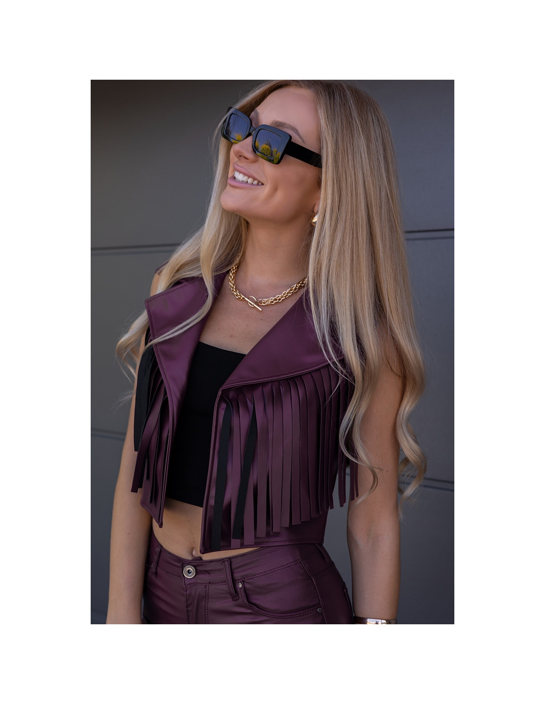 Modna kamizelka z bordowego eko skaju. Idealny dodatek do jesiennych stylizacji. Ubierzesz ją na top, bluzkę czy koszulę.