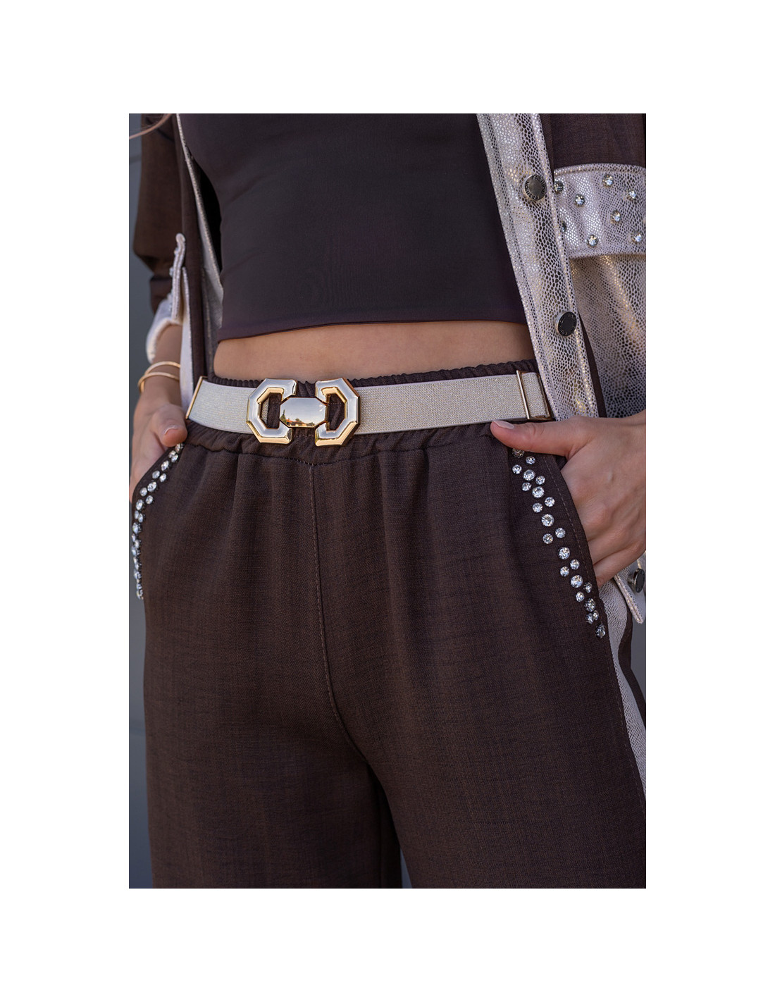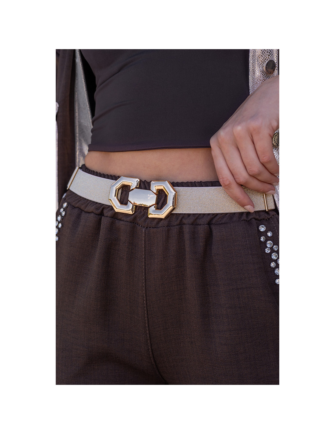 Regulowany pasek na gumie, ze złotą klamerką. Można go nosić do spodni jak i do sukienek.