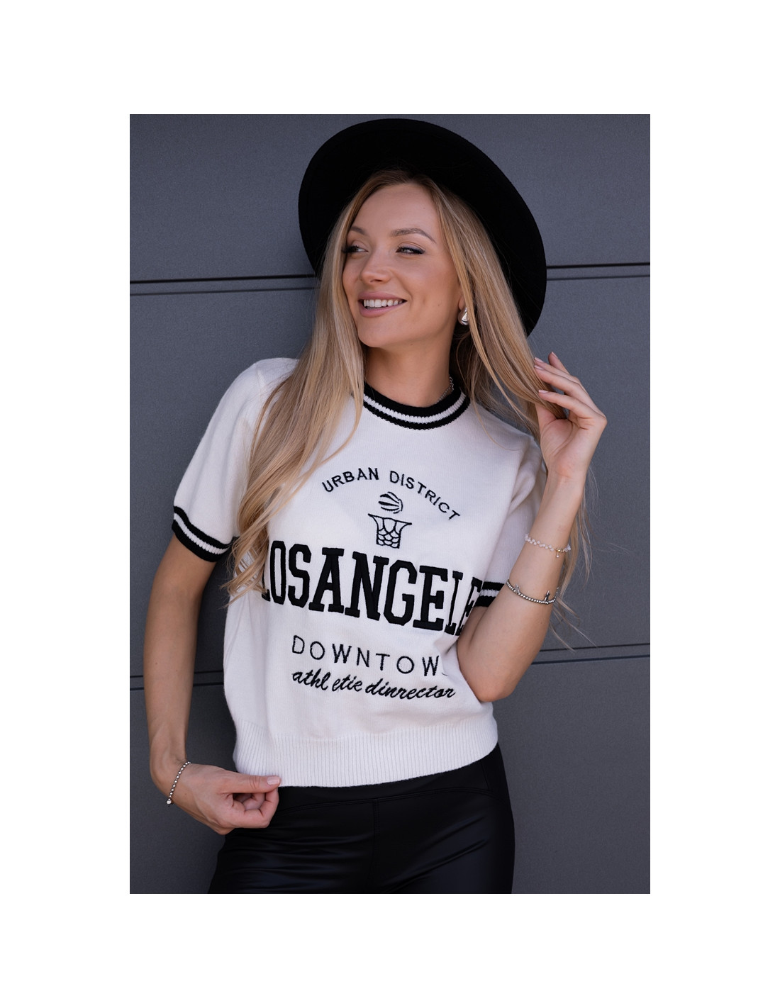 Śliczny sweterek z krótkim rękawkiem, posiada ściągacze z lamówkami i ozdobne napisy. Materiał dobrze się ciągnie.