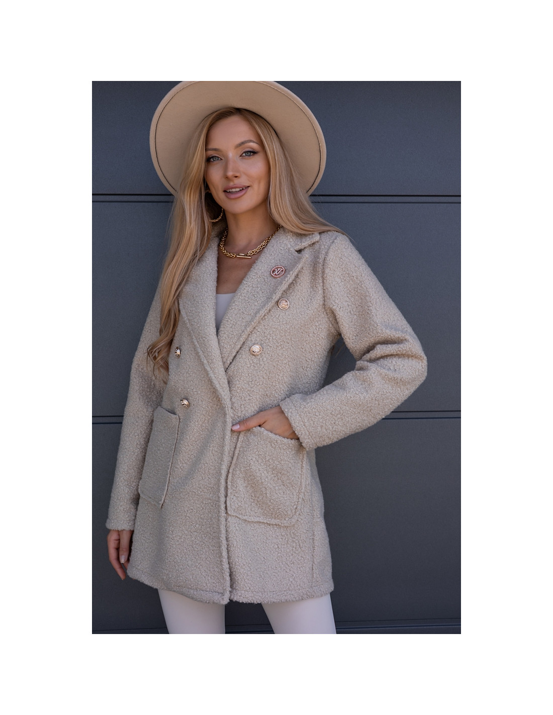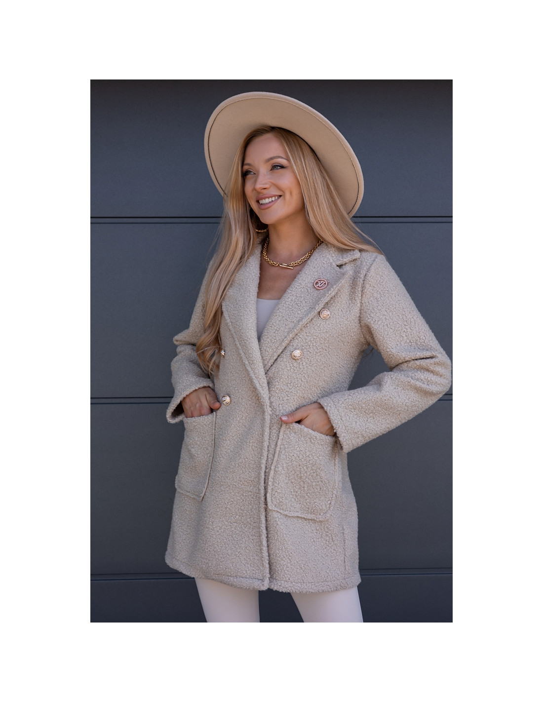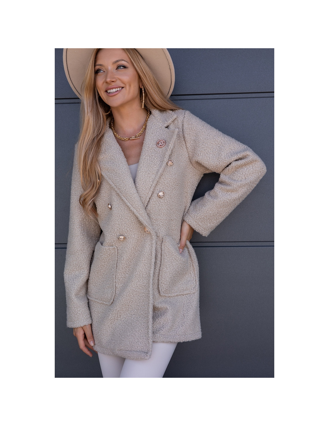 Płaszczyk z materiału bukla. Zapinany na złote guziki. Posiada kieszonki oraz ozdobną złotą naszywkę. Płaszczyk idealny na jesień, nie posiada podszewki.