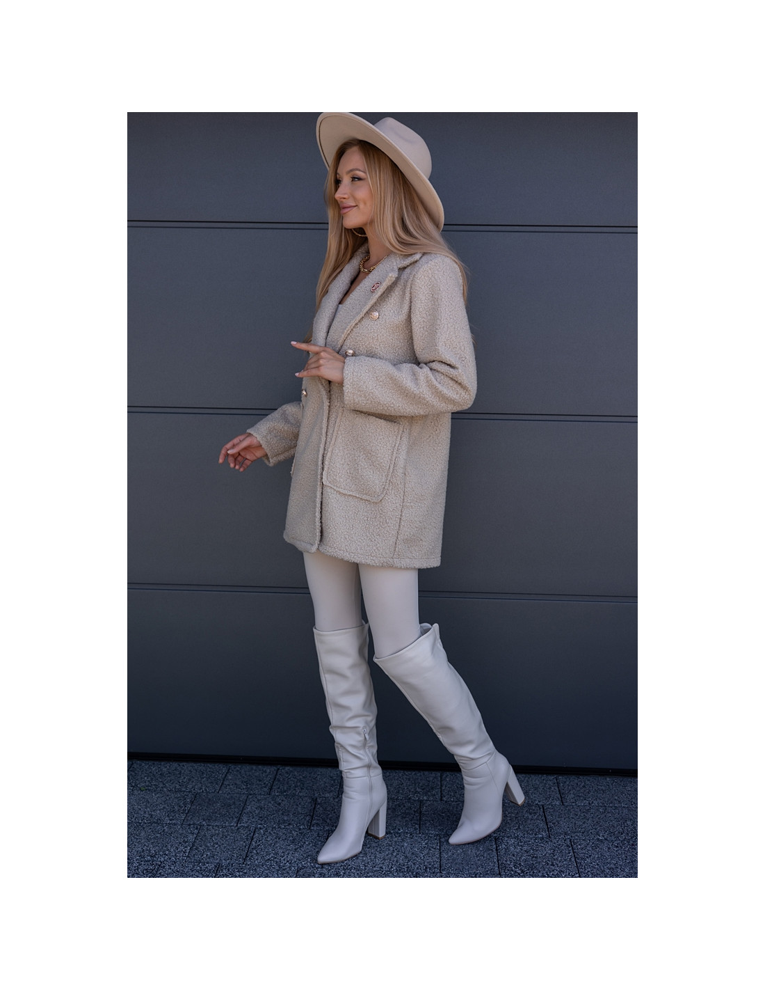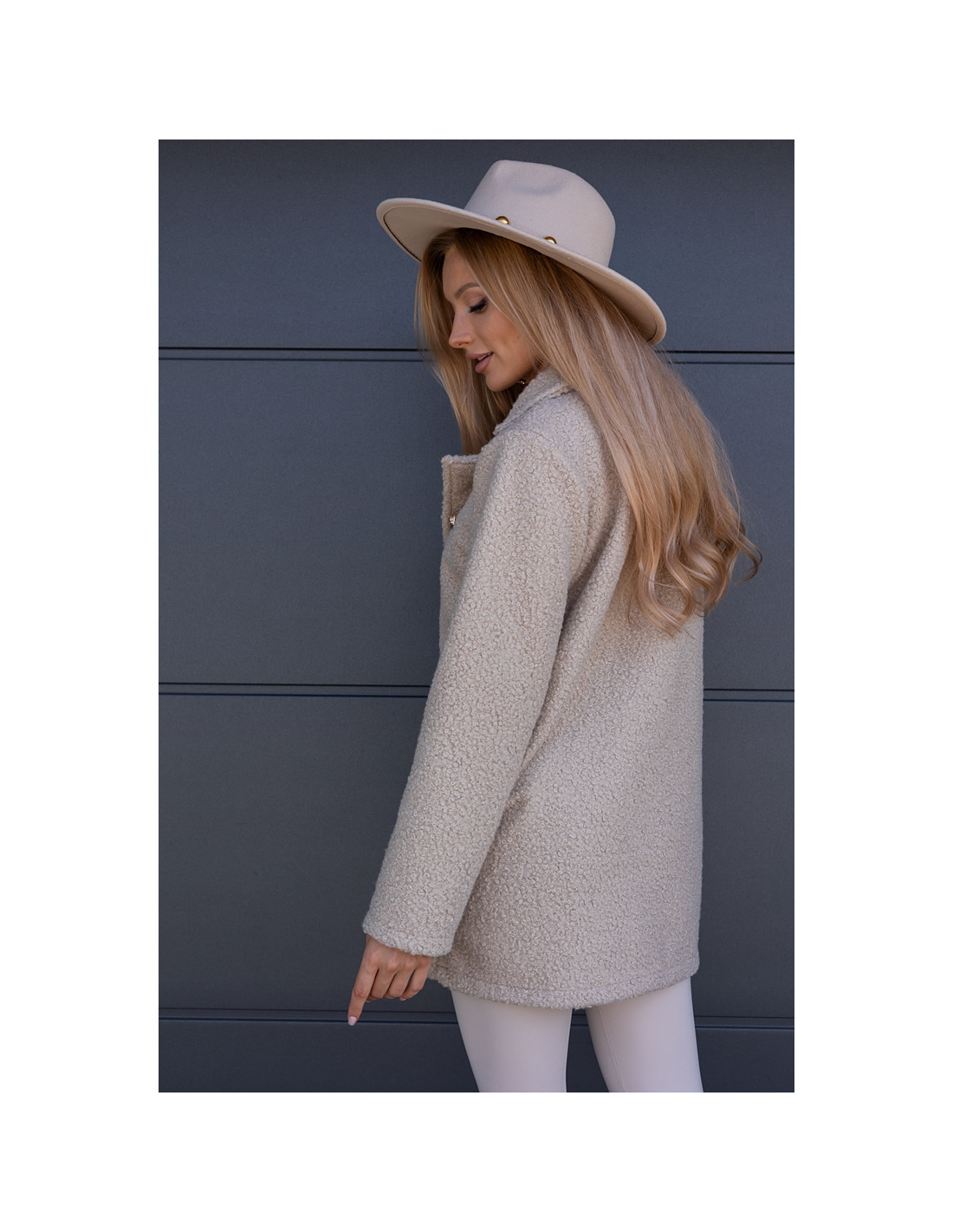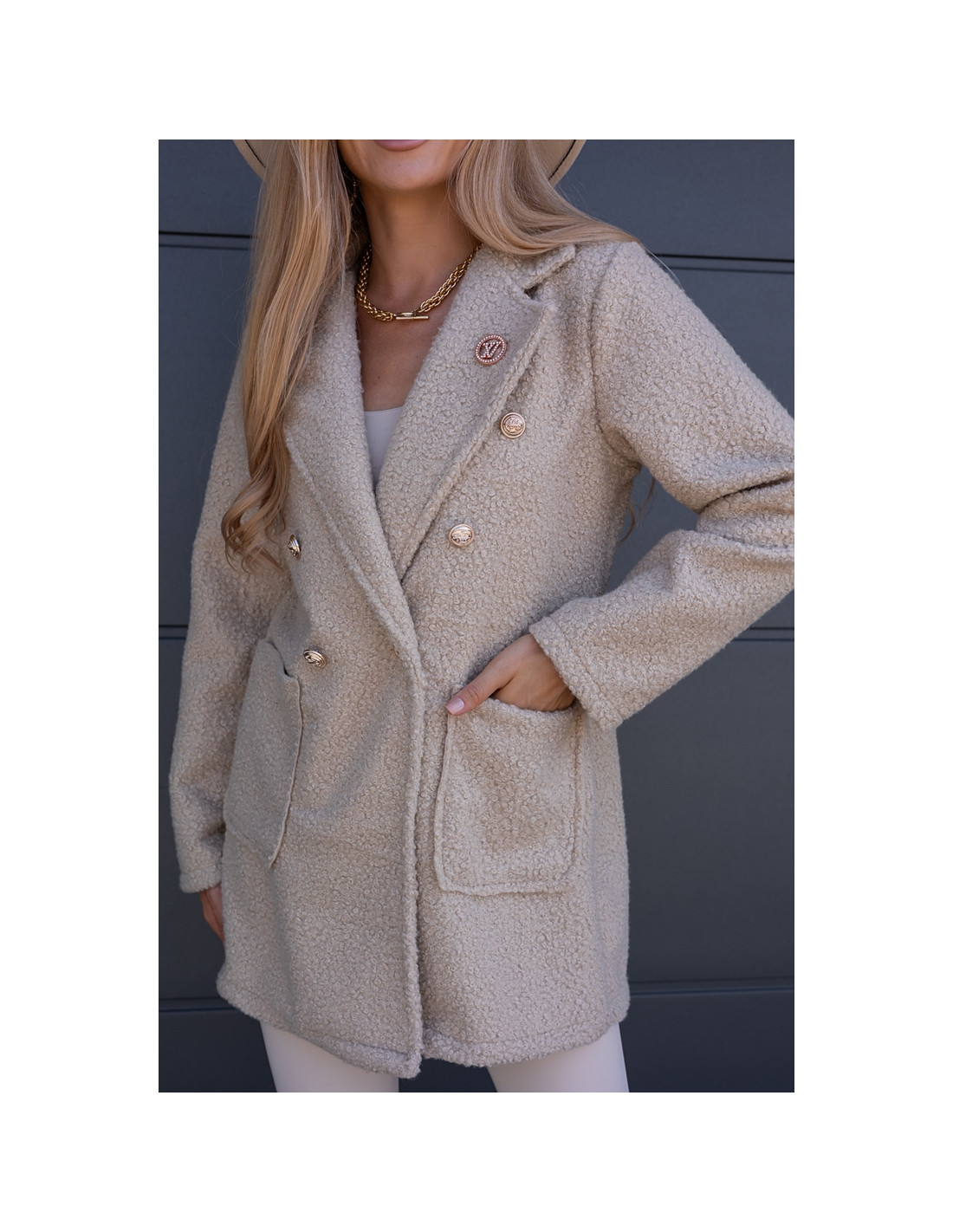 Płaszczyk z materiału bukla. Zapinany na złote guziki. Posiada kieszonki oraz ozdobną złotą naszywkę. Płaszczyk idealny na jesień, nie posiada podszewki.