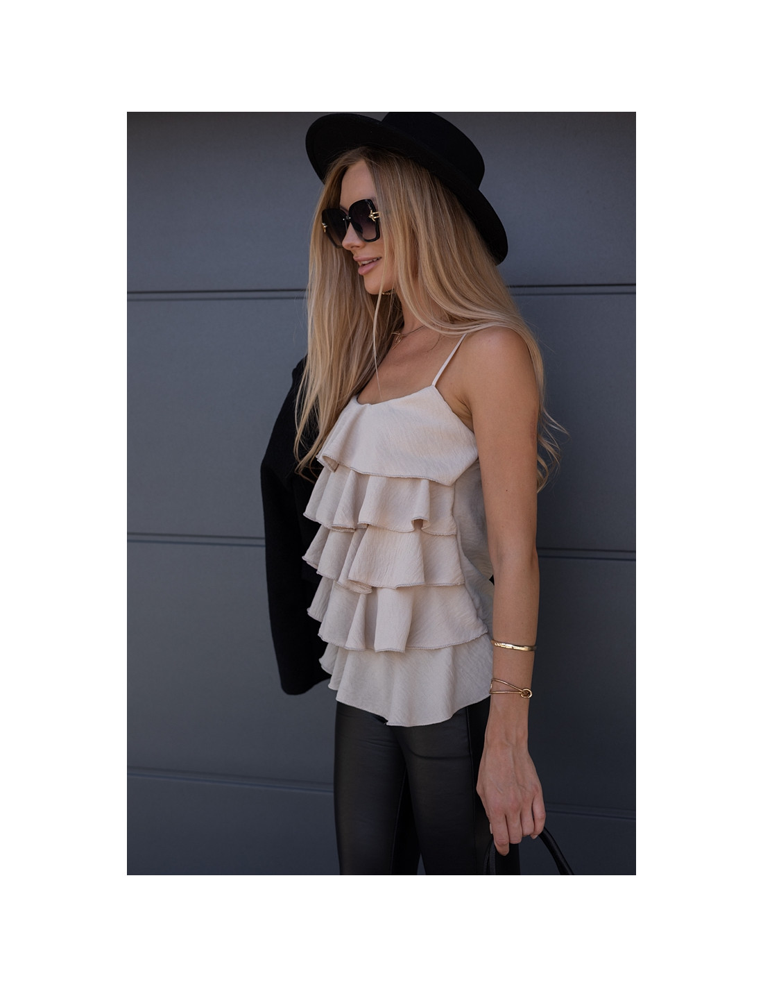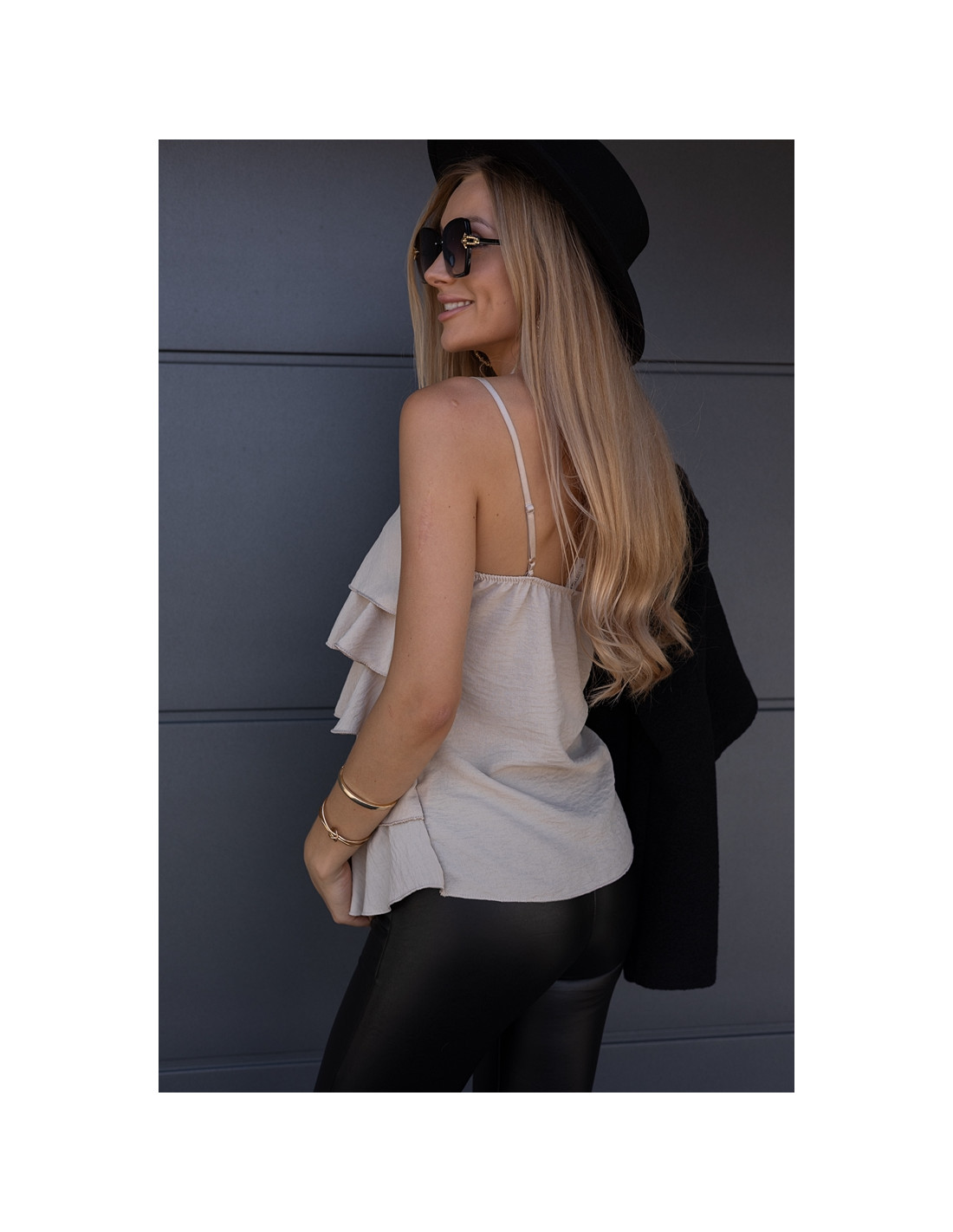 Bluzka z falbanami na regulowanych ramiączkach. Tył gładki.