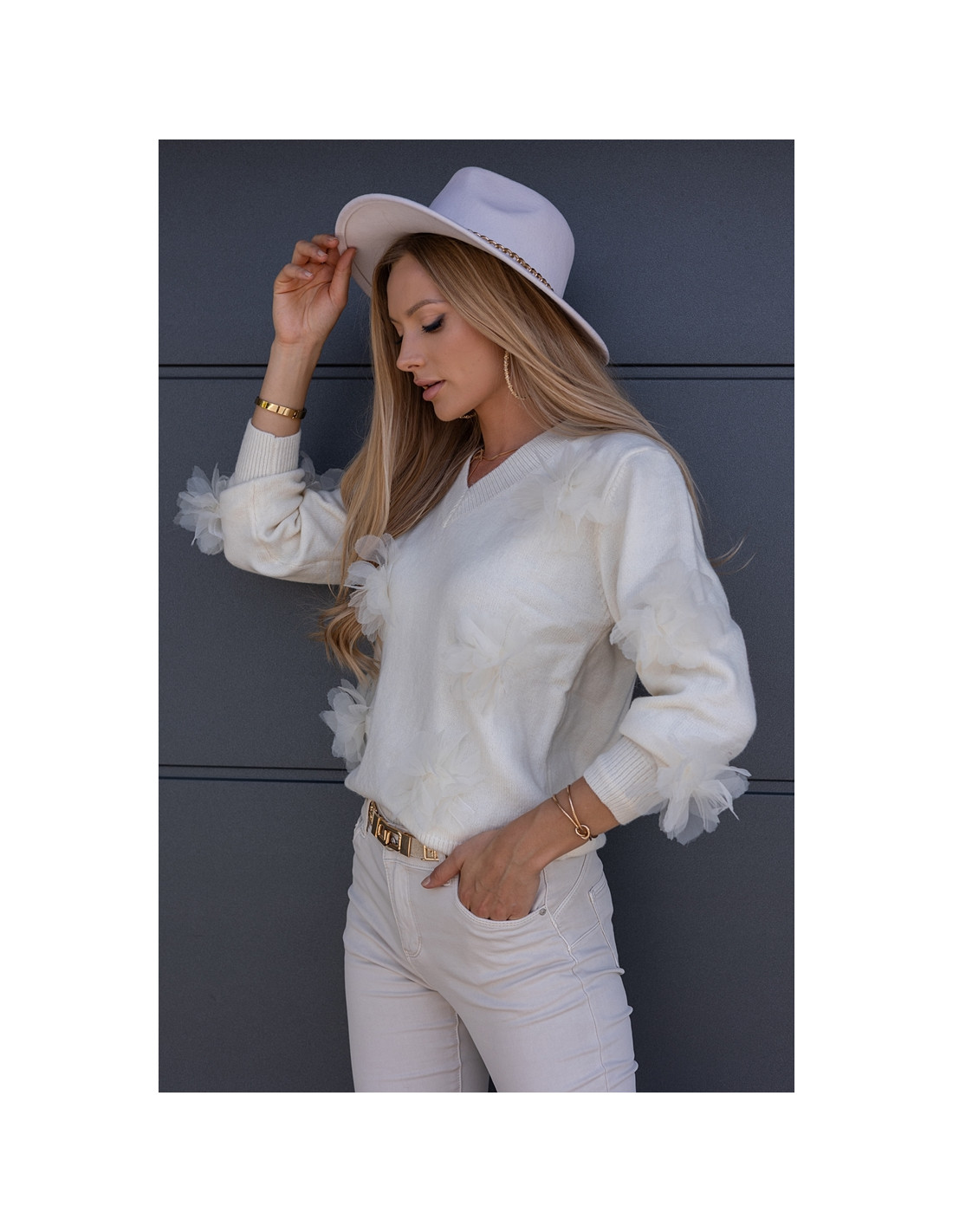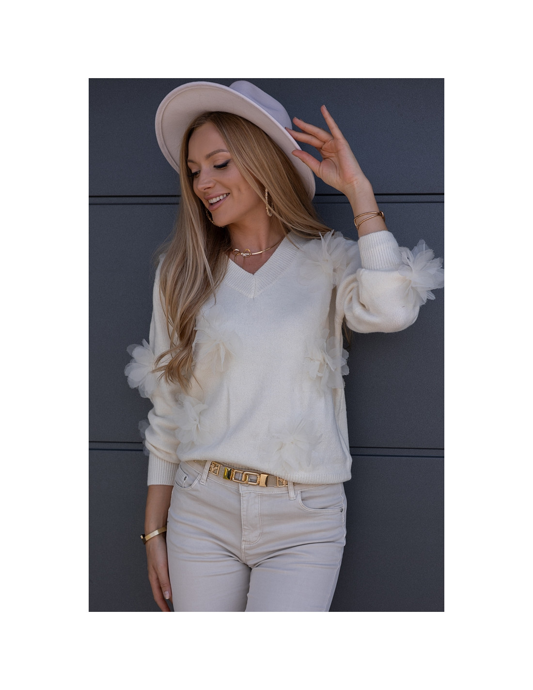 Sweterek z cyrkoniami i kokardką na dekolcie. Rękawki i dół zakończone ściągaczami. Ciepła i elegancka propozycja na chłodne dni.
