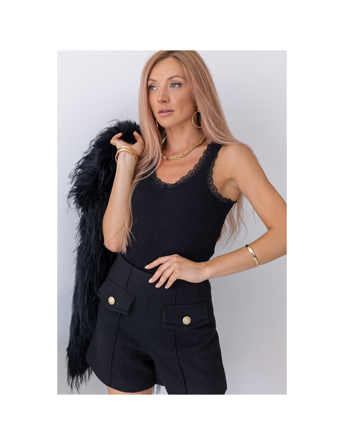 Tradycyjny Top na ramiączkach z prążkowanego materiału. Ze wstawkami koronki.