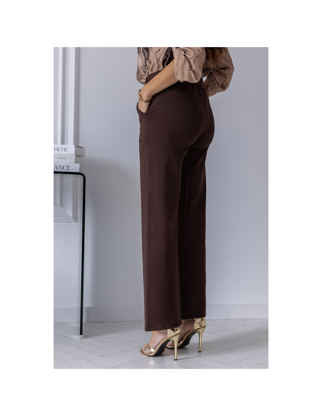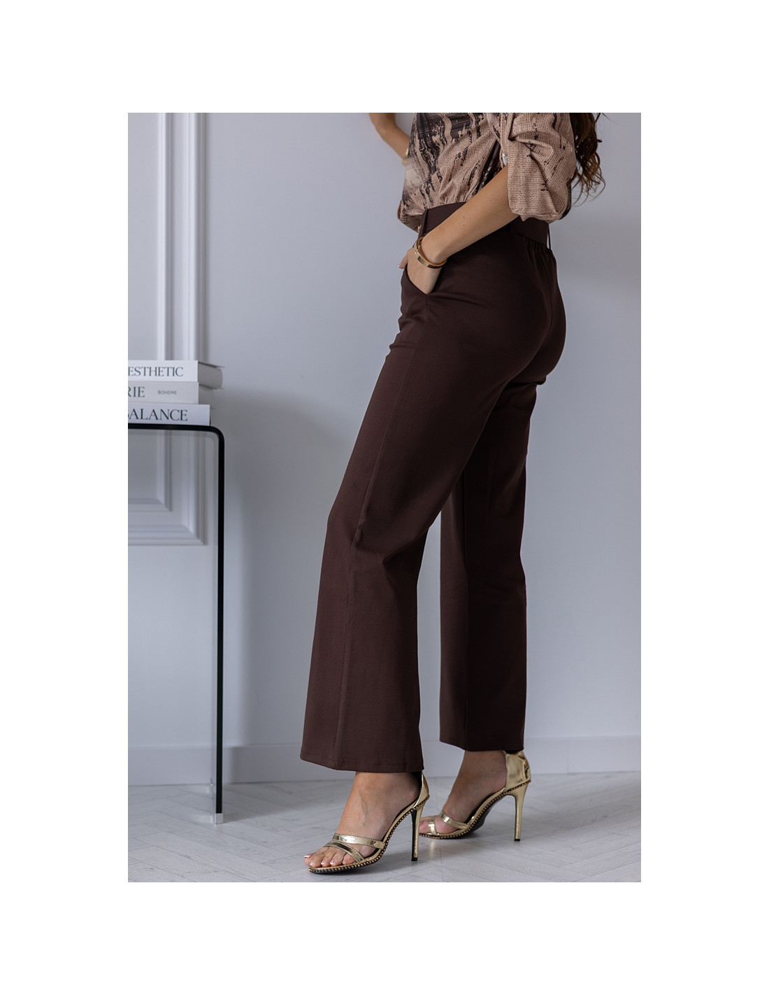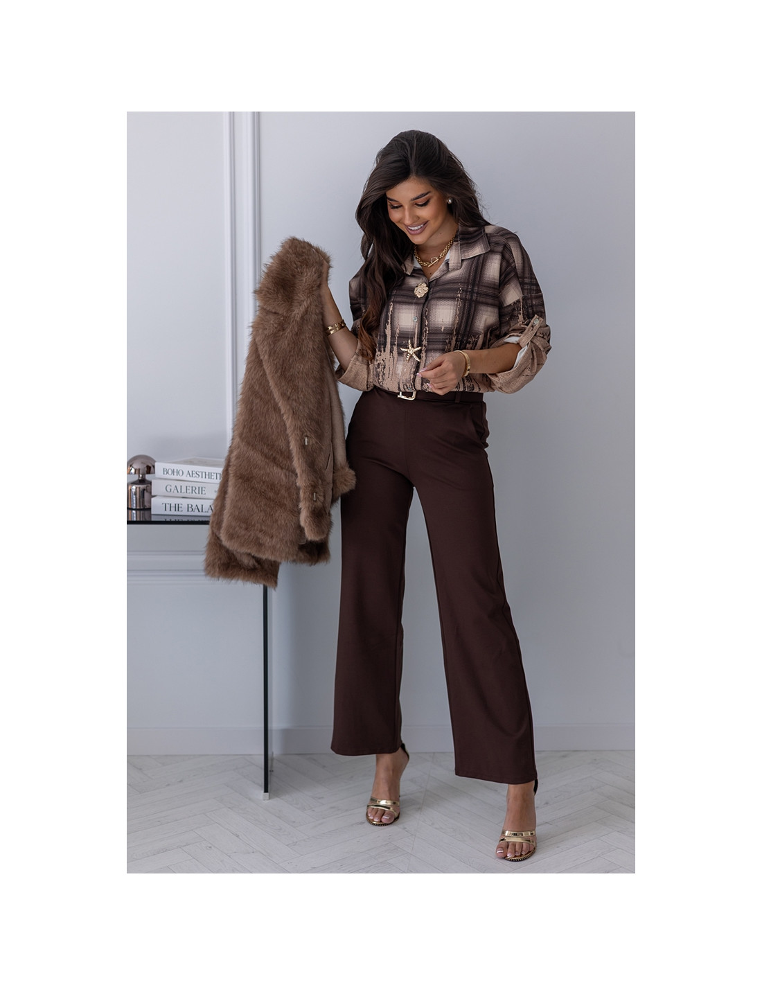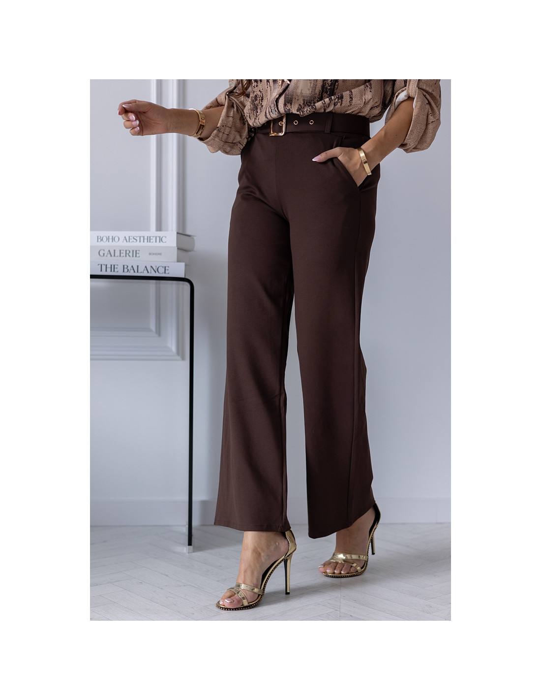Eleganckie spodnie z poszerzanymi nogawkami. Wysoki stan, w pasie pasek ze złotą klamrą. Materiał lekko się ciągnie.