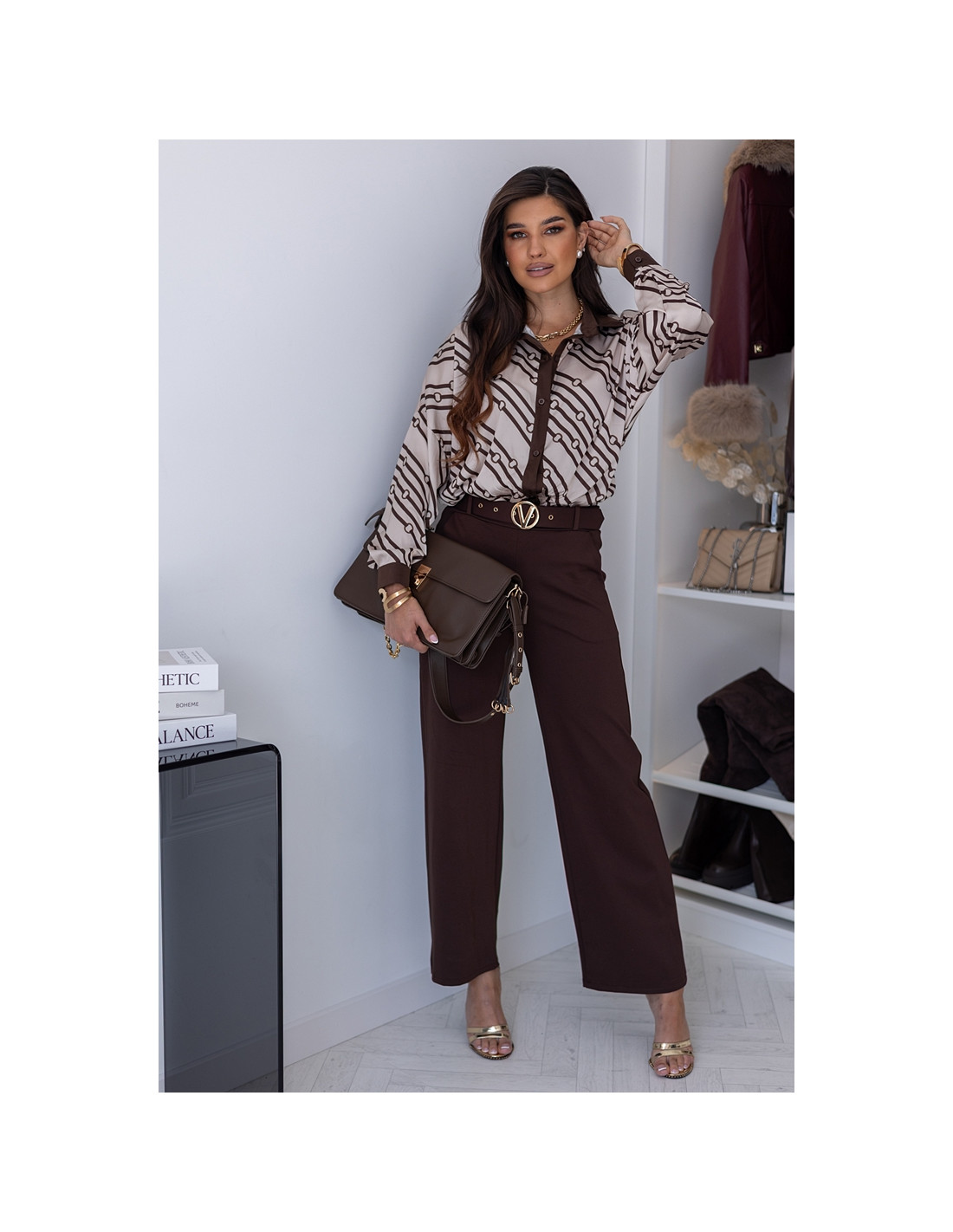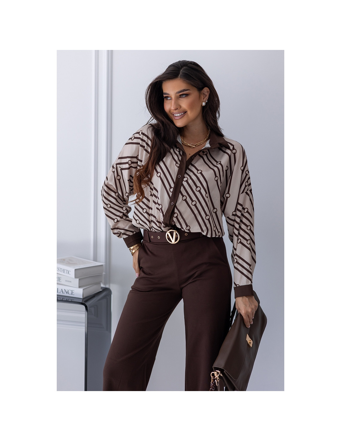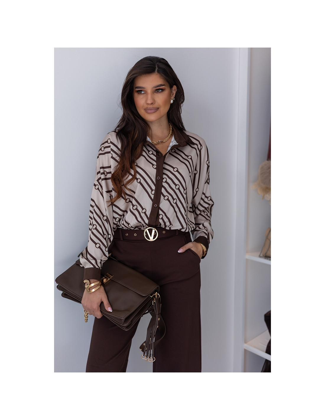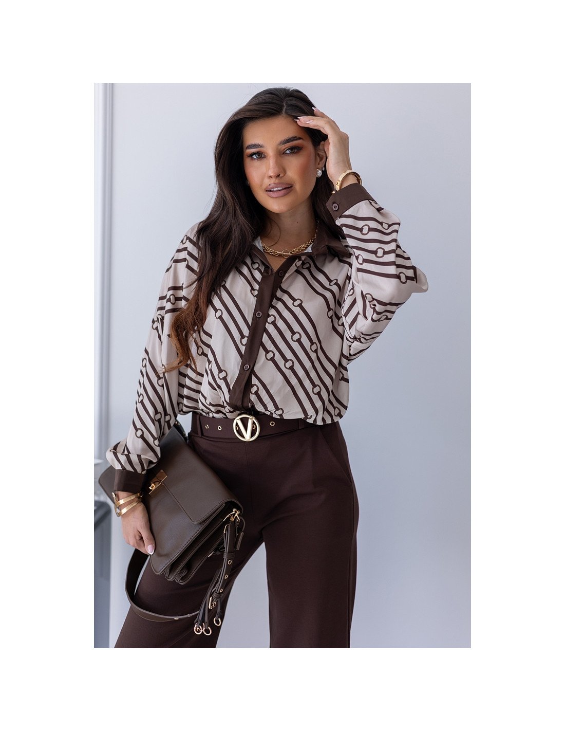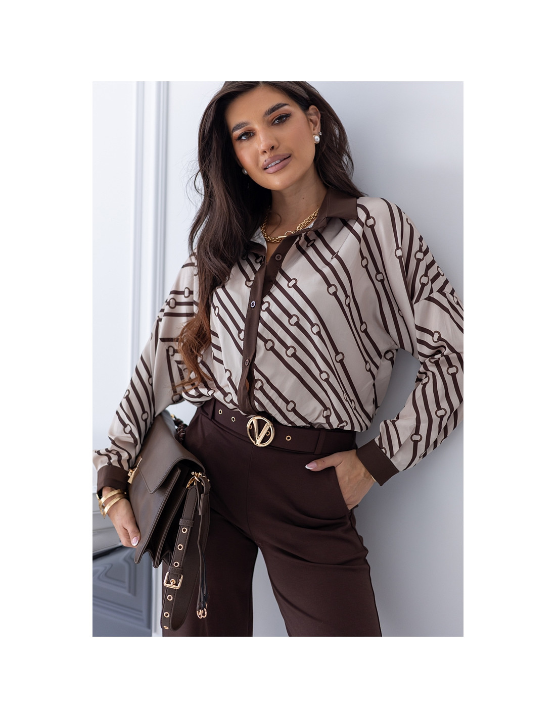 Satynowa koszula z kołnierzykiem w jesienne wzory, zapinana w całości na guziki. Rękawki długie z mankietami.
