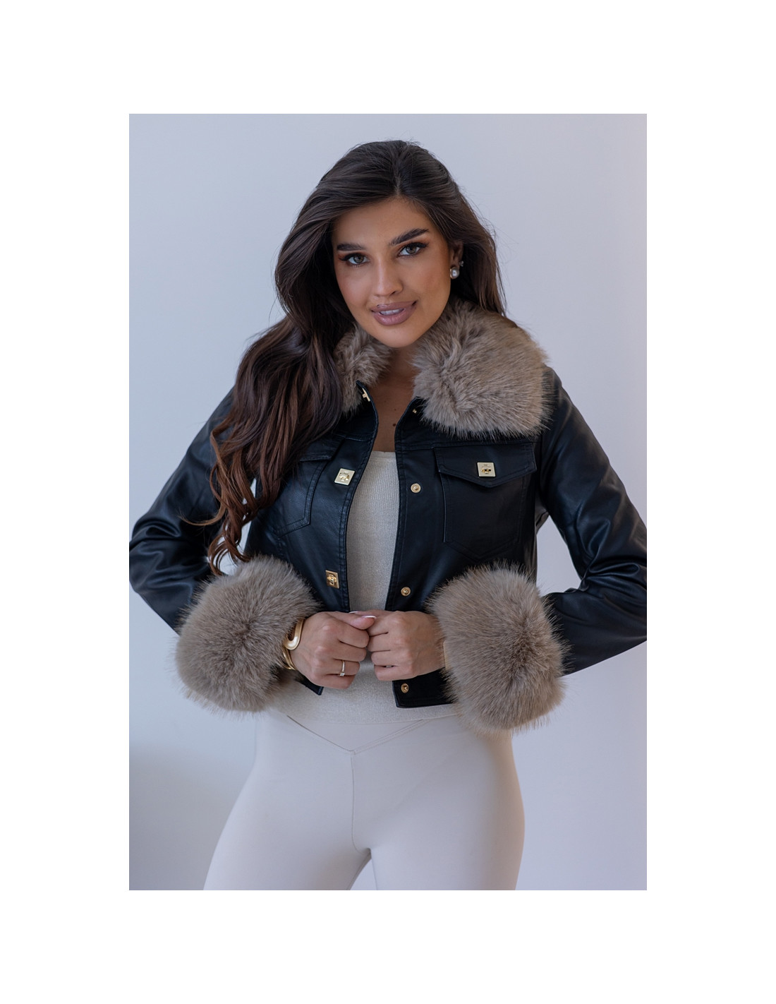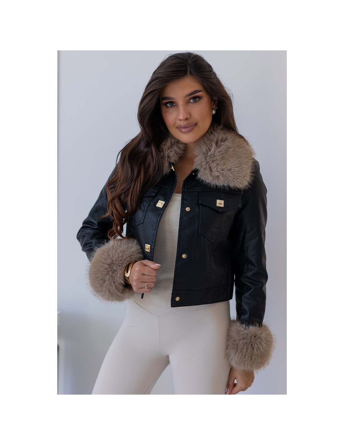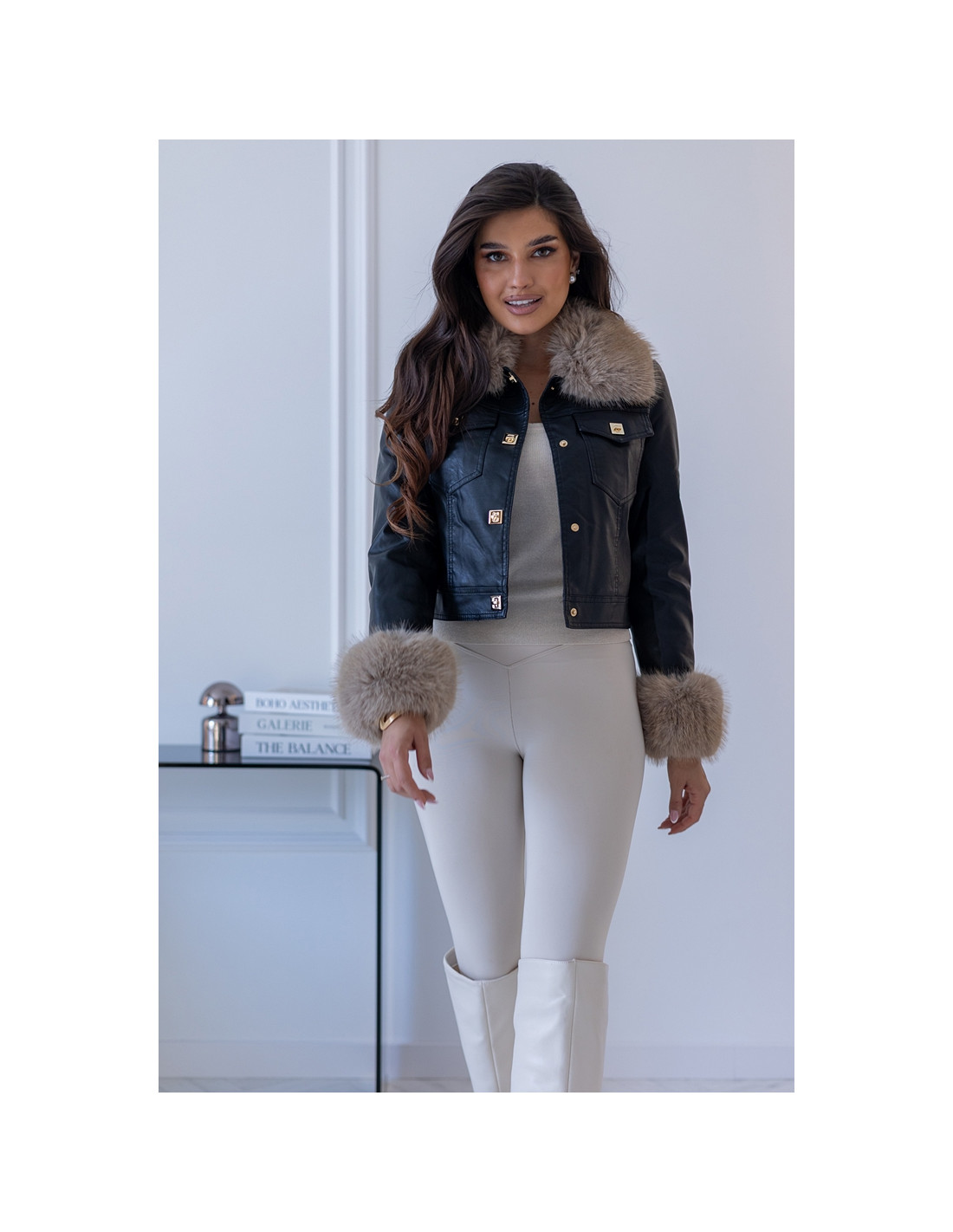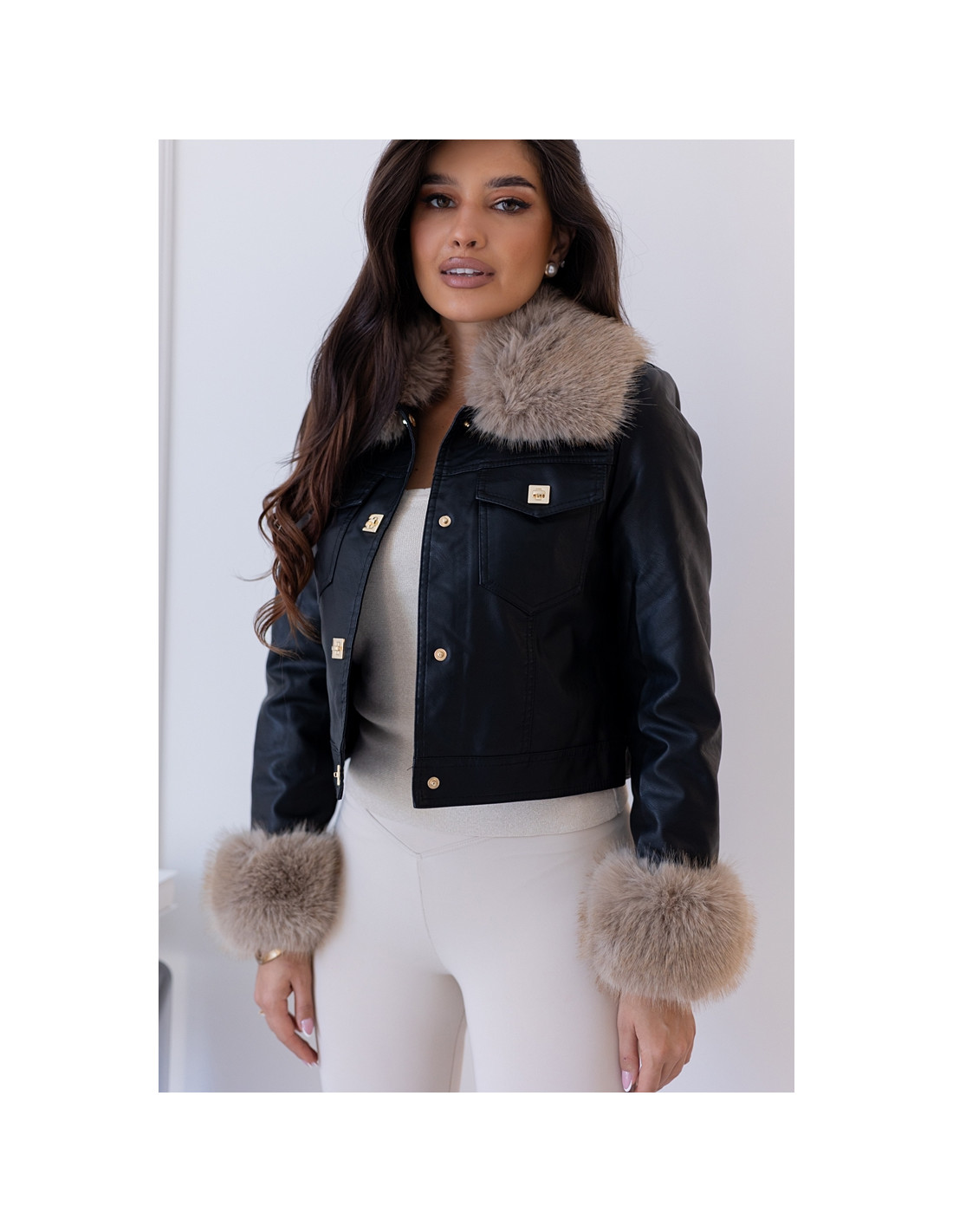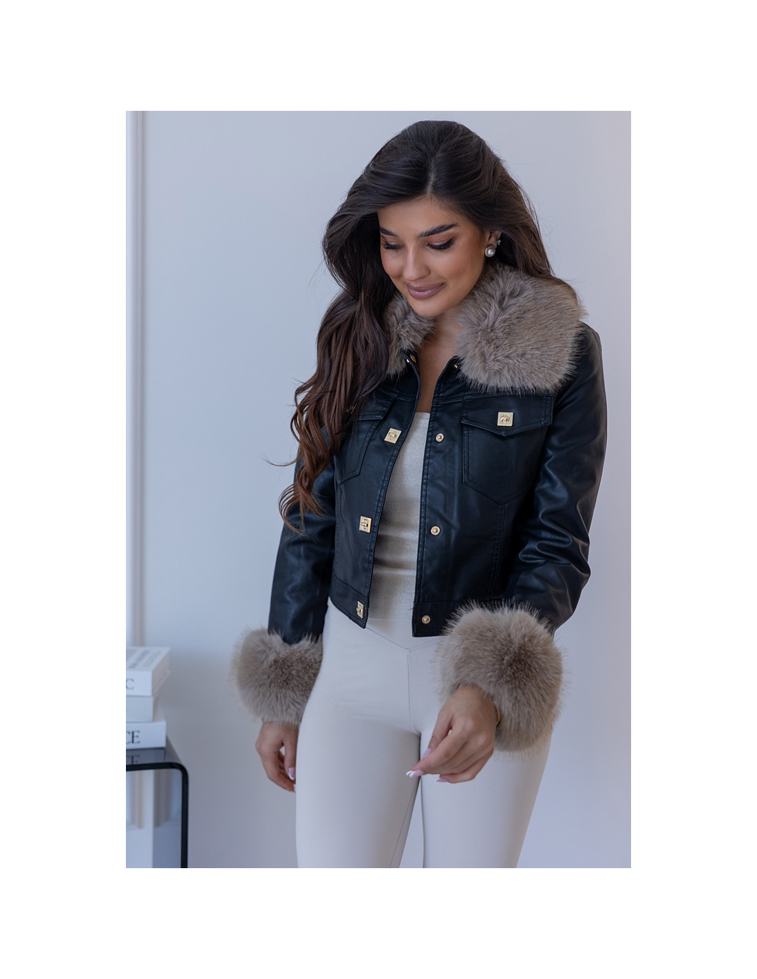 Modna i stylowa kurtka z eko skaju z dodatkiem - odpinanego futerka na kołnierzyku oraz na rękawkach. Zapinana na złote klipsy. Taliowany i dopasowany model. W podszewkę wszyty ocieplacz-miś. Idealna propozycja na zimne dni.