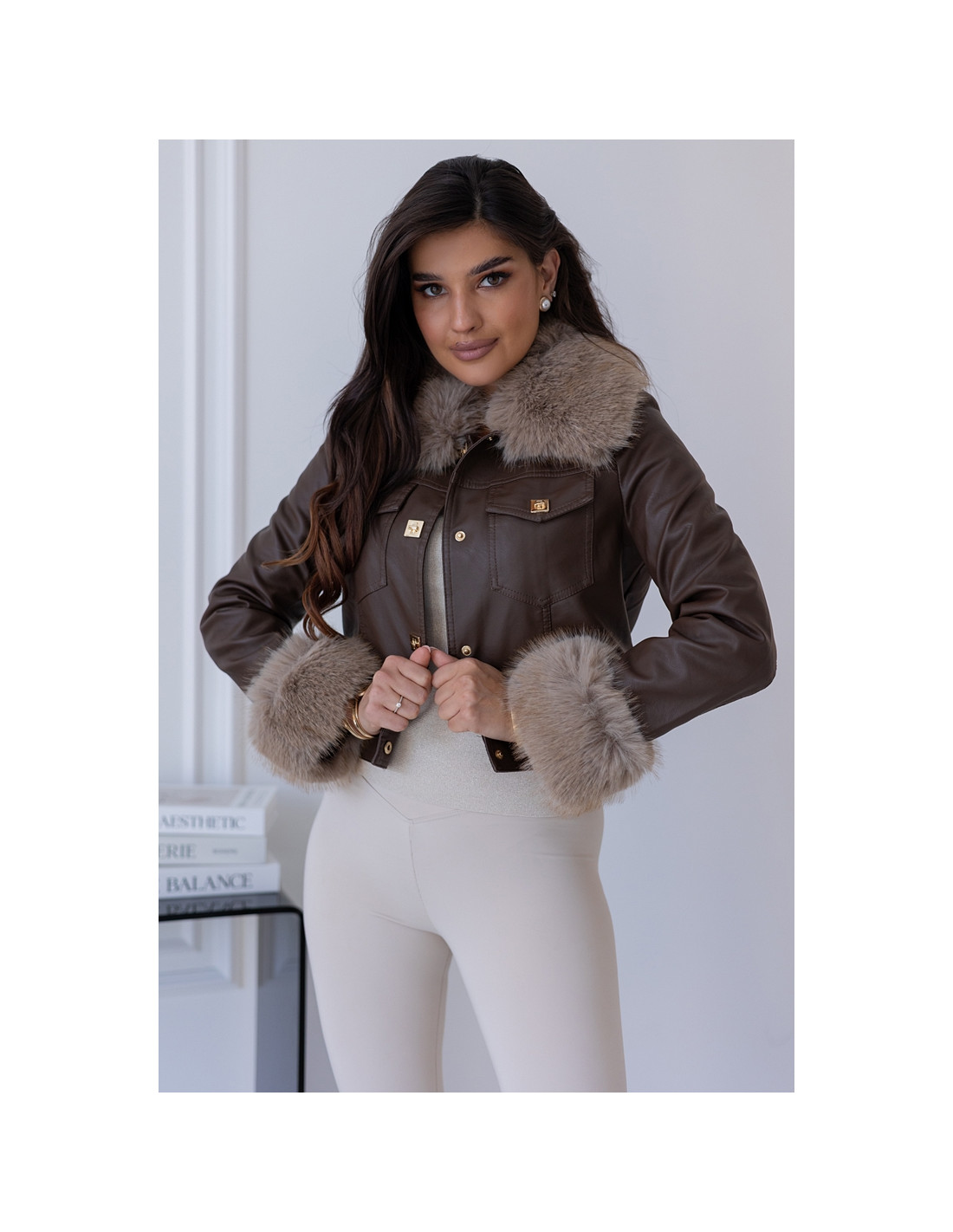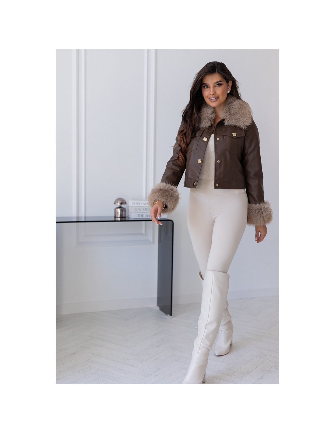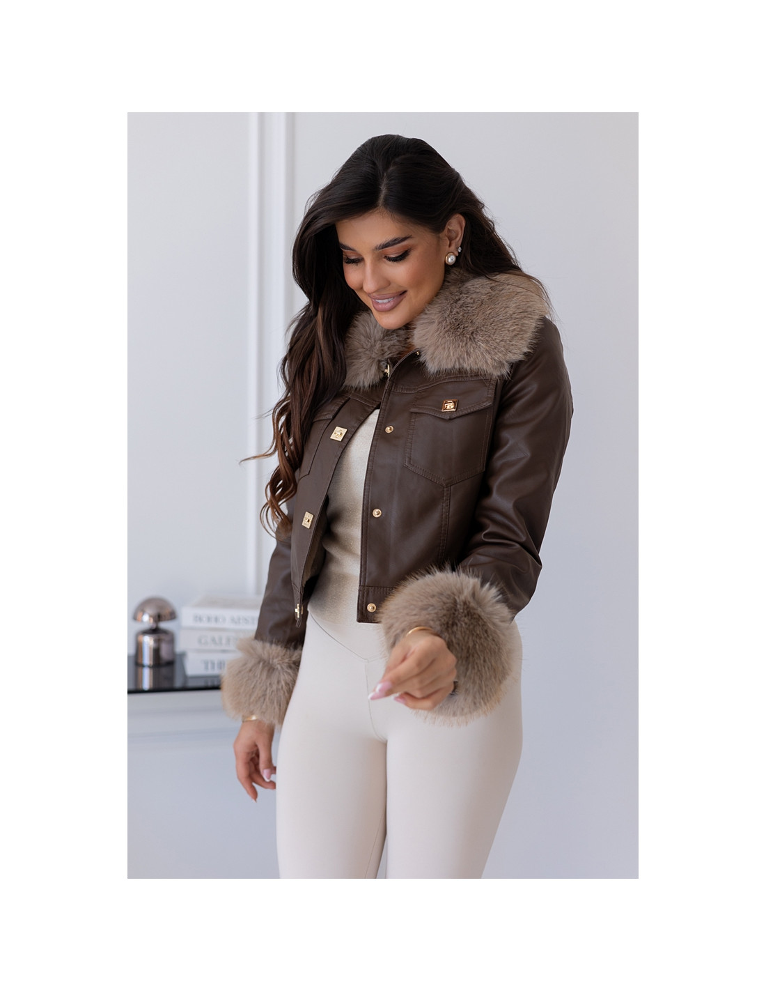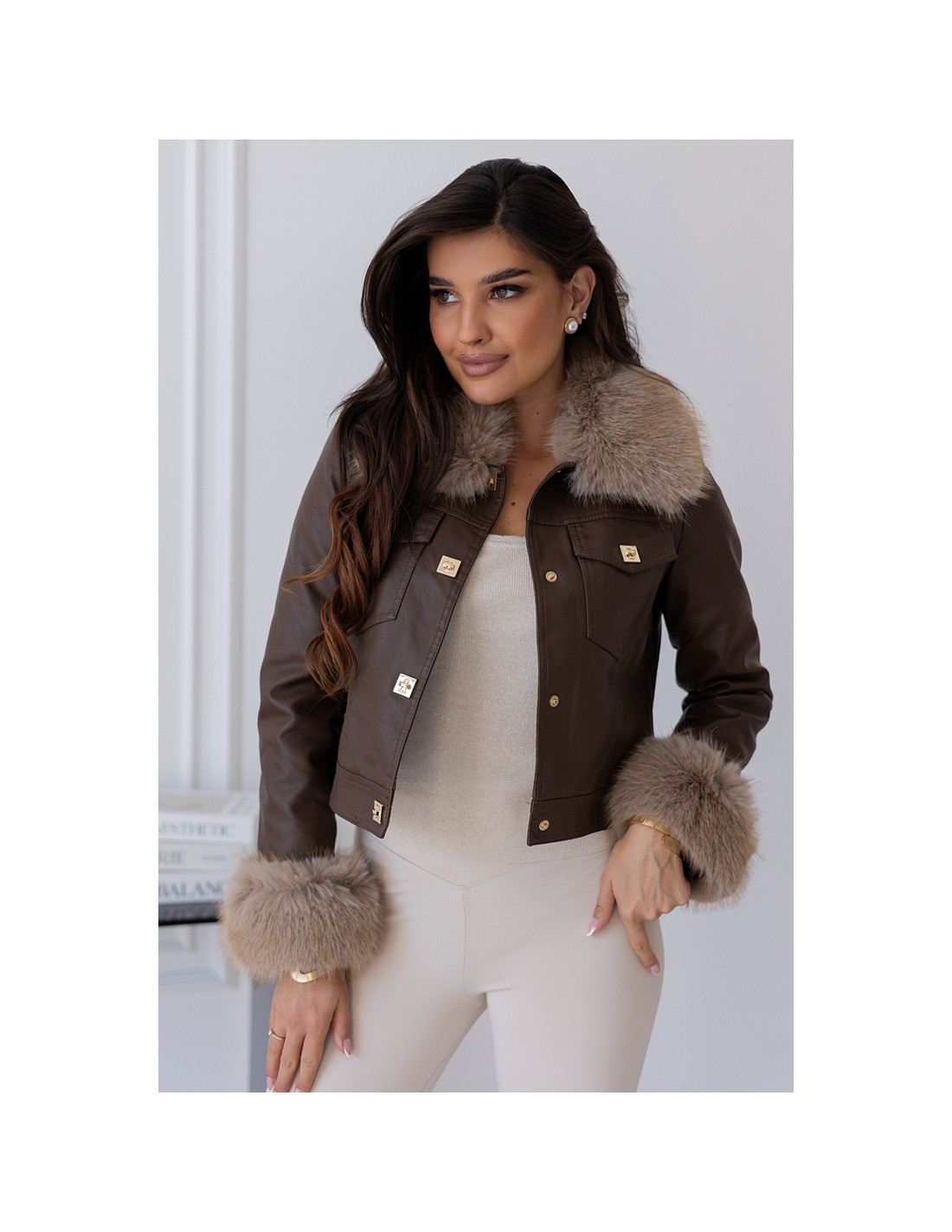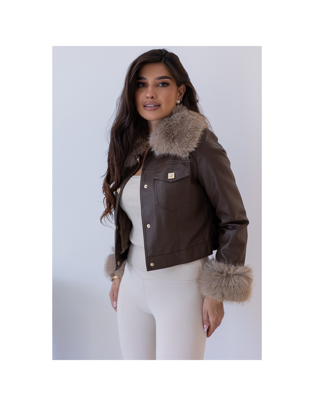 Modna i stylowa kurtka z eko skaju z dodatkiem - odpinanego futerka na kołnierzyku oraz na rękawkach. Zapinana na złote klipsy. Taliowany i dopasowany model. W podszewkę wszyty ocieplacz-miś. Idealna propozycja na zimne dni.
