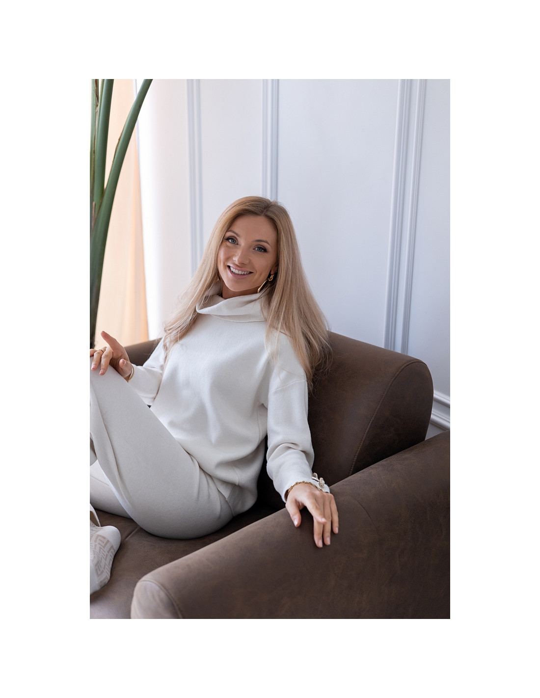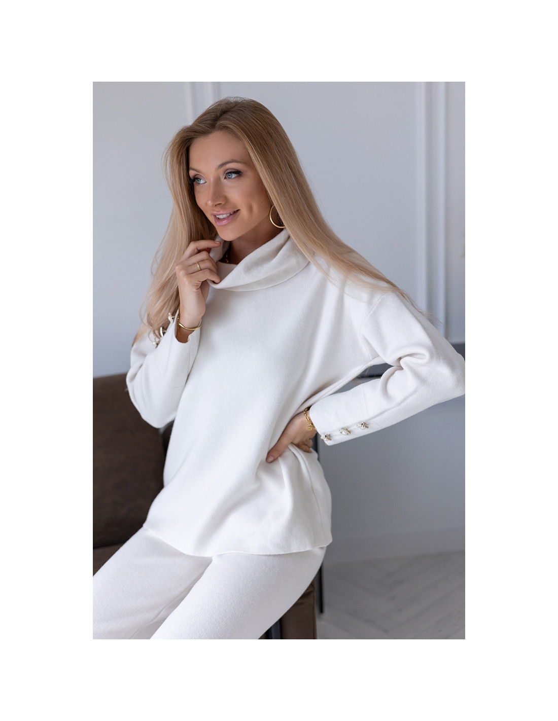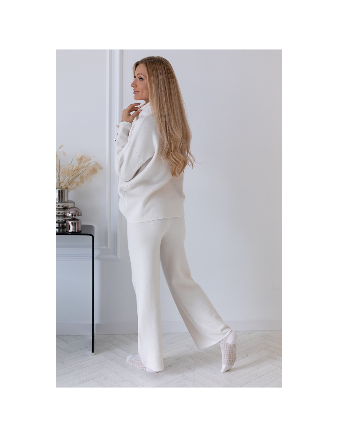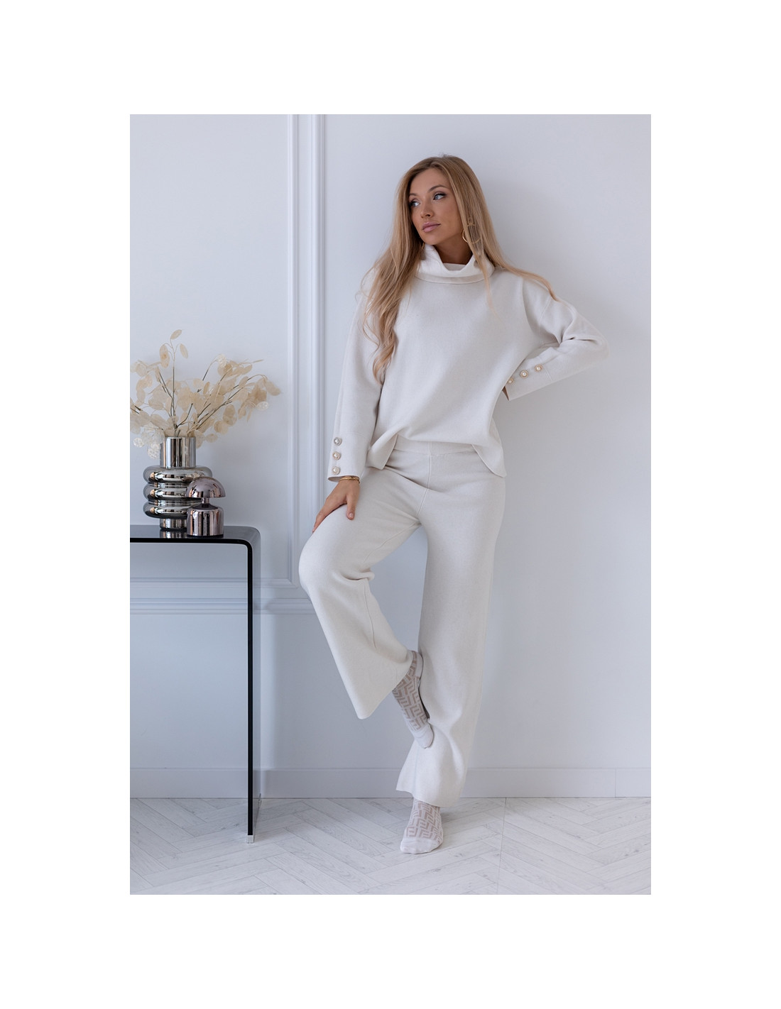 Piękny komplet składający się ze sweterka i luźnych spodni. Sweterkowy materiał, bardzo wygodny i elastyczny. Sweterek z golfem, rękawki obniżone. Na znamionach złote guziki. Spodnie posiadają wysoki stan i gumę w pasie.
