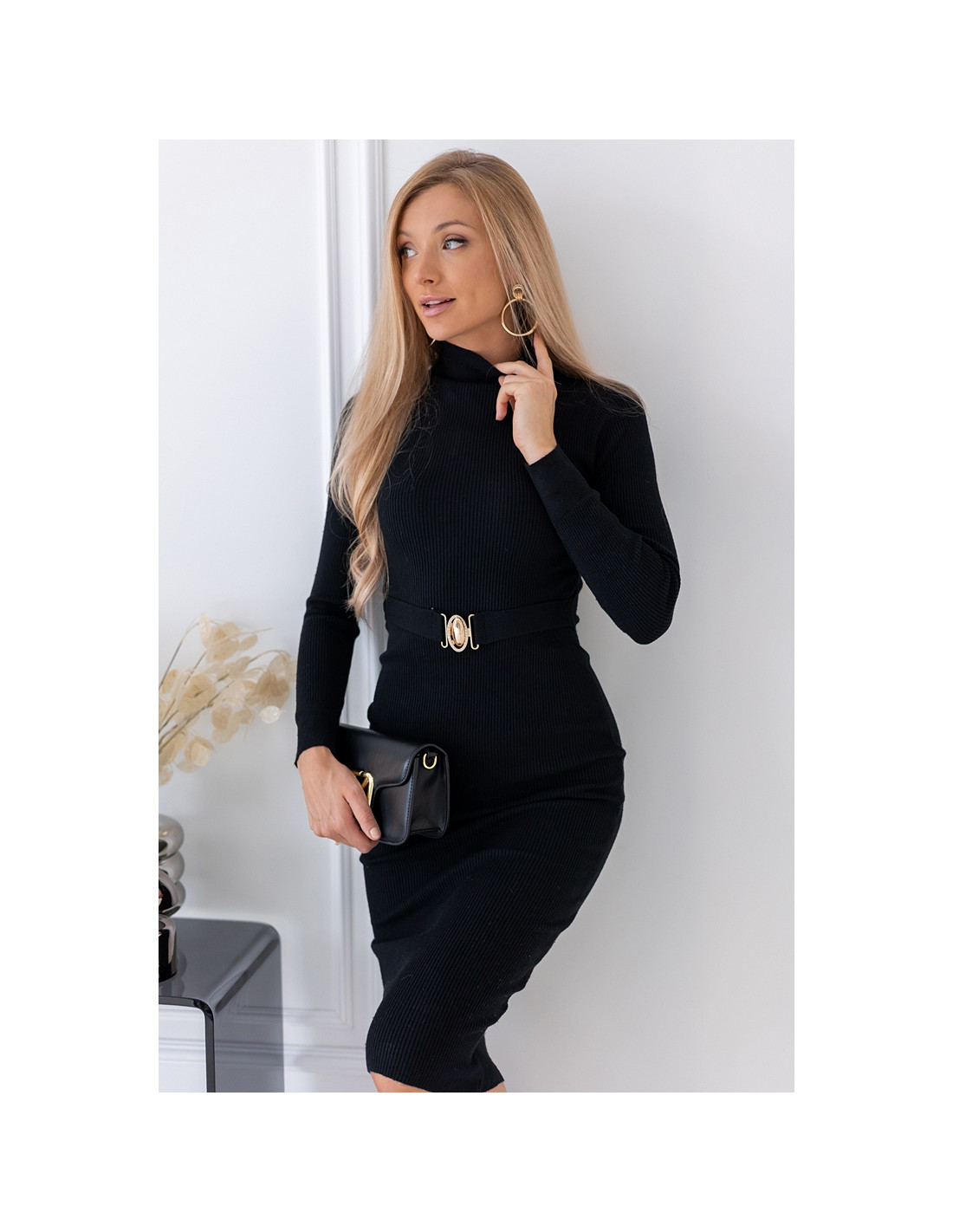 Dopasowana sukienka z prążkowanego materiału z ozdobną złotą klamerką.  Idealna na świąteczne spotkania.