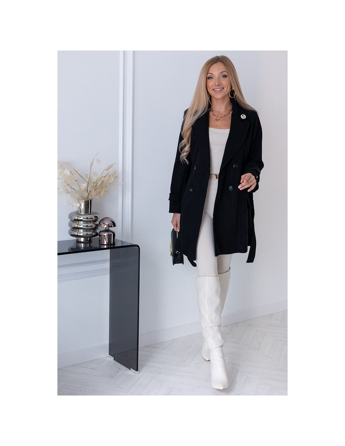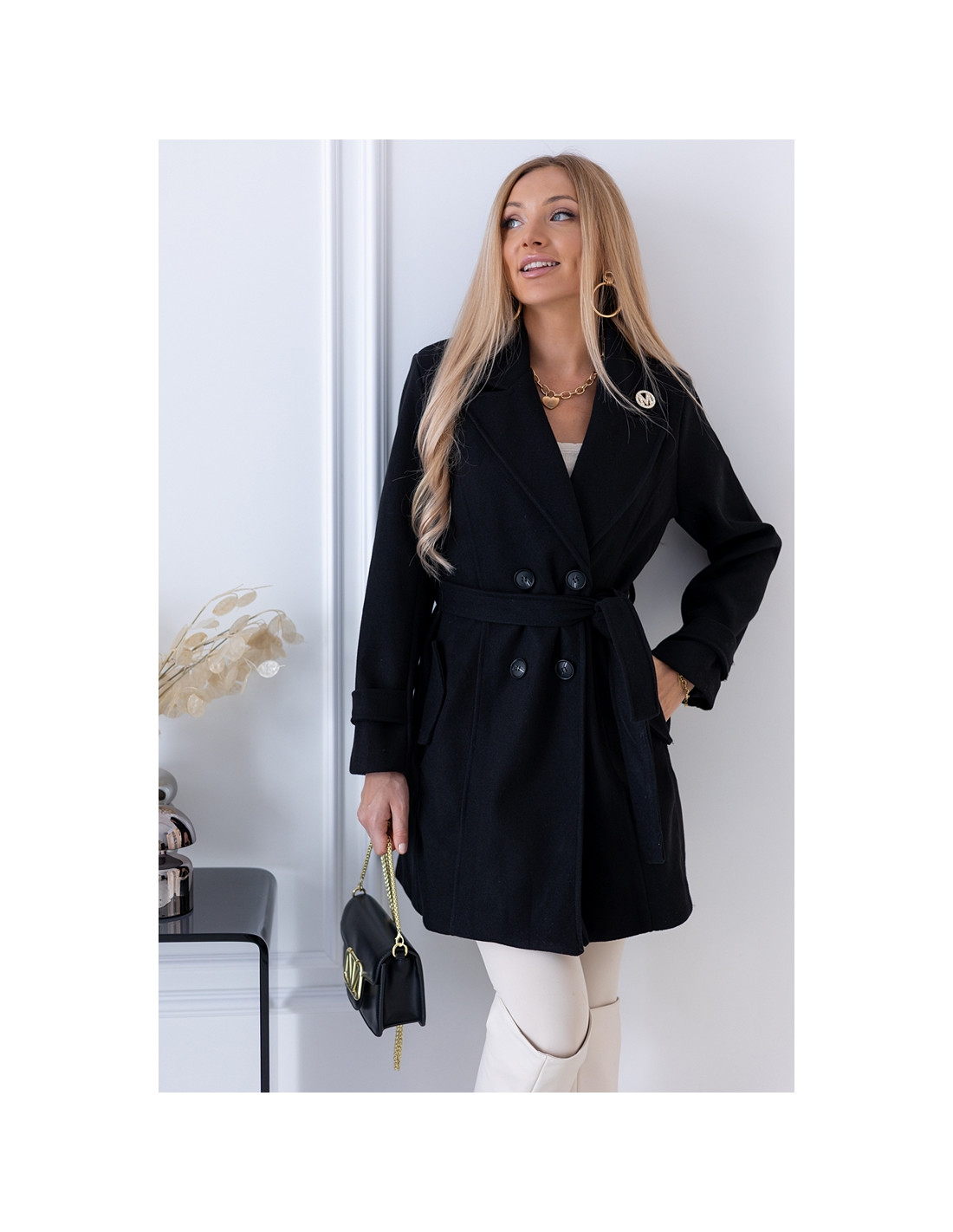 Krótki elegancki płaszczyk na podszewce posiada 4 guziki,pasek oraz poduszki na ramionach.
