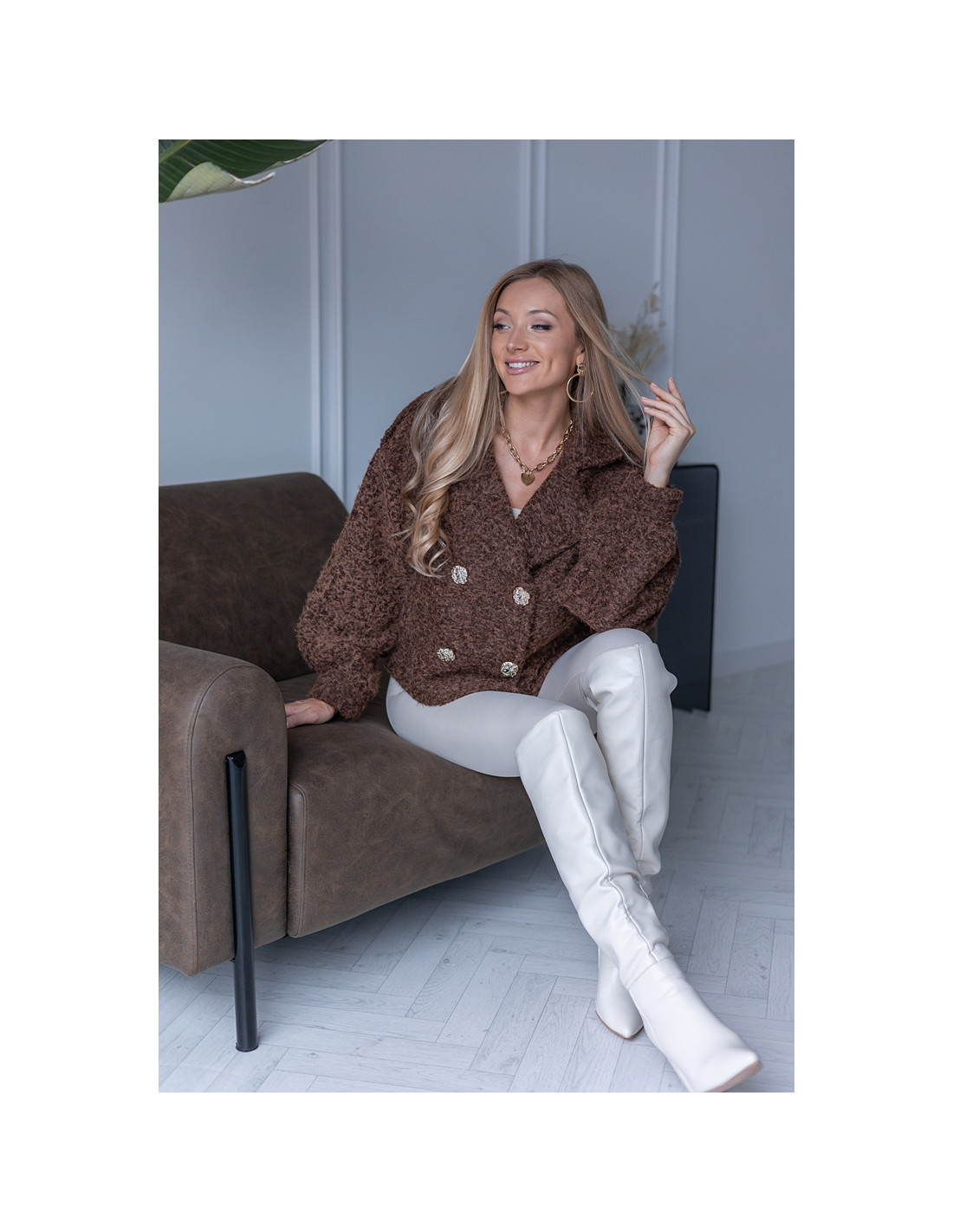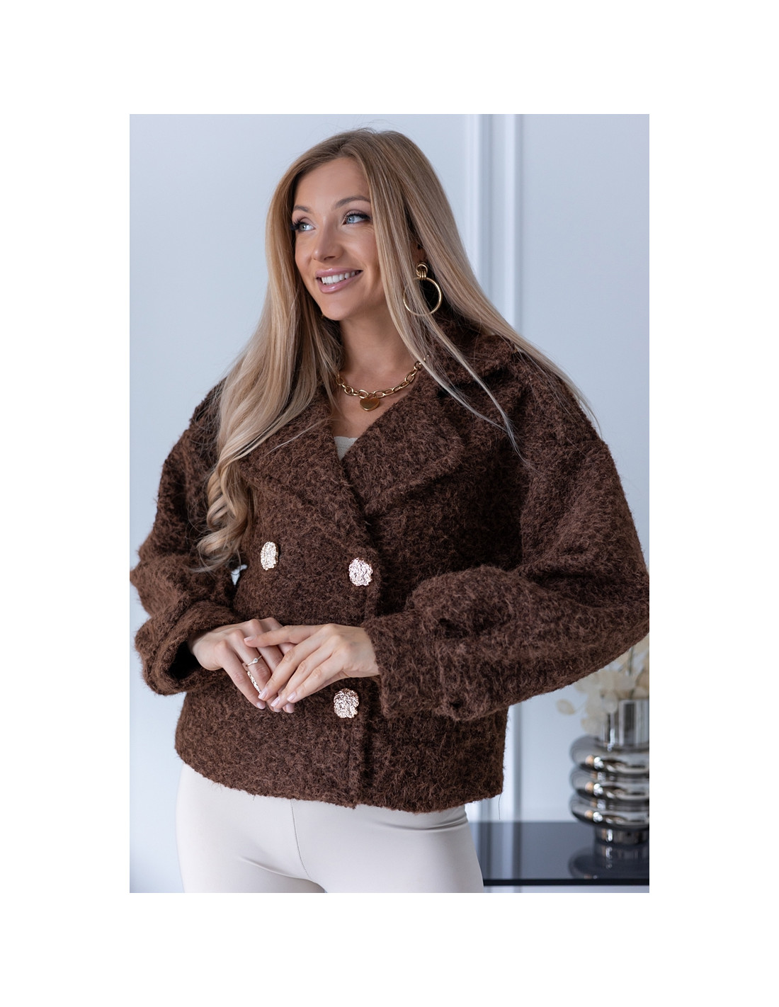 Kurtka przejściowa o kroju ramoneski, zapinana na piękne złote guziki, posiada pagony na ramionach i najmodniejsze w tym sezonie bufiaste rękawy.