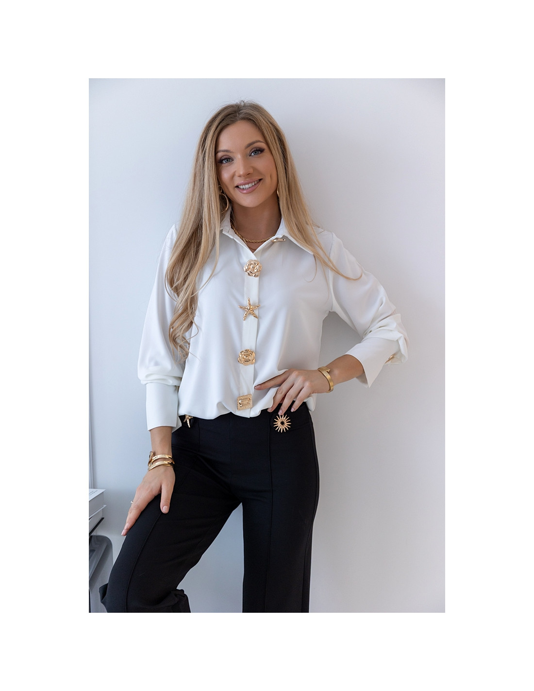 Elegancka koszula z kołnierzem, zapinana na guziki. Posiada ozdobne złote broszki. Rękawek zakończony szerokim mankietem z zapięciem na duży złoty guzik.