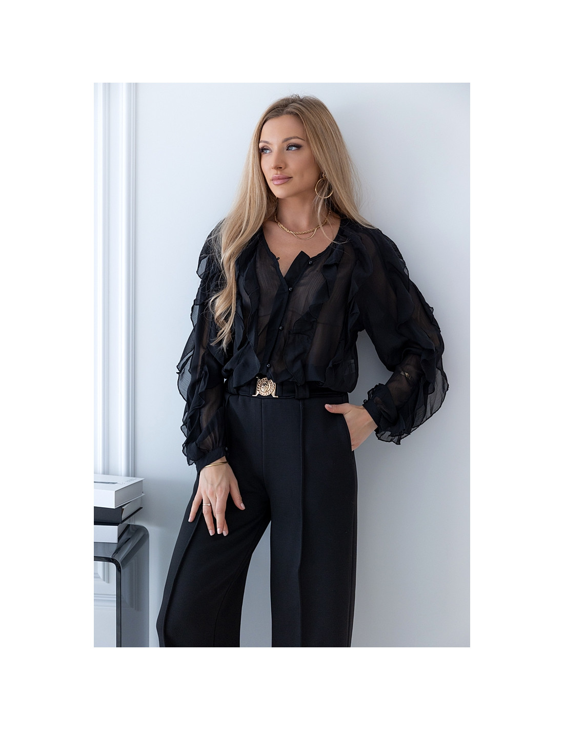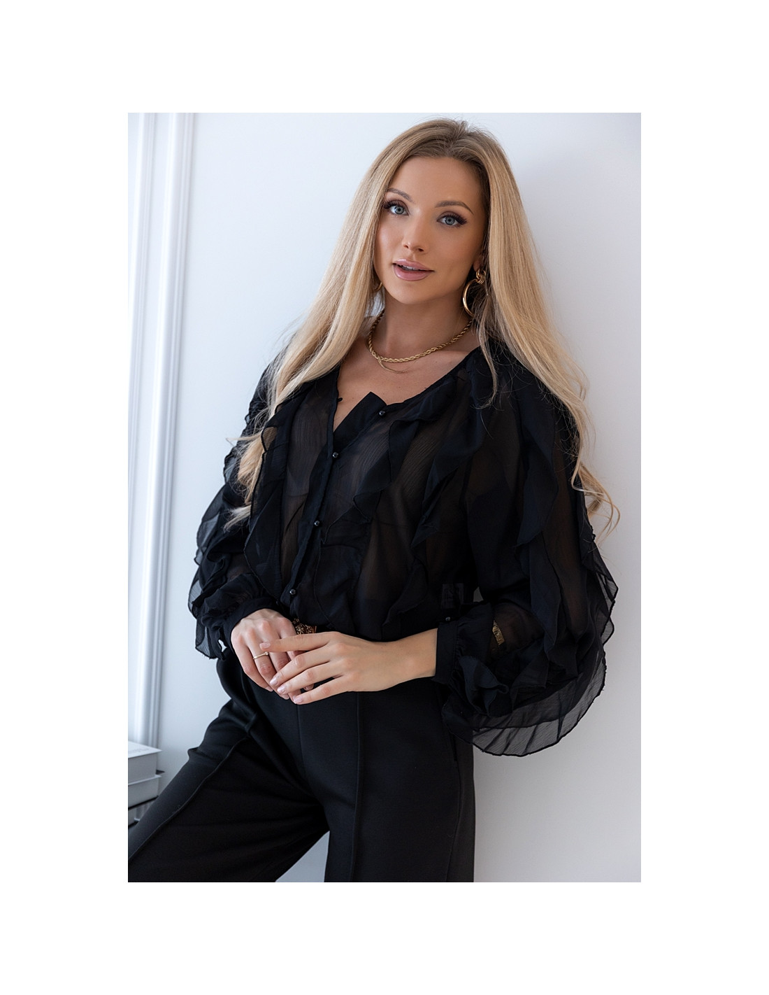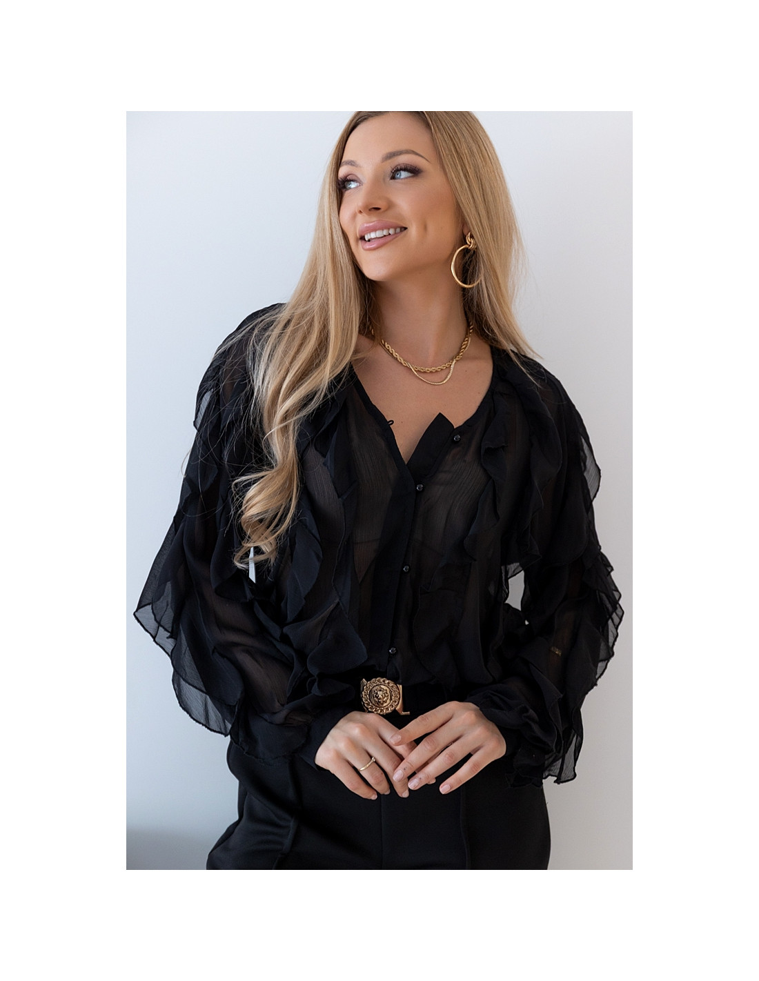 Piękna i zwiewna bluzeczka z żorżety w załości obszyta zwiewnymi falbanami. Rękawki poszerzane. Zapinana na guziczki.