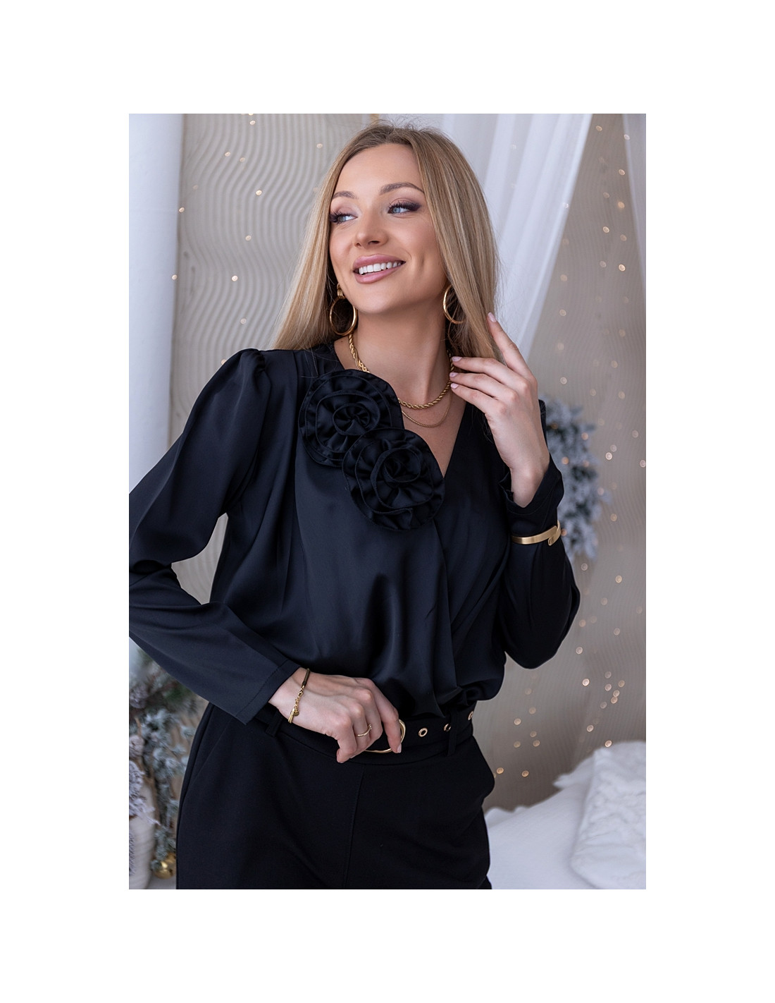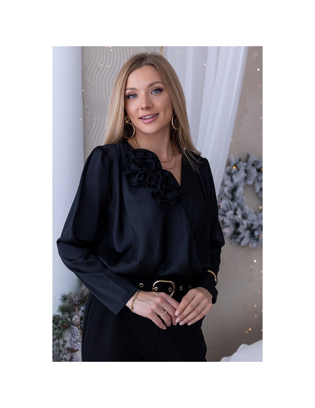 Śliczna bluzka z satyny. Z przodu - na dole posiada gumkę, która tworzy eleganckie marszczenie, tył bluzki przedłużony. Bluzka idealnie się sprawdzi do eleganckich spodni i spódnic. Posiada dopinane róże, które możesz odpiąć.