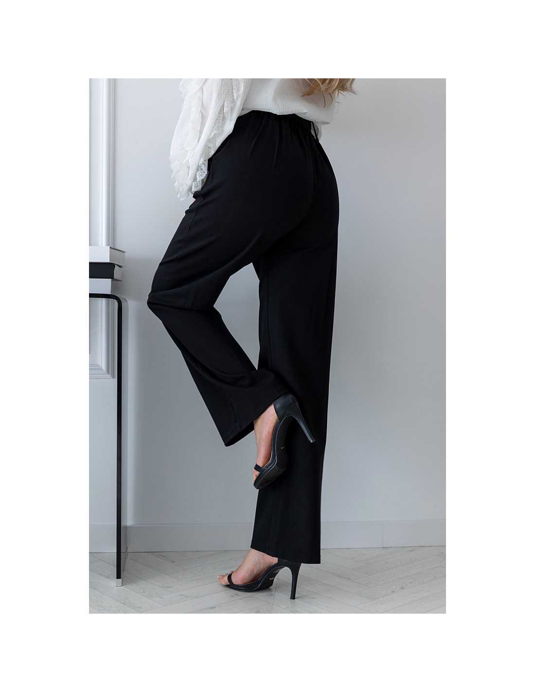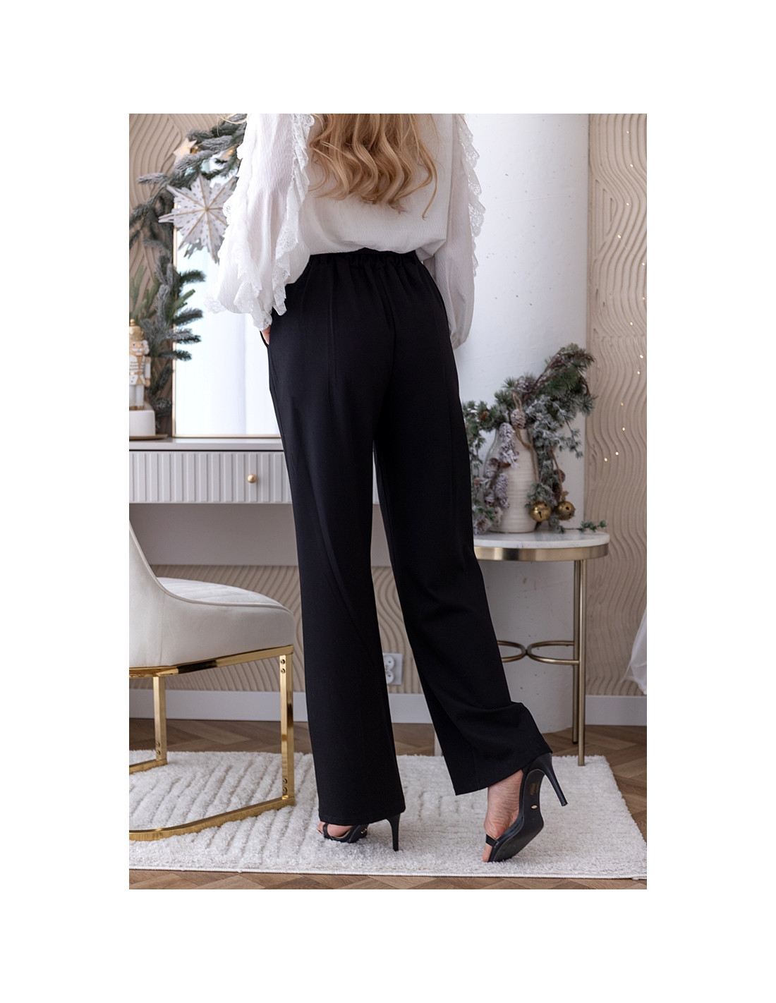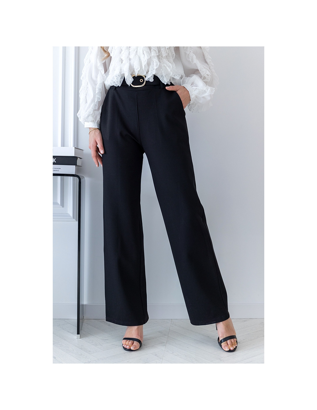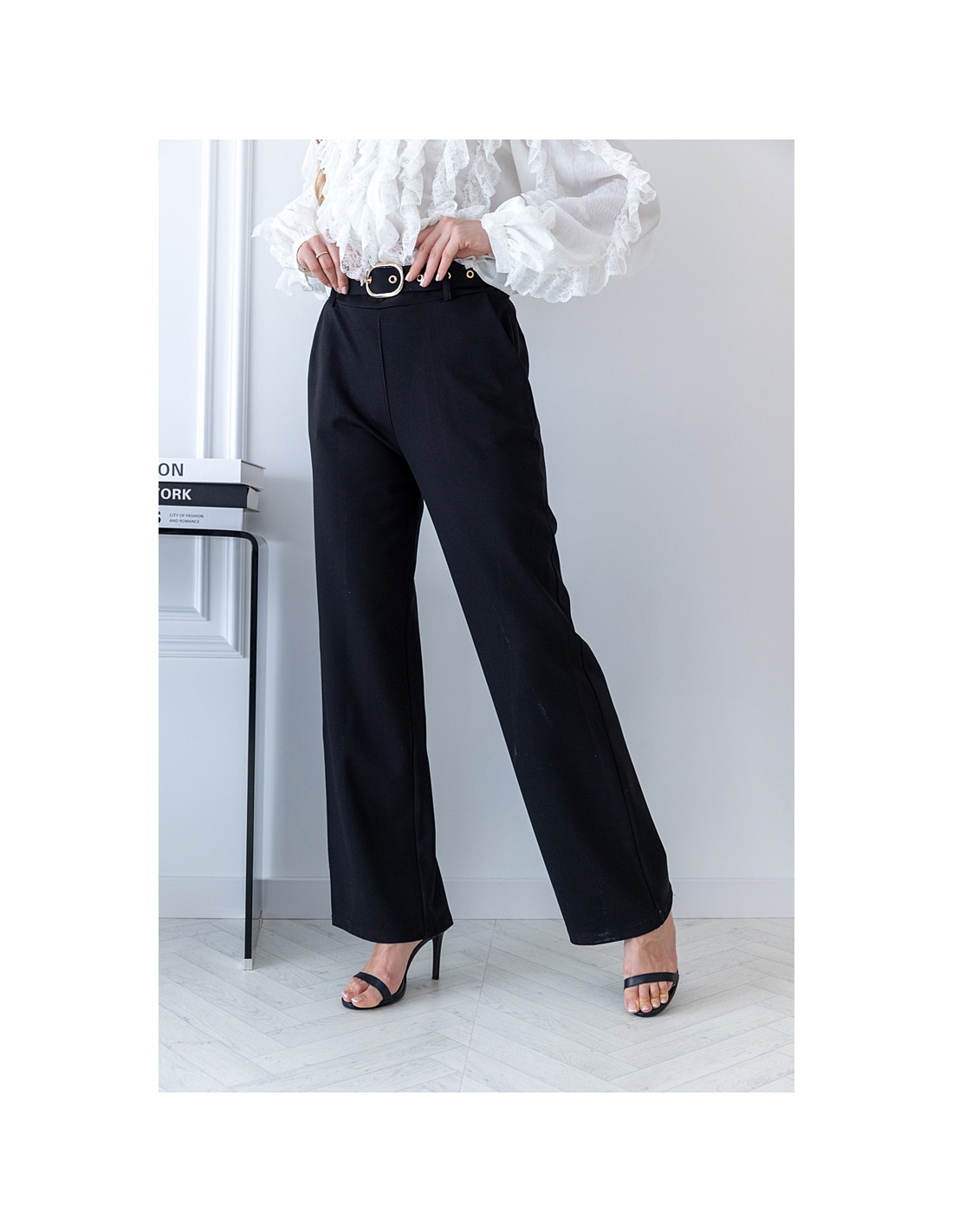 Eleganckie spodnie z wysokim stanem. Z tyłu guma, w tali pasek ze złotą klamrą. Posiadają kieszenie. Bardzo wygodny i swobodny model.