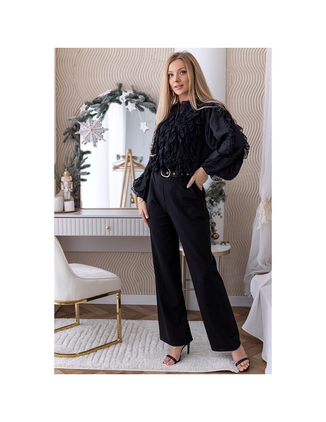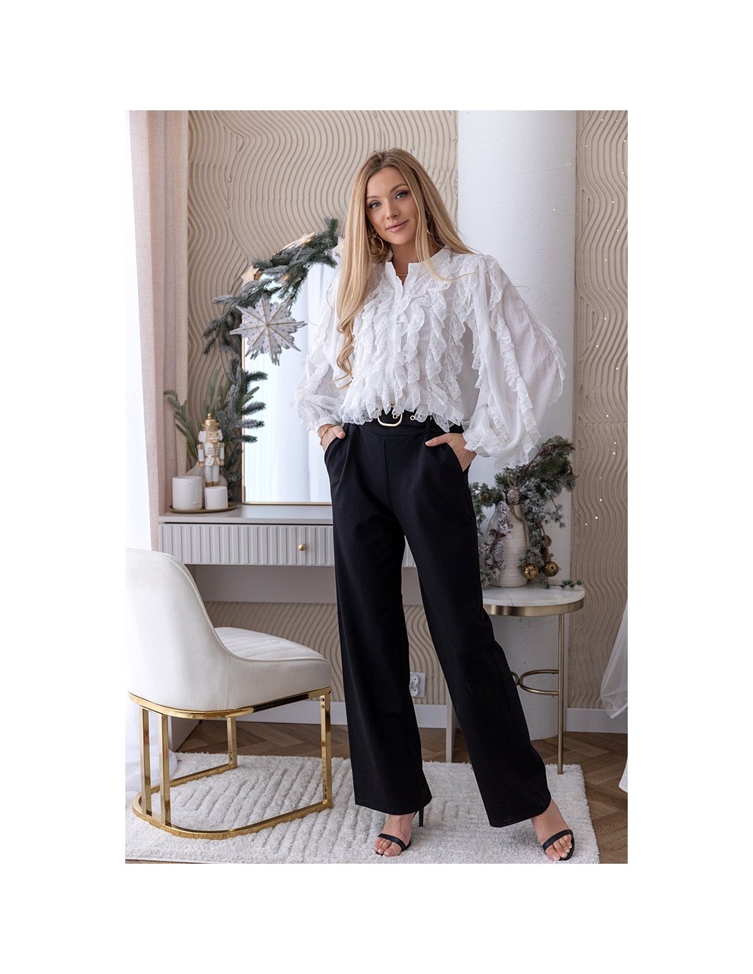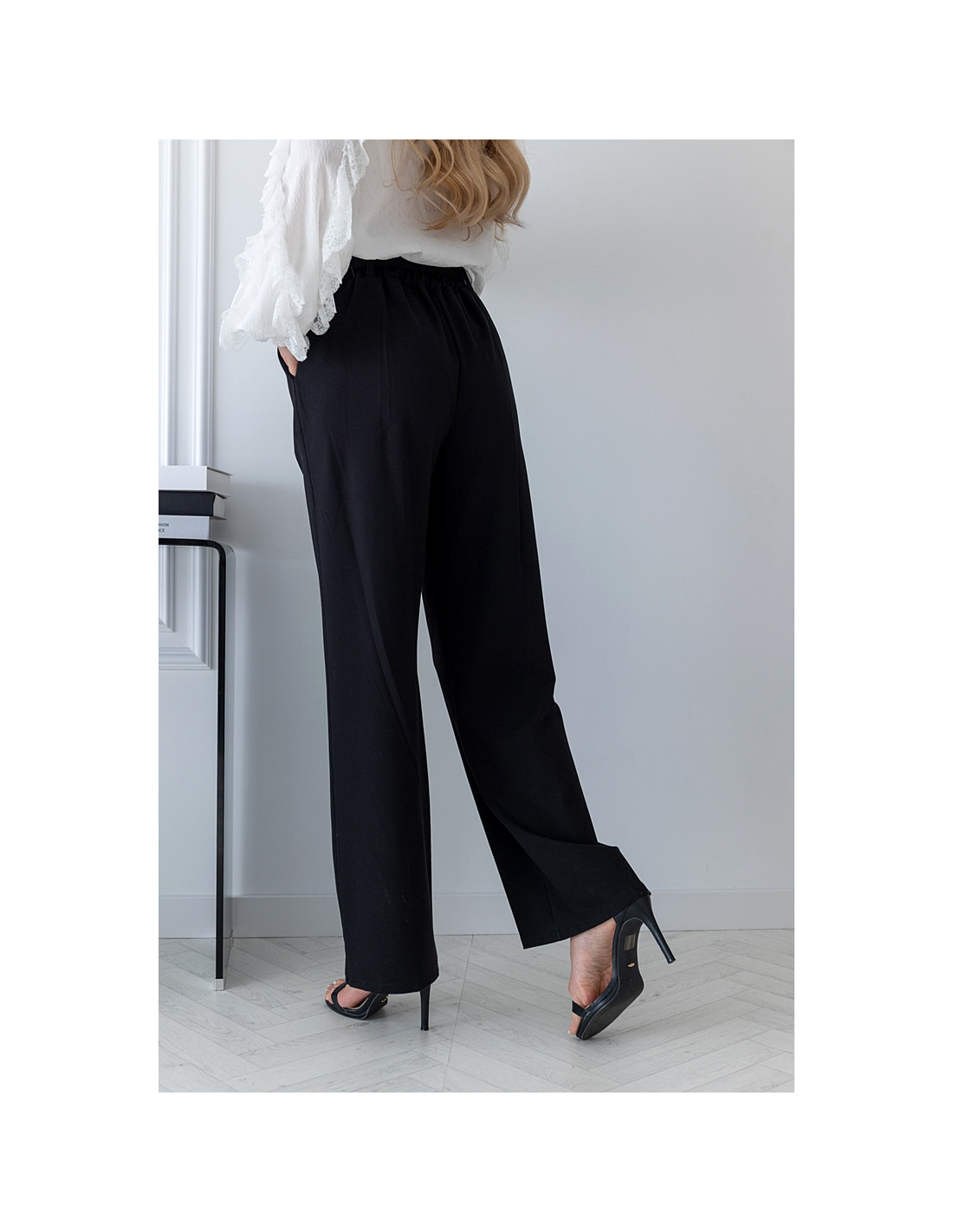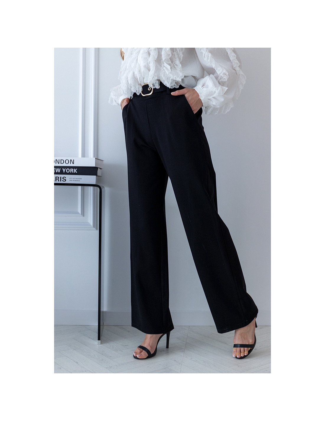 Eleganckie spodnie z wysokim stanem. Z tyłu guma, w tali pasek ze złotą klamrą. Posiadają kieszenie. Bardzo wygodny i swobodny model.