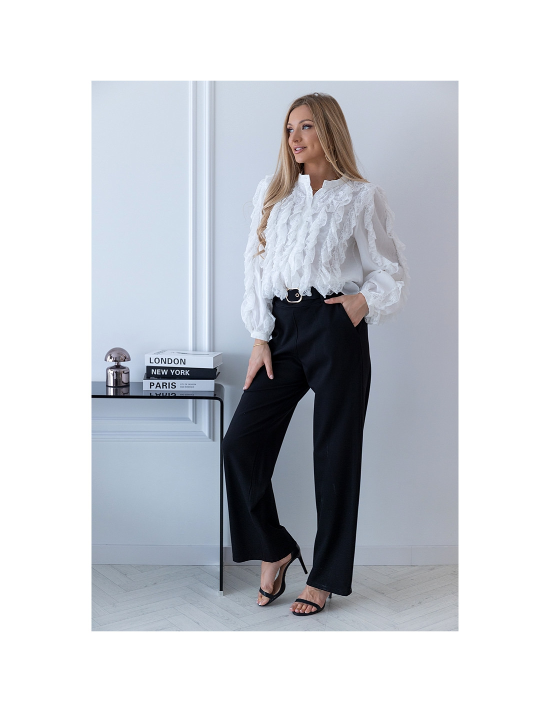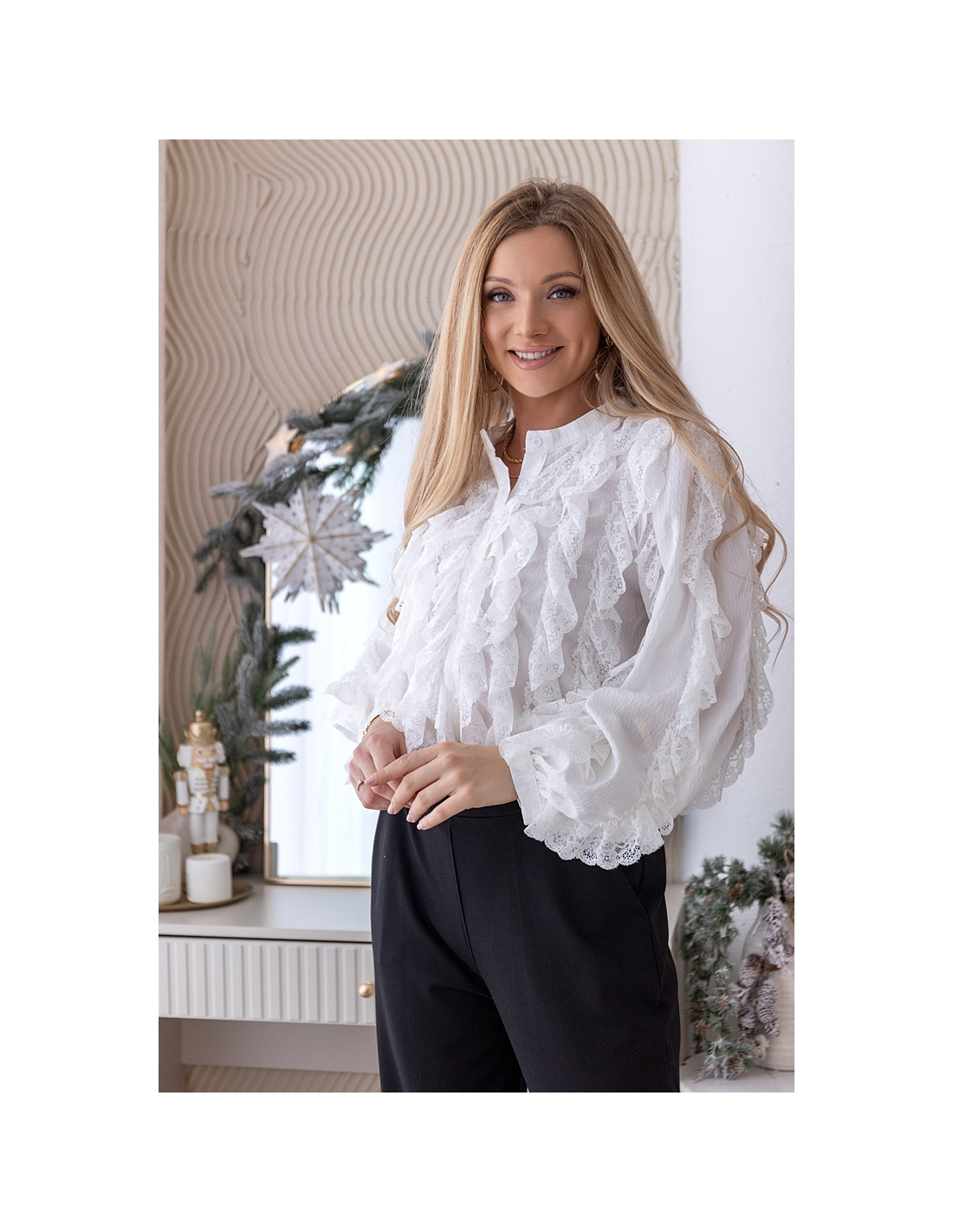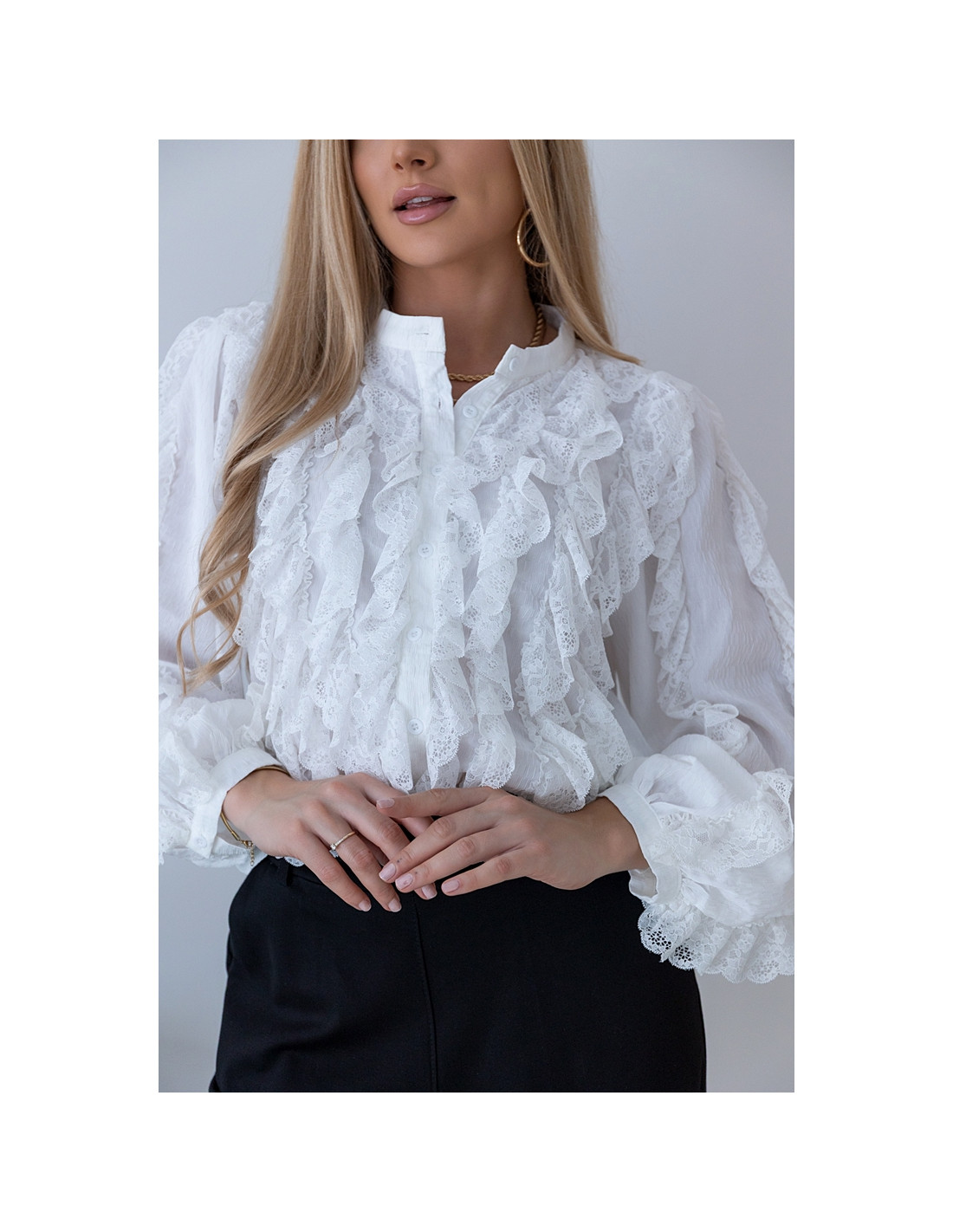 Piękna koszula obszywana koronkami. Rękawki poszerzone zakończone ściągaczami z zapięciem. Koszula w całości zapinana na guziczki. Materiał zwiewny.