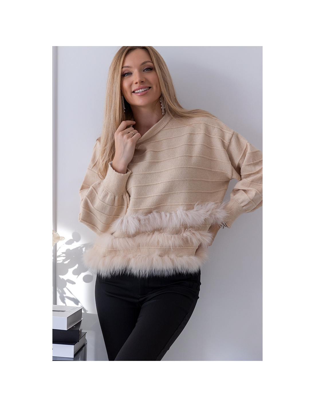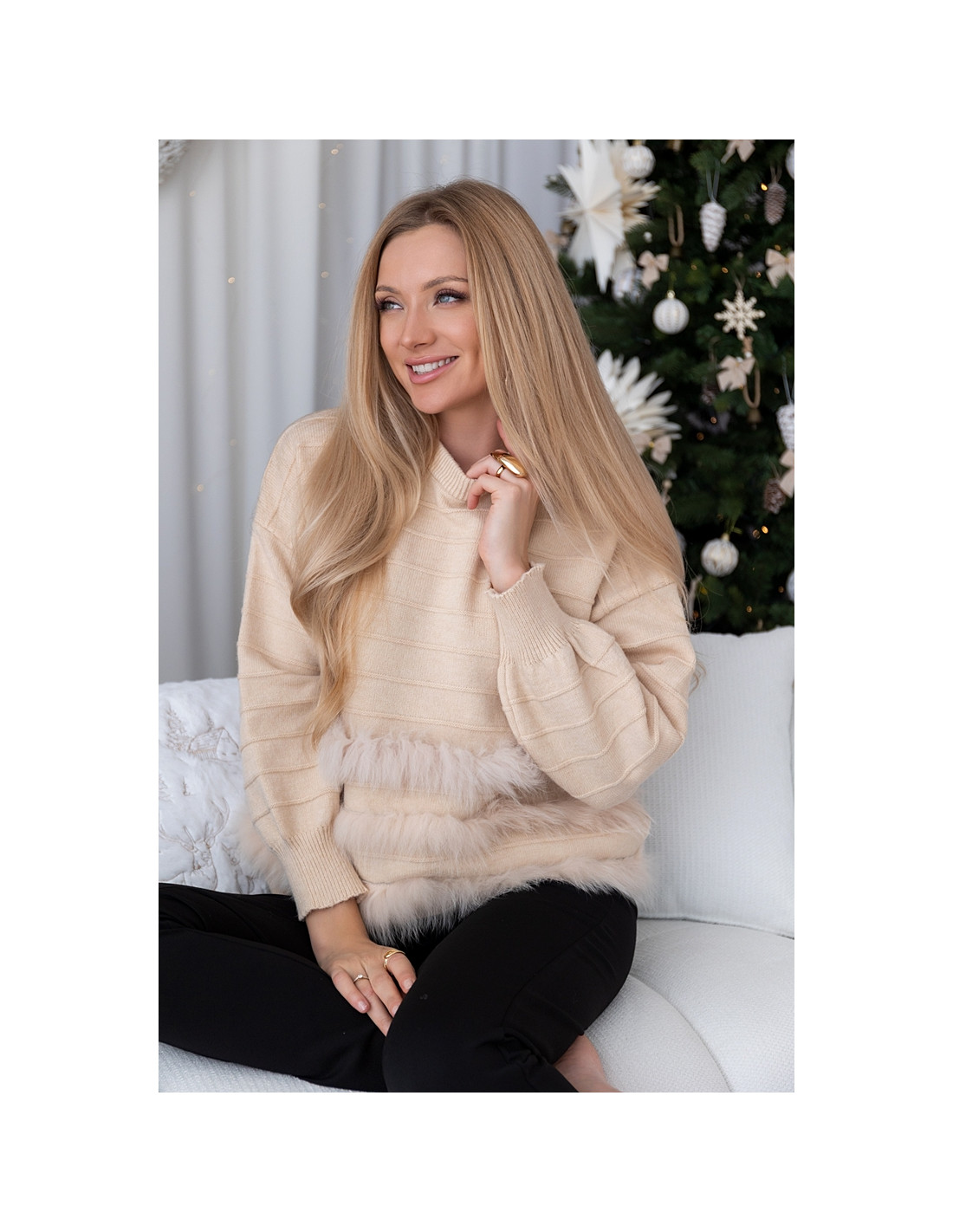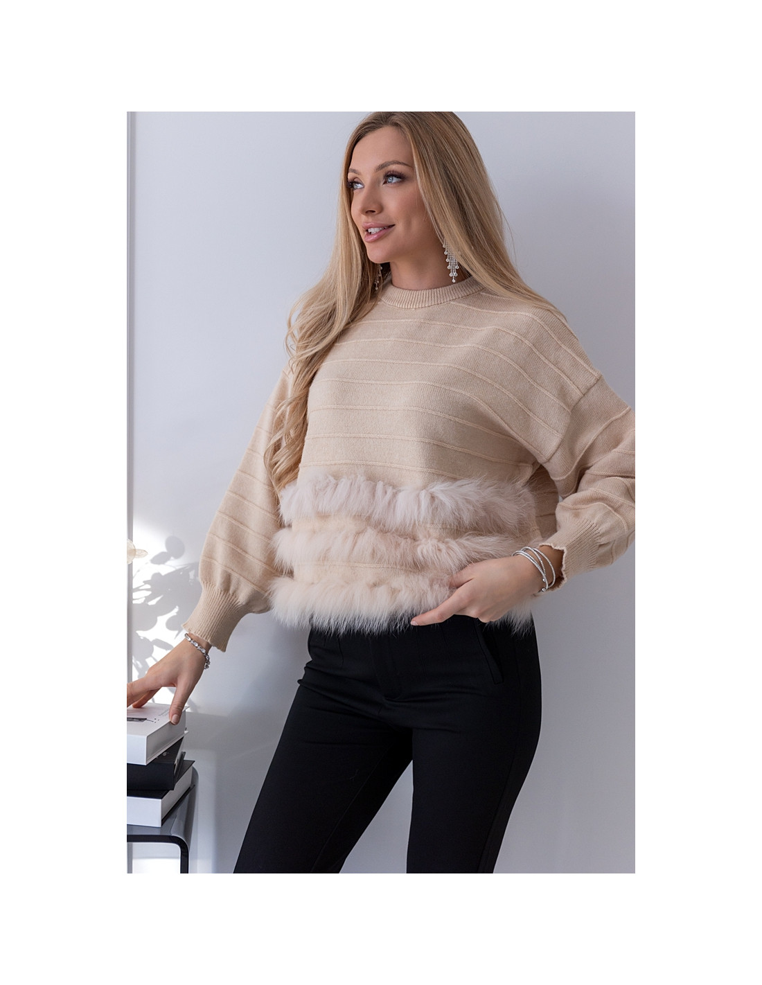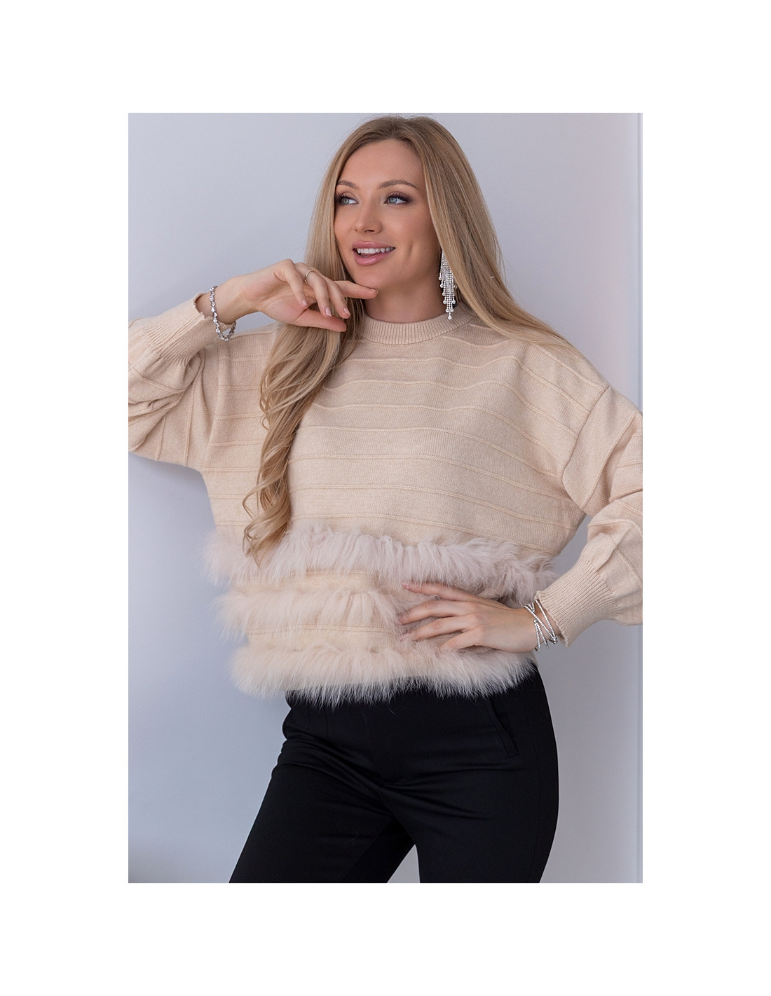 Śliczny sweterek o oversizowym kroju. Rękawki i dół, zakończone ściągaczami. Ciepły i nie gryzący materiał. Dołem ozdobne futerko.