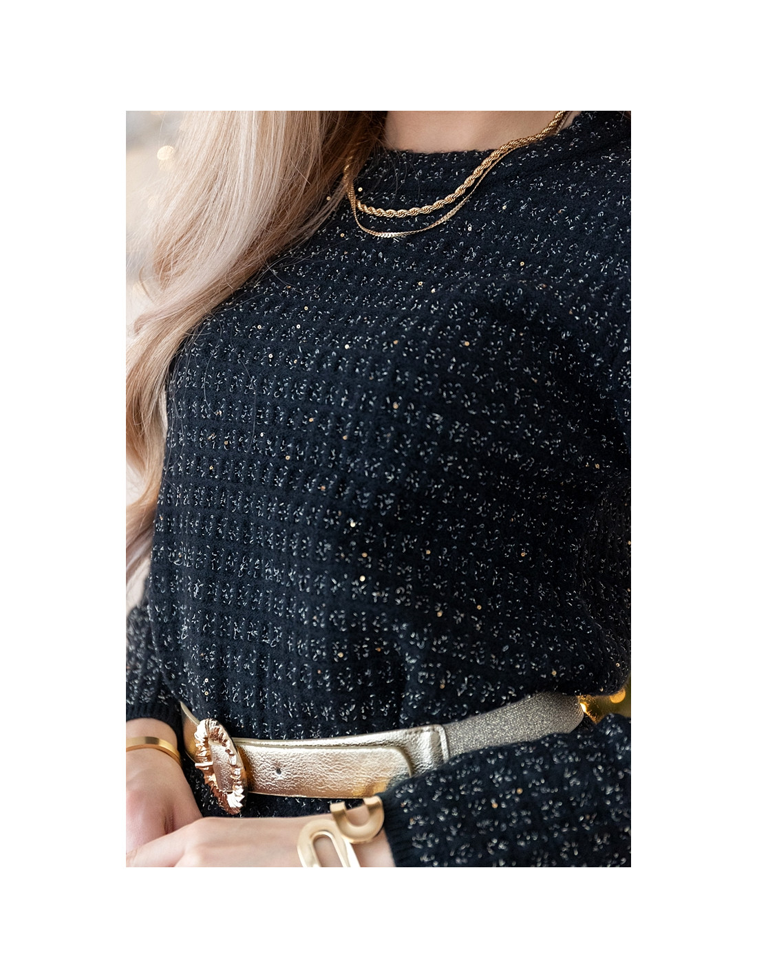Czarna dzianinowa sukienka o subtelnej strukturze „waffle” to połączenie klasy, wygody i kobiecego stylu. Miękka, elastyczna tkanina pięknie dopasowuje się do sylwetki, jednocześnie nie opinając ciała. Model o prostym kroju z długością mini, idealnie sprawdzi się zarówno na co dzień, jak i na wyjątkowe okazje – od rodzinnych świąt po zimowe przyjęcia.