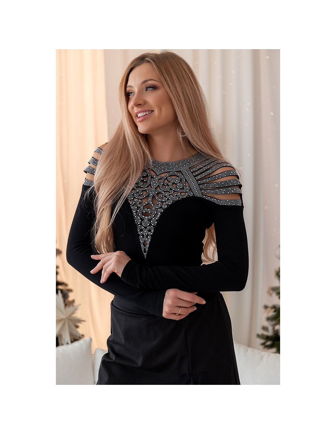 Elegancka czarna bluzka z efektowną aplikacją z kryształków i ażurowymi wycięciami na dekolcie oraz ramionach. Model o dopasowanym kroju, wykonany z elastycznego, przyjemnego w dotyku materiału. Idealna na święta, imprezę, randkę czy wieczorne wyjścia – wygląda luksusowo bez potrzeby dodatkowych dodatków. Wystarczy spódnica, spodnie lub eleganckie szorty i stylizacja gotowa.