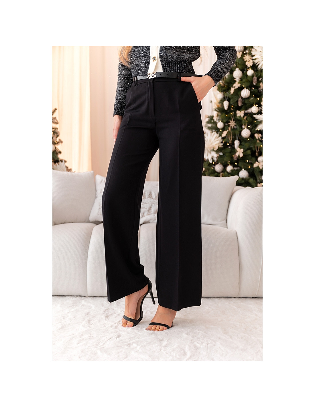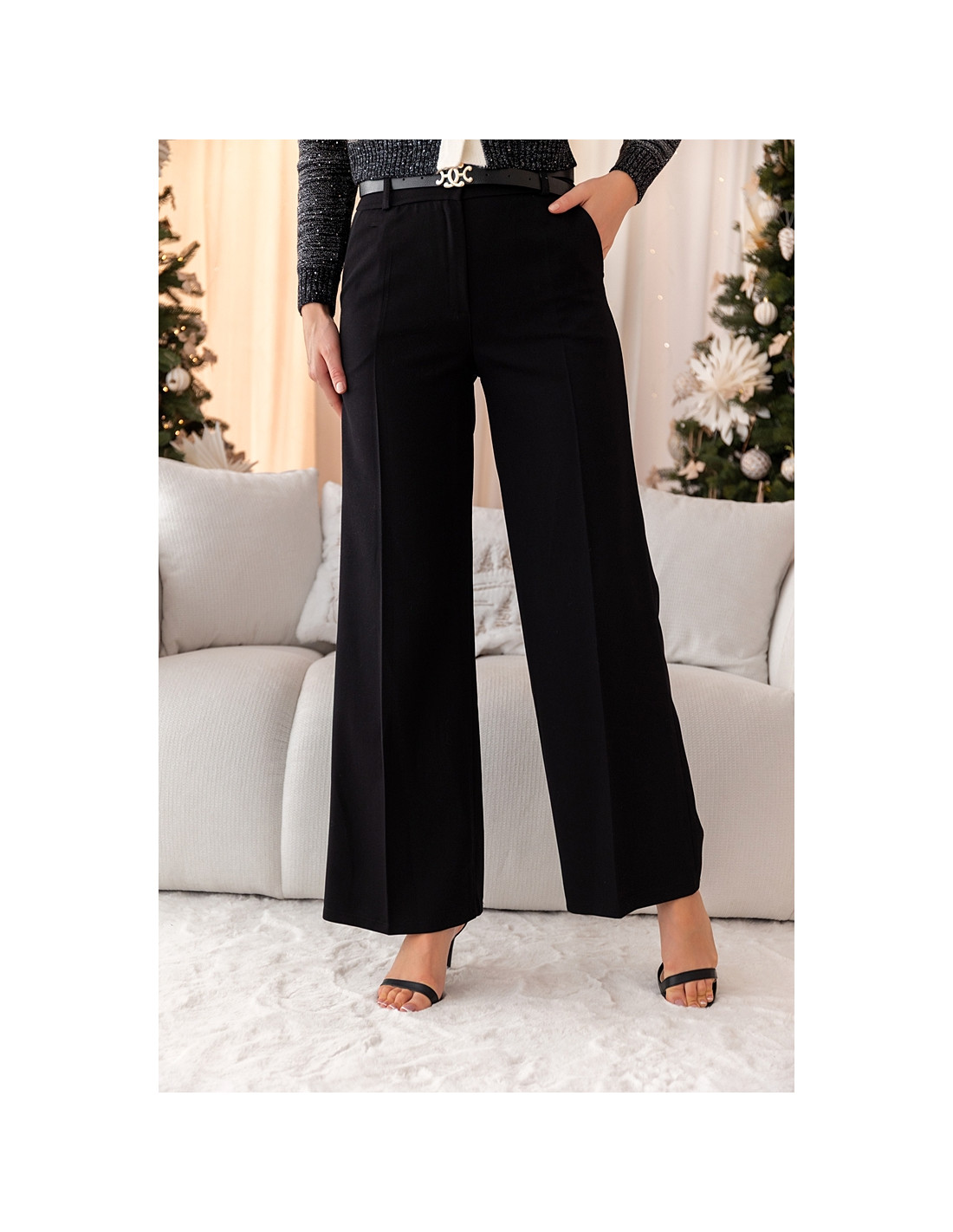 Eleganckie czarne spodnie o szerokiej, lekko rozszerzanej nogawce – idealne do stylizacji biurowych, świątecznych i wieczorowych. Wykonane z gładkiego, nieprześwitującego materiału, pięknie układają się na sylwetce i wydłużają nogi. Klasyczny krój z kantem, zapinane na zamek i guzik, z kieszeniami po bokach. Ponadczasowy model, który pasuje zarówno do koszuli, jak i swetra czy dopasowanego topu. Pasek w zestawie.