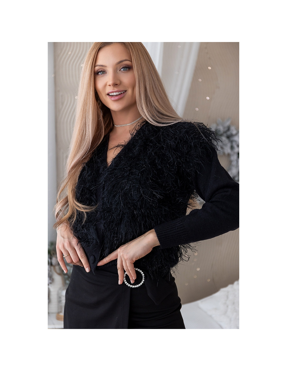 Czarny, krótki kardigan z ozdobnym, piórkowym wykończeniem na przodzie – idealny wybór, gdy chcesz dodać stylizacji szyku i wieczorowego charakteru. Miękki, ciepły i elastyczny, zapinany na guziki, z dekoltem w kształcie litery V, który pięknie podkreśla biżuterię. Świetnie sprawdzi się do eleganckich spodni, spódnic czy satynowego topu. Idealny na święta, kolacje, imprezy i wszystkie „specjalne okazje”, kiedy zwykły sweter to za mało.