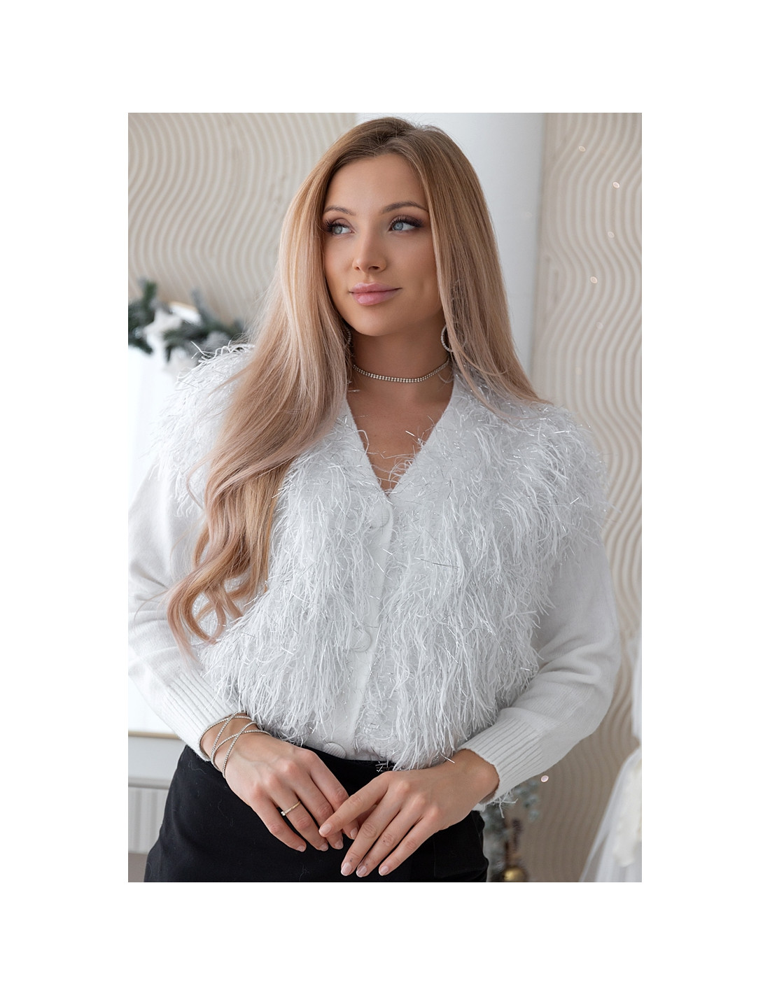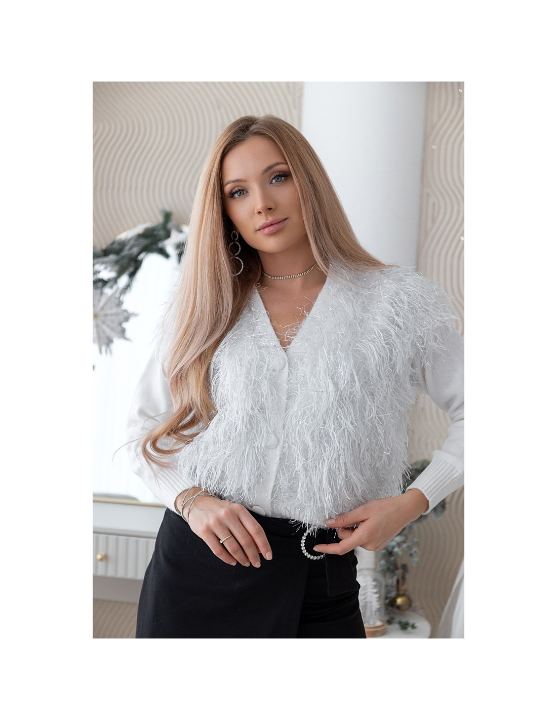 Biały, krótki kardigan z ozdobnym, piórkowym wykończeniem na przodzie – idealny wybór, gdy chcesz dodać stylizacji szyku i wieczorowego charakteru. Miękki, ciepły i elastyczny, zapinany na guziki, z dekoltem w kształcie litery V, który pięknie podkreśla biżuterię. Świetnie sprawdzi się do eleganckich spodni, spódnic czy satynowego topu. Idealny na święta, kolacje, imprezy i wszystkie „specjalne okazje”, kiedy zwykły sweter to za mało.
