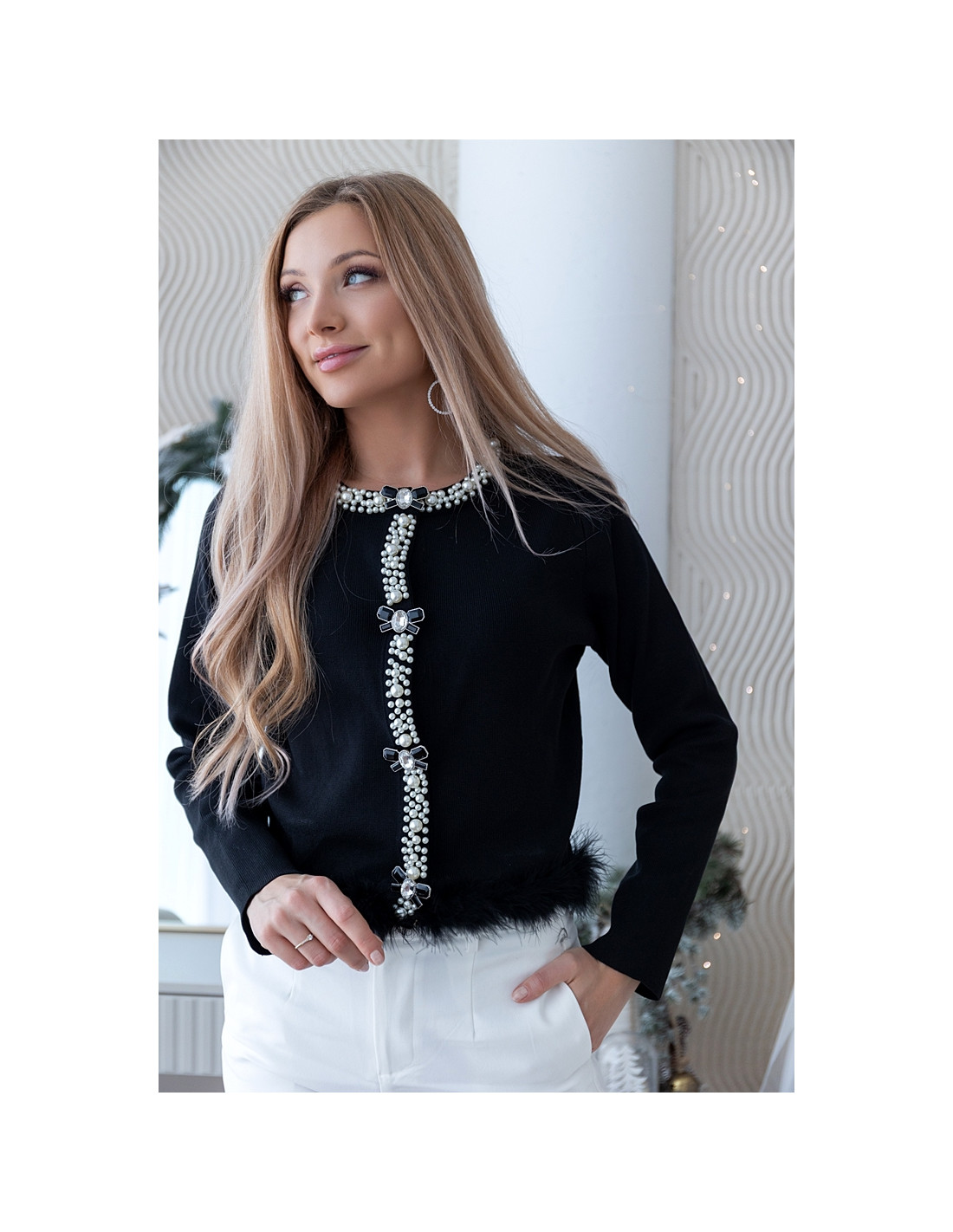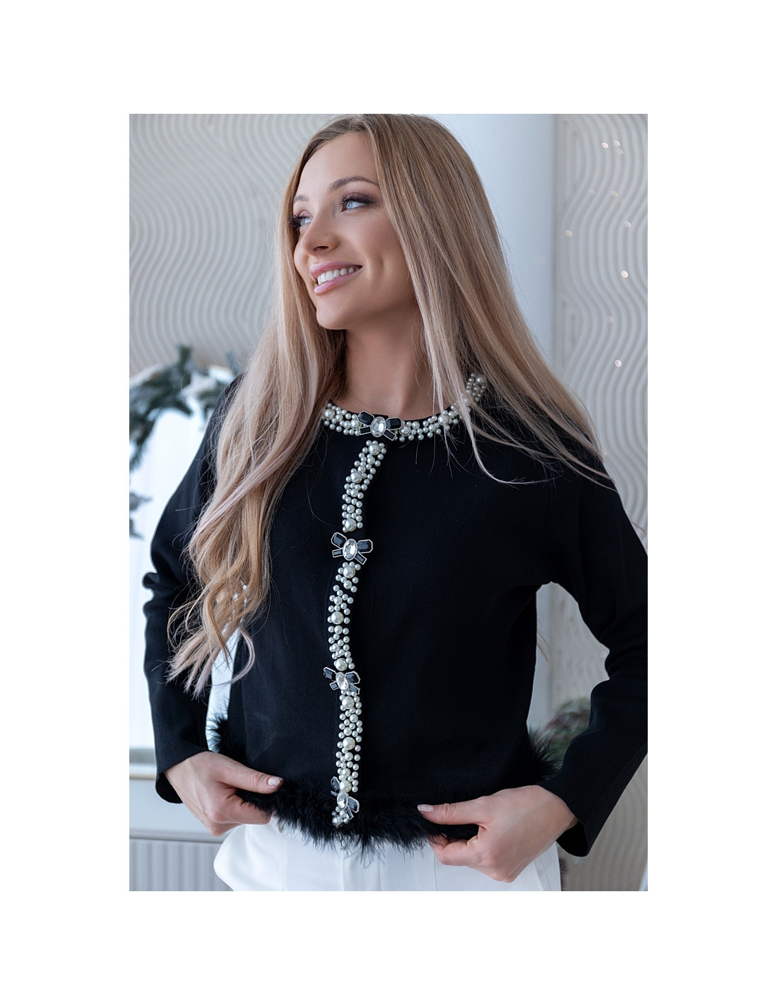Sweterek z efektowną biżuteryjną aplikacją z pereł i kryształków oraz zdobieniu z piórek dołem. Zapina się na kabzle. Model o klasycznym kroju, który dzięki zdobieniu nabiera wyjątkowego, wieczorowego charakteru – idealna propozycja na święta, kolację, imprezę lub eleganckie wyjście. Wystarczy połączyć ją z prostymi spodniami lub spódnicą, a stylizacja od razu robi wrażenie bez dodatkowych dodatków.