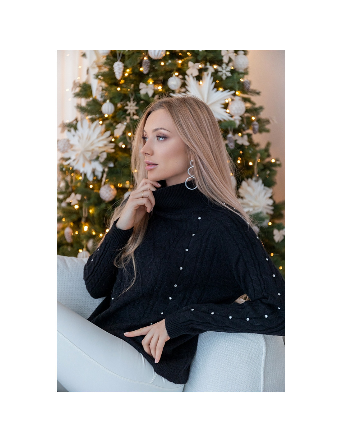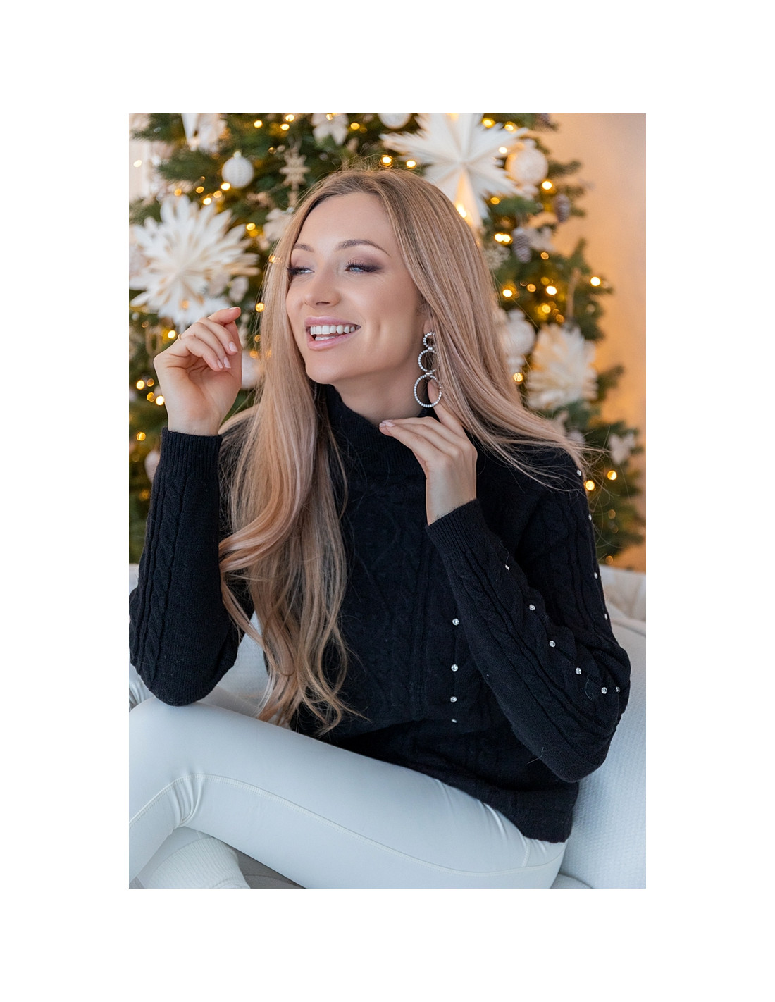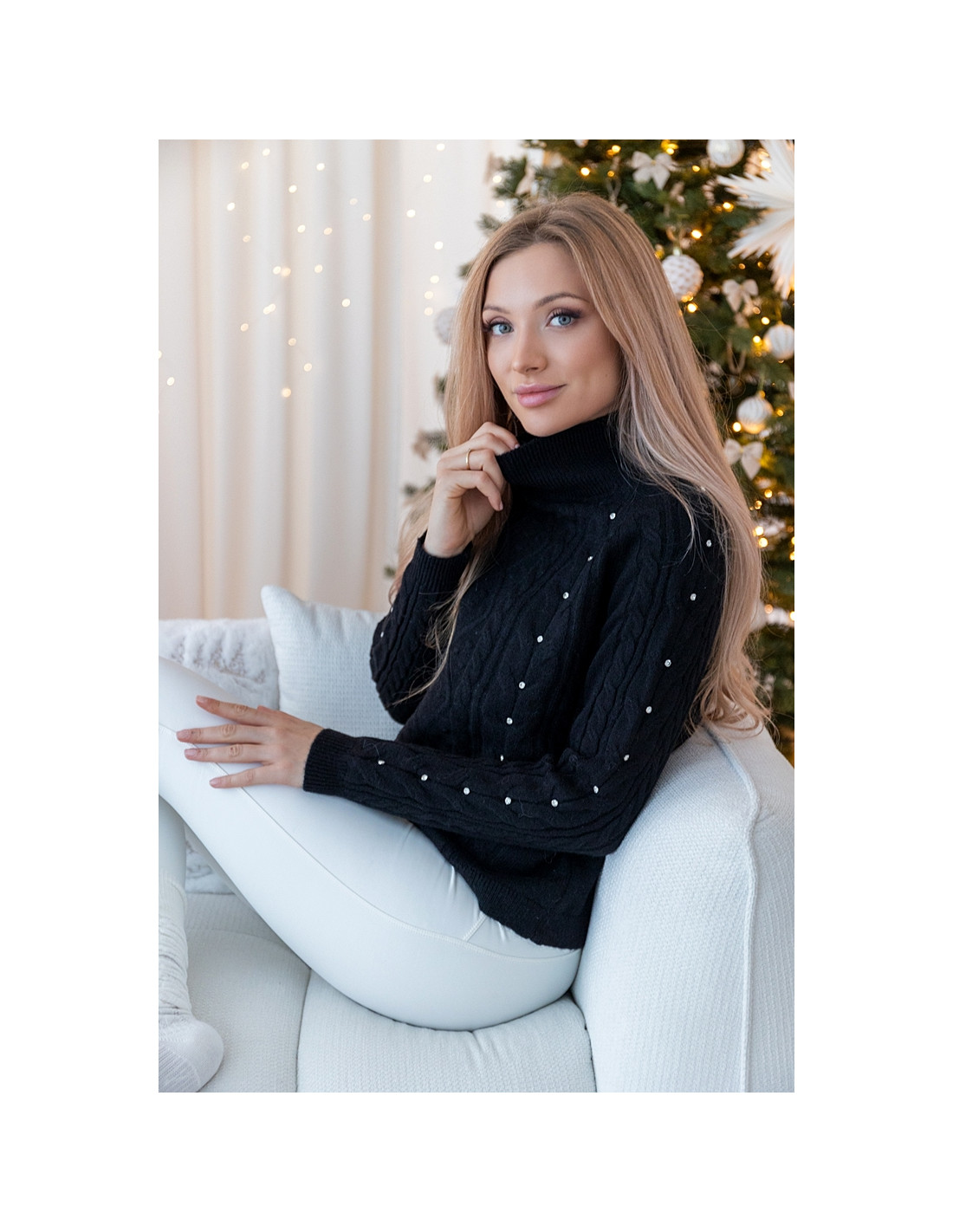Ciepły sweter o klasycznym, warkoczowym splocie z subtelnym zdobieniem w postaci drobnych perełek umieszczonych na przodzie i rękawach. Miękki, ciepły i przyjemny w dotyku, z delikatnie wyższym golfem, który dodaje mu elegancji i zimowego charakteru. Idealny do białych spodni, spódnic, a także codziennych stylizacji w odcieniach nude. Świetny wybór na święta, zimowe spotkania i stylowy.