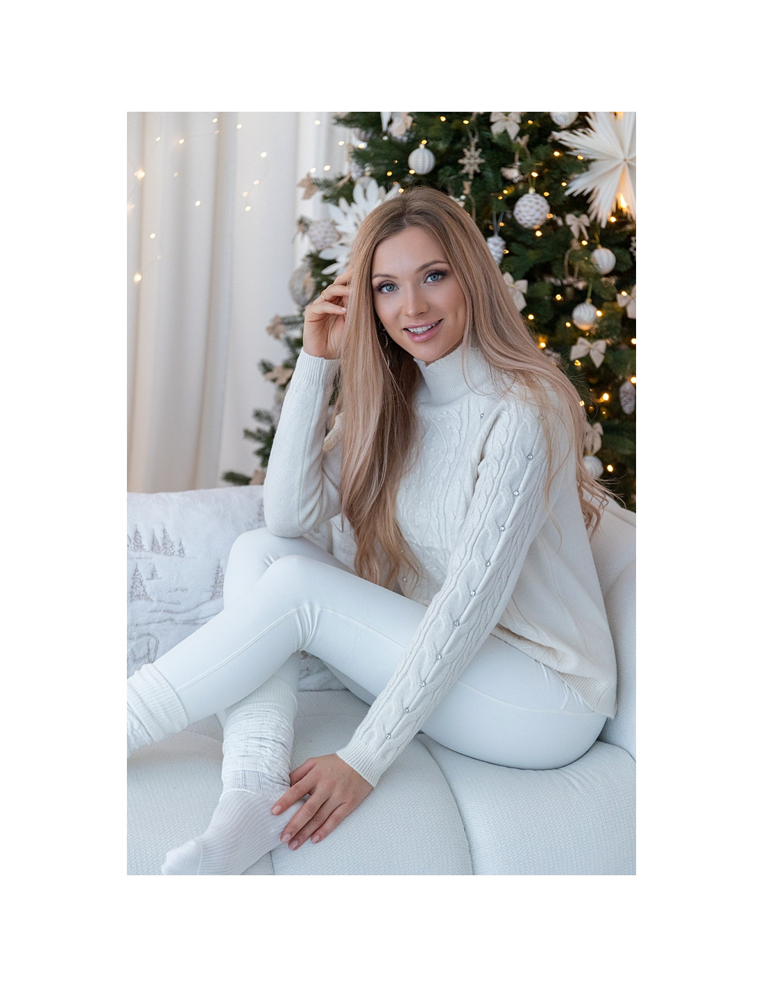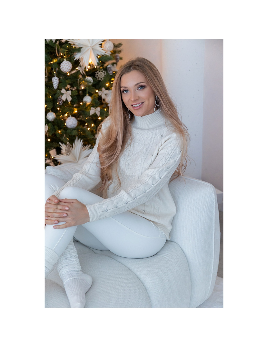 Ciepły sweter o klasycznym, warkoczowym splocie z subtelnym zdobieniem w postaci drobnych perełek umieszczonych na przodzie i rękawach. Miękki, ciepły i przyjemny w dotyku, z delikatnie wyższym golfem, który dodaje mu elegancji i zimowego charakteru. Idealny do białych spodni, spódnic, a także codziennych stylizacji w odcieniach nude. Świetny wybór na święta, zimowe spotkania i stylowy.