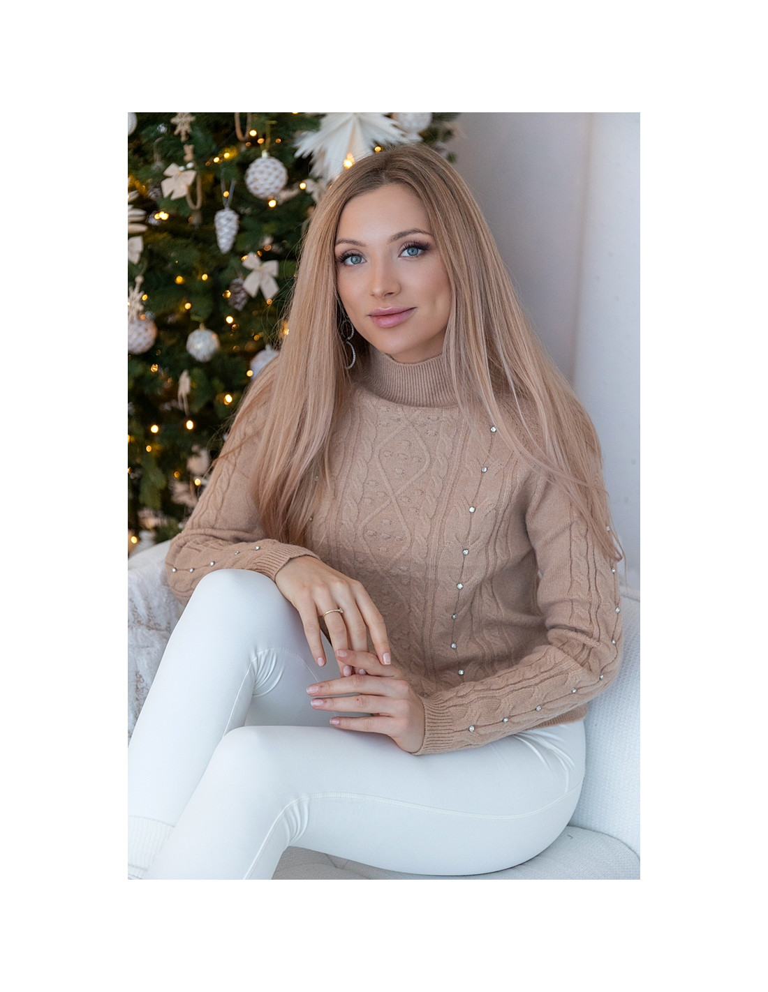 Ciepły sweter o klasycznym, warkoczowym splocie z subtelnym zdobieniem w postaci drobnych perełek umieszczonych na przodzie i rękawach. Miękki, ciepły i przyjemny w dotyku, z delikatnie wyższym golfem, który dodaje mu elegancji i zimowego charakteru. Idealny do białych spodni, spódnic, a także codziennych stylizacji w odcieniach nude. Świetny wybór na święta, zimowe spotkania i stylowy.