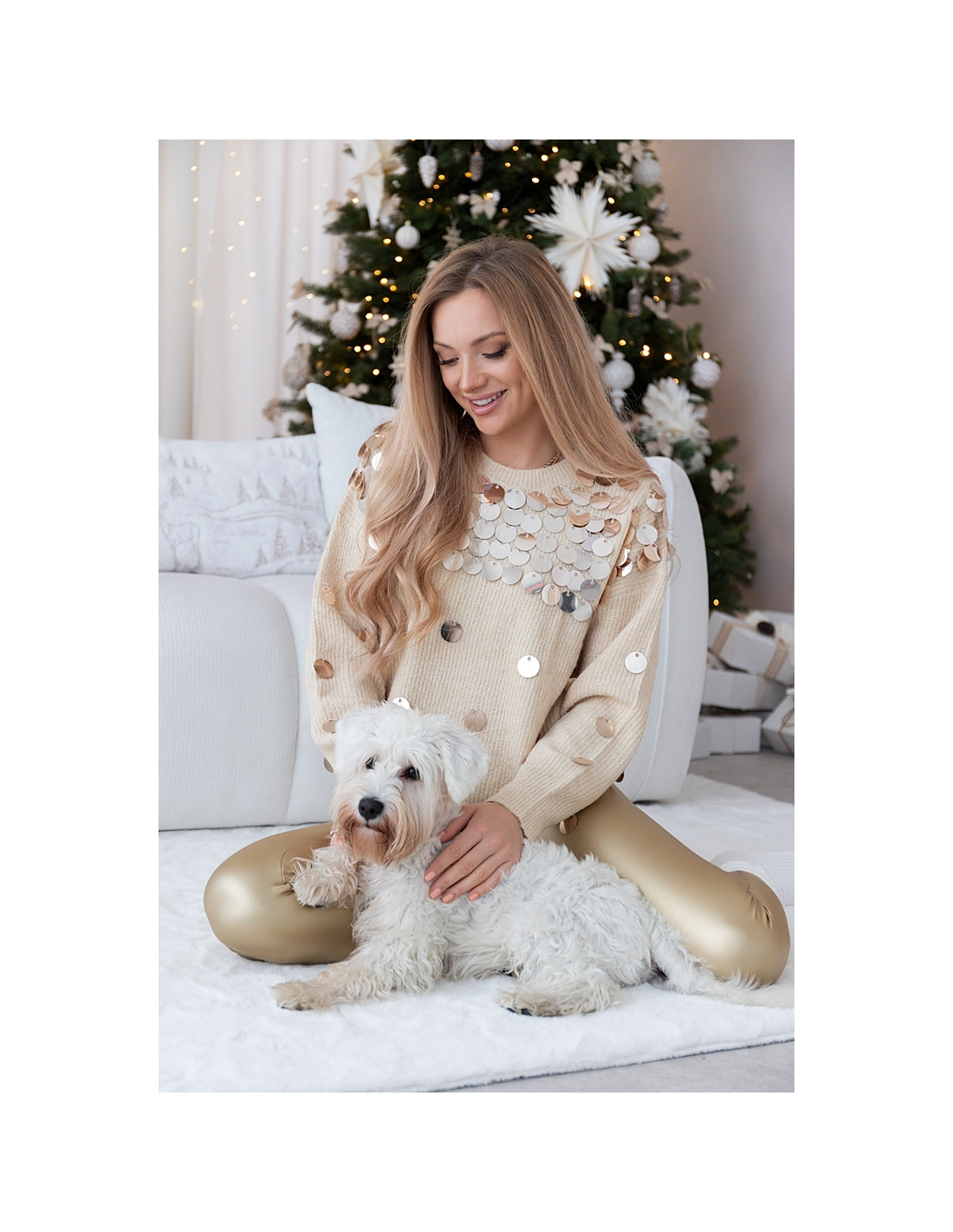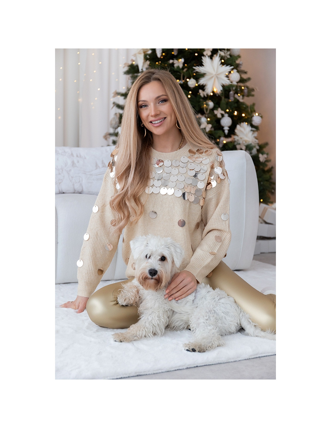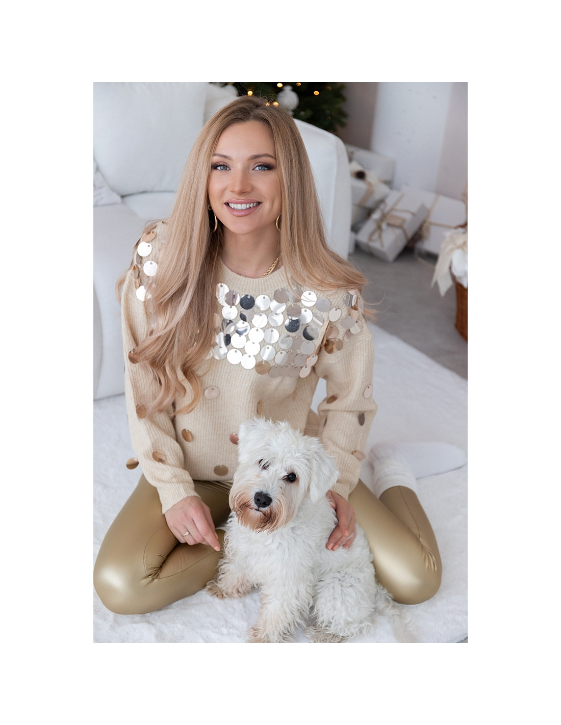 Beżowy sweter w wersji glamour – ozdobiony dużymi, błyszczącymi cekinami, które tworzą efekt prawdziwego „wow”. Miękki, ciepły i elastyczny, a jednocześnie idealny na świąteczne stylizacje, zimowe imprezy, sylwestra czy wieczorne wyjścia. Łączy wygodę swetra z efektem imprezowego topu – nie potrzebujesz biżuterii, on sam jest całą stylizacją. Świetnie wygląda do spódnic, legginsów, skórzanych spodni czy satyny.