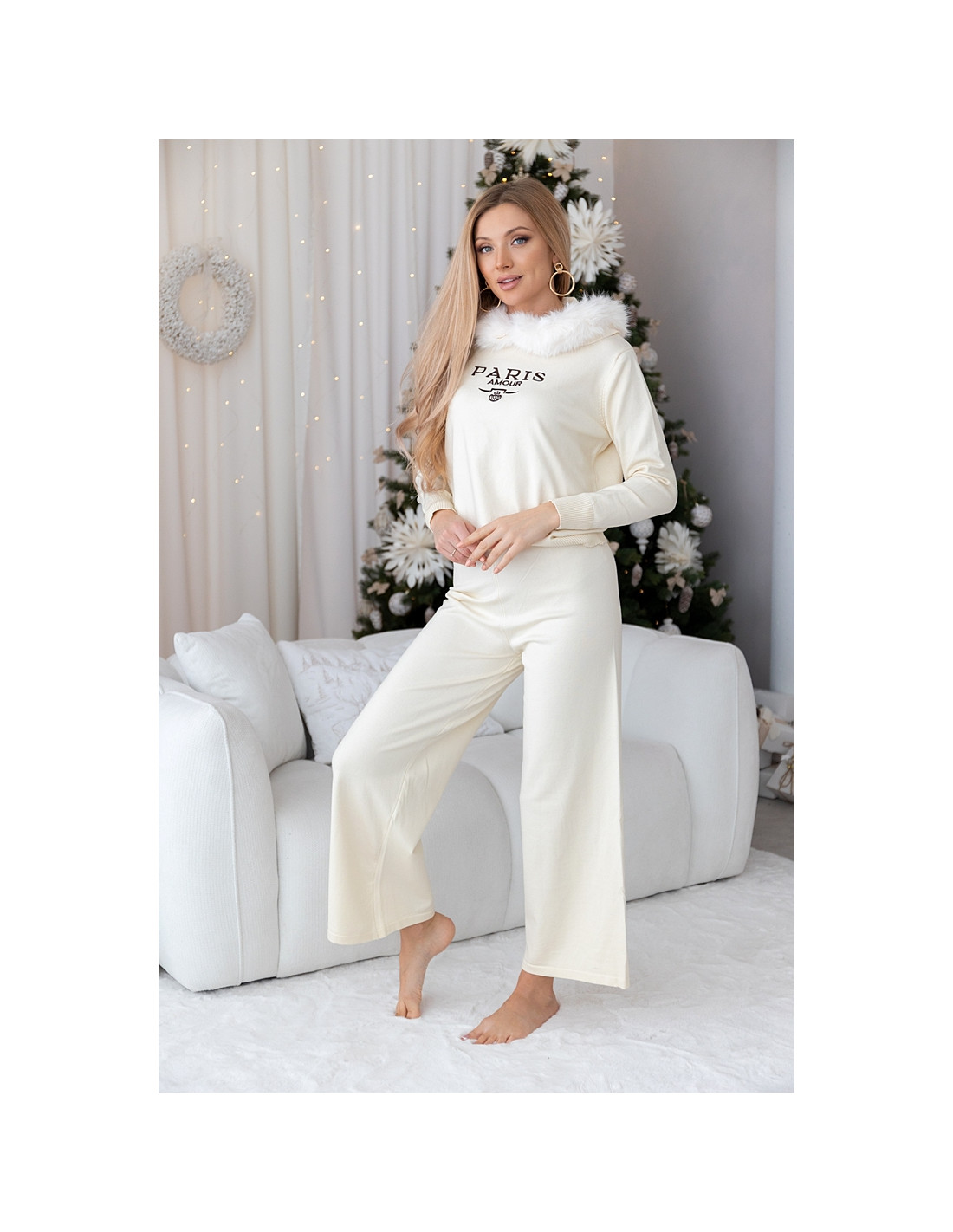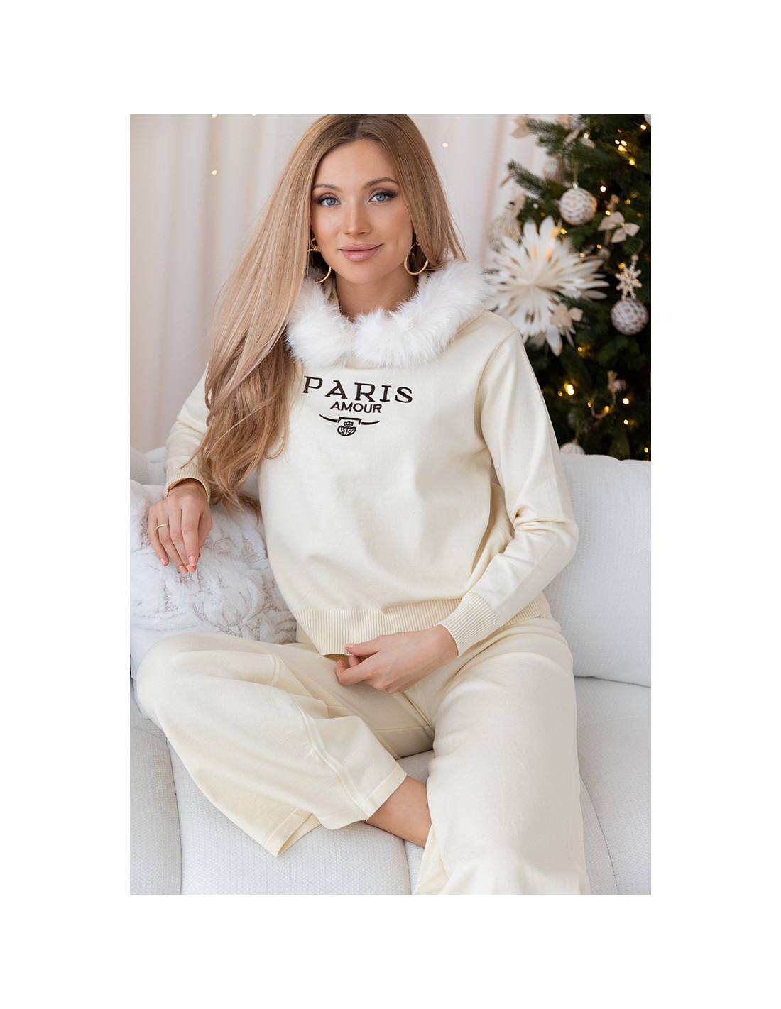Wykonany z miękkiej, elastycznej dzianiny, zapewnia komfort i swobodę ruchów. Bluza z napisem Paris Amour i efektownym kapturkiem z eko futerka dodaje całości elegancji. Spodnie z szeroką nogawką pięknie się układają – idealny zestaw na co dzień i leniwe, zimowe wieczory.