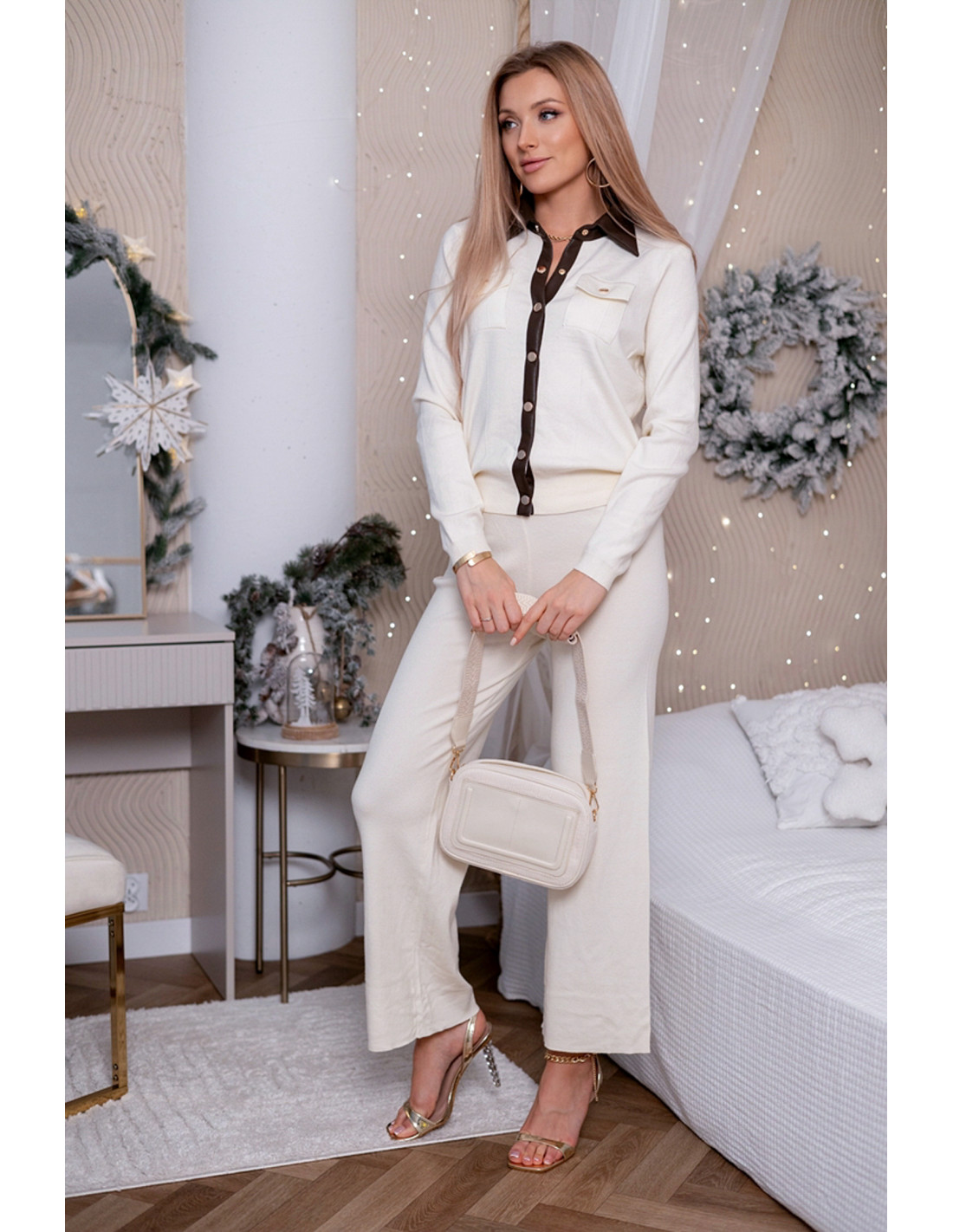 Górna część zestawu to sweterek zapinany na guziki, wyróżniający się kontrastową wstawką z ekoskaju i kołnierzykiem, dzięki czemu całość wygląda elegancko i bardzo modnie. Dwie kieszonki z przodu dodają mu charakteru i podkreślają casual-chicowy styl.