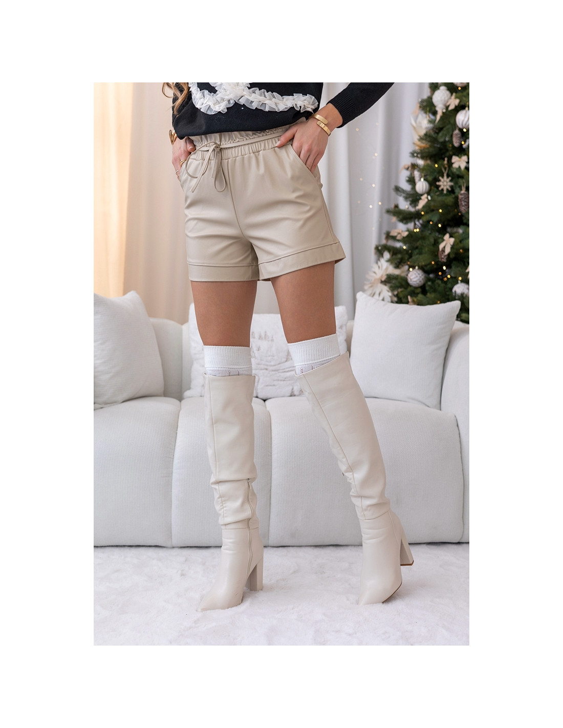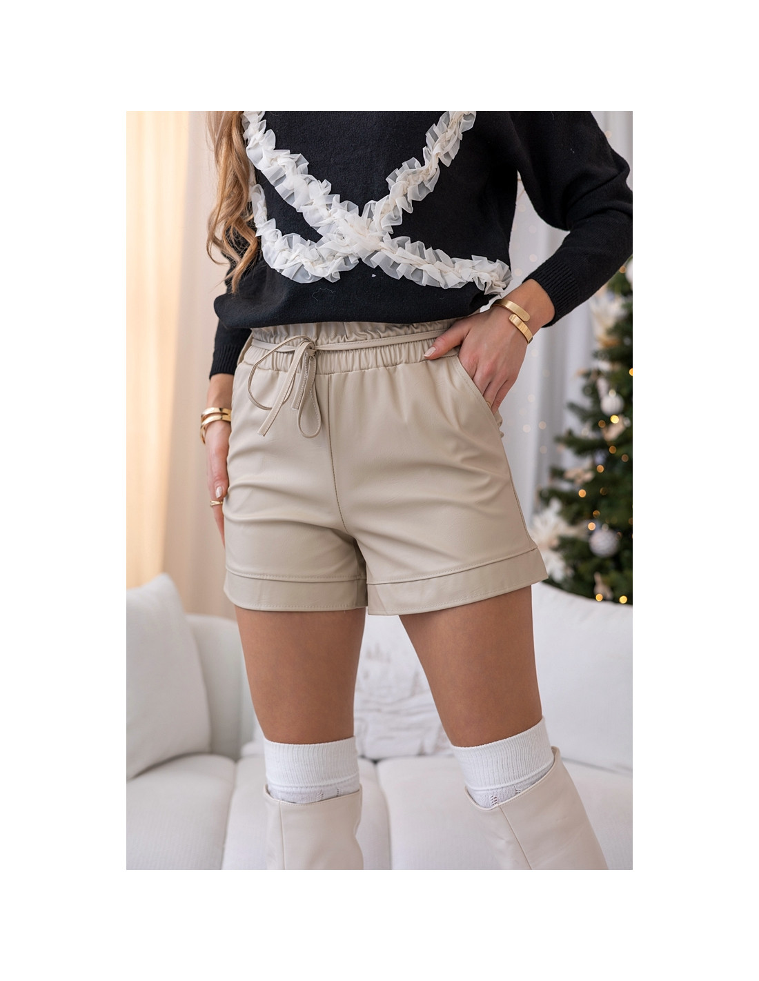 Stylowe szorty, wykonane z miękkiej imitacji skóry o eleganckim, matowym wykończeniu. Elastyczna gumka w pasie oraz wiązanie gwarantują idealne dopasowanie i maksymalny komfort noszenia. Model pięknie podkreśla nogi, zachowując przy tym swobodę ruchu. Świetnie komponuje się zarówno z ciepłymi swetrami, jak i bardziej dopasowanymi topami, tworząc modne, nowoczesne stylizacje — również zimą. To must-have dla fanek kobiecego stylu z odrobiną pazura.