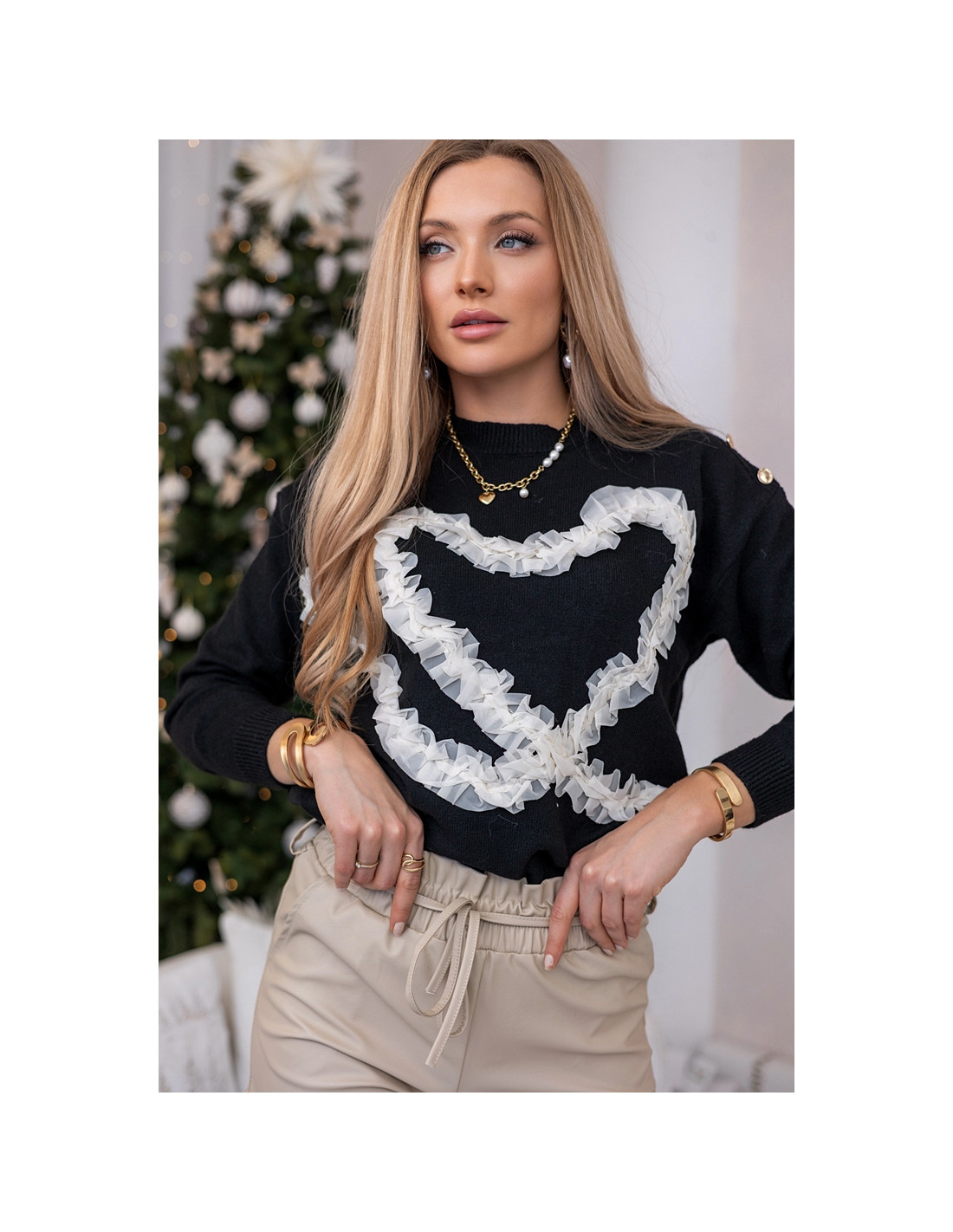 Uroczy i stylowy sweter, który zachwyca oryginalną aplikacją w kształcie serca wykonaną z marszczonej, delikatnej tkaniny. To połączenie miękkiej dzianiny i dekoracyjnych detali tworzy wyjątkowy efekt, idealny na sezon zimowy i świąteczne stylizacje.