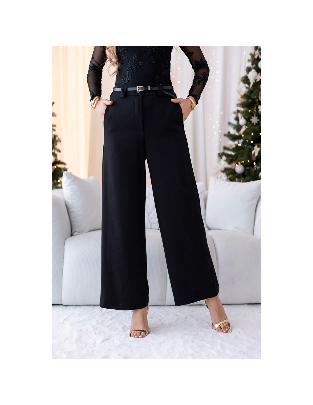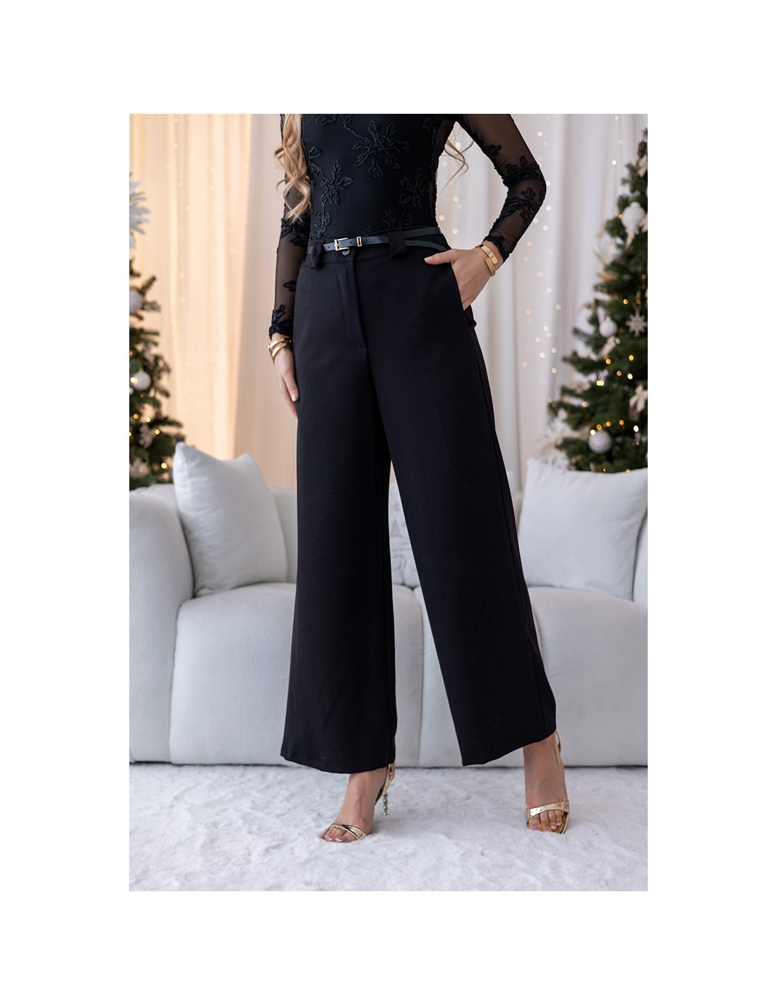 Model posiada wysoki stan, zapinany pas oraz dołączony elegancki pasek, który podkreśla talię i dodaje całości klasycznego charakteru. Boczne kieszenie zwiększają wygodę, jednocześnie zachowując minimalistyczny i ponadczasowy wygląd.