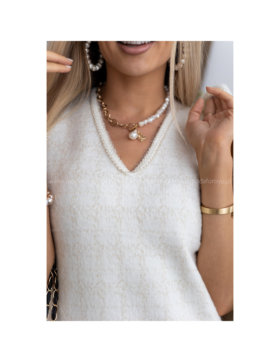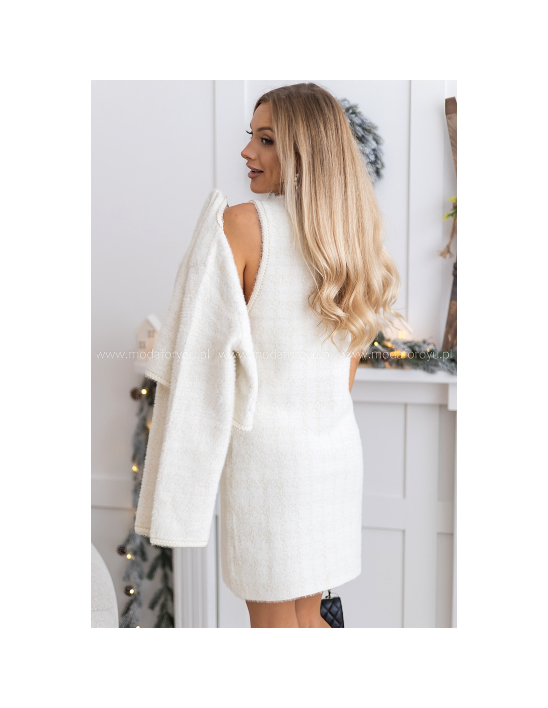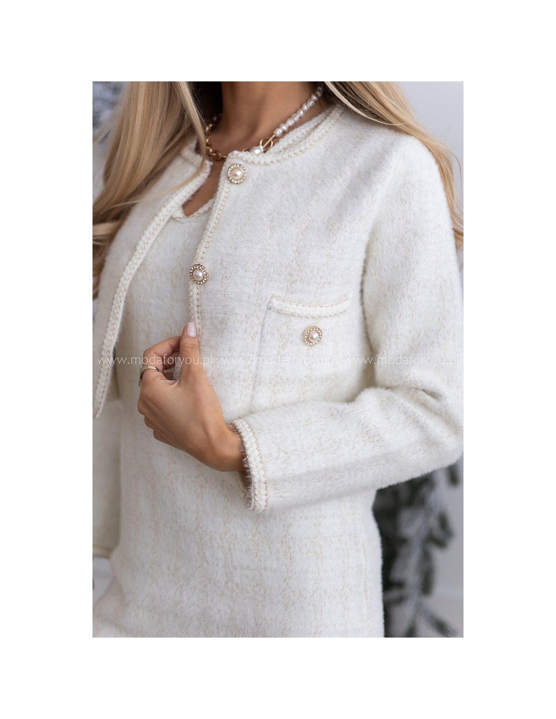 Piękny komplet składający się z prostej sukienki i sweterka na guziczki, pięknie wykończenia. Złote detale i obszycia, delikatny wzór. Materiał premium, bardzo wygodny i swobodny.