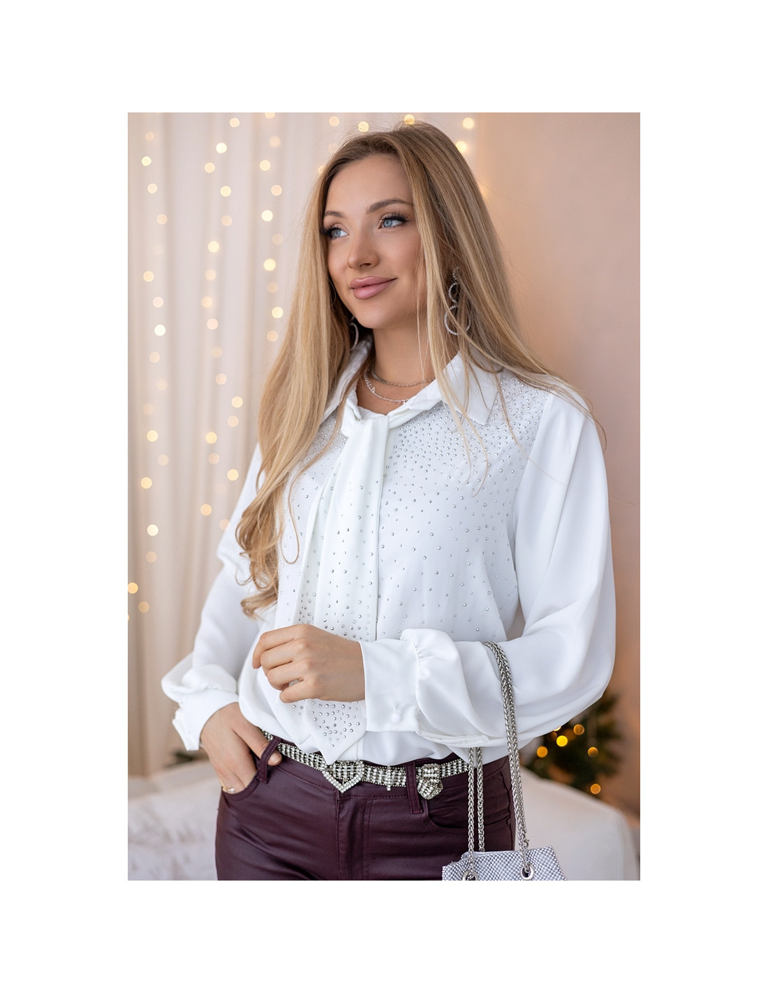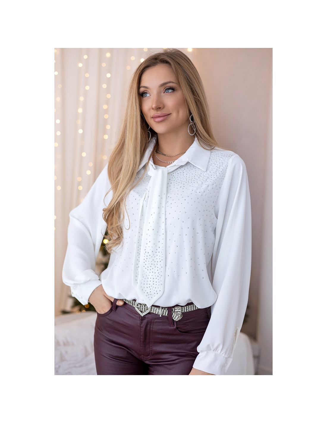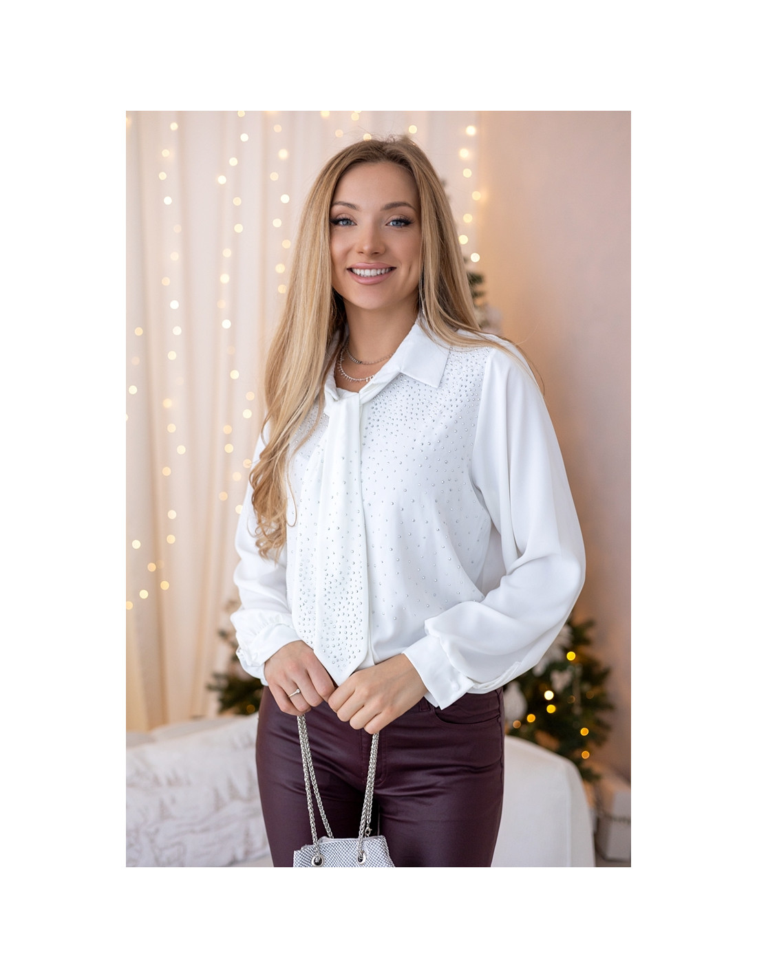 Elegancka koszula o kobiecym, subtelnie zdobionym fasonie, idealna na wyjątkowe okazje i stylowe, codzienne zestawy. Góra oraz przód dekorowane są drobnymi cyrkoanimii, które dodają całości delikatnego błysku. Miękki, lekko lejący materiał pięknie układa się na sylwetce, a klasyczny kołnierzyk i mankiety nadają koszuli ponadczasowego charakteru. Luźniejszy krój zapewnia wygodę i swobodę, pozwalając nosić ją zarówno do eleganckich spodni, jak i spódnic. To model, który łączy szyk, lekkość i uniwersalność.